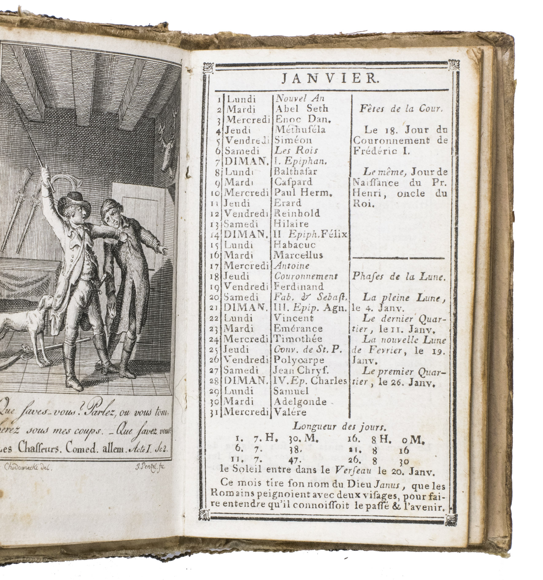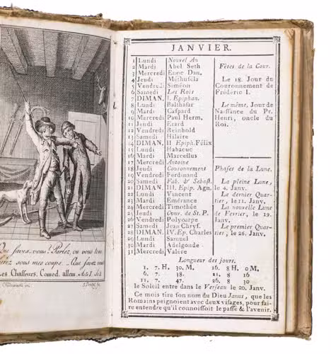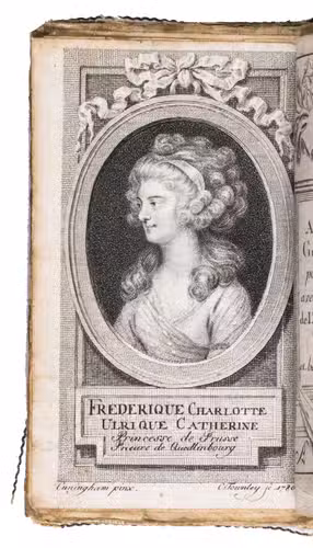 Rare almanac for 1787, from a series of Berlin almanacs that appeared under various titles from 1769 to 1813. The almanacs could be acquired with etched plates illustrating the 12 months by the greatest German book illustrator of the 18th century Daniel Chodowiecki. He was director of the Berlin Academy of Art and worked for the Berlin Genealogischer Kalender, or Almanac Généalogique from 1770 until his death in 1801, as well as for other almanac publishers. Chodowiecki was given free rein to choose the subjects of the 12 plates, always in the calendar section of the annual almanacs. He often chose popular plays; in the present work his 12 illustrations depict scenes from the play Die Jäger (Chasseurs) by the German actor and playwright August Wilhelm Iffland (1759-1814), published in 1785. The subject of each illustration is explained in a 7-page "Explication des estampes". Also included is an engraved portrait of the young Princess Frederique Charlotte Ulrique Catharine of Prussia (1767-1820), who would become Duchess of York and Albany through her marriage to Prince Frederick, King Georges second son in 1791. The folding map depicts the projected route of what is today known as the Kiel canal, completed in 1784, which joints the North Sea to the Baltic.