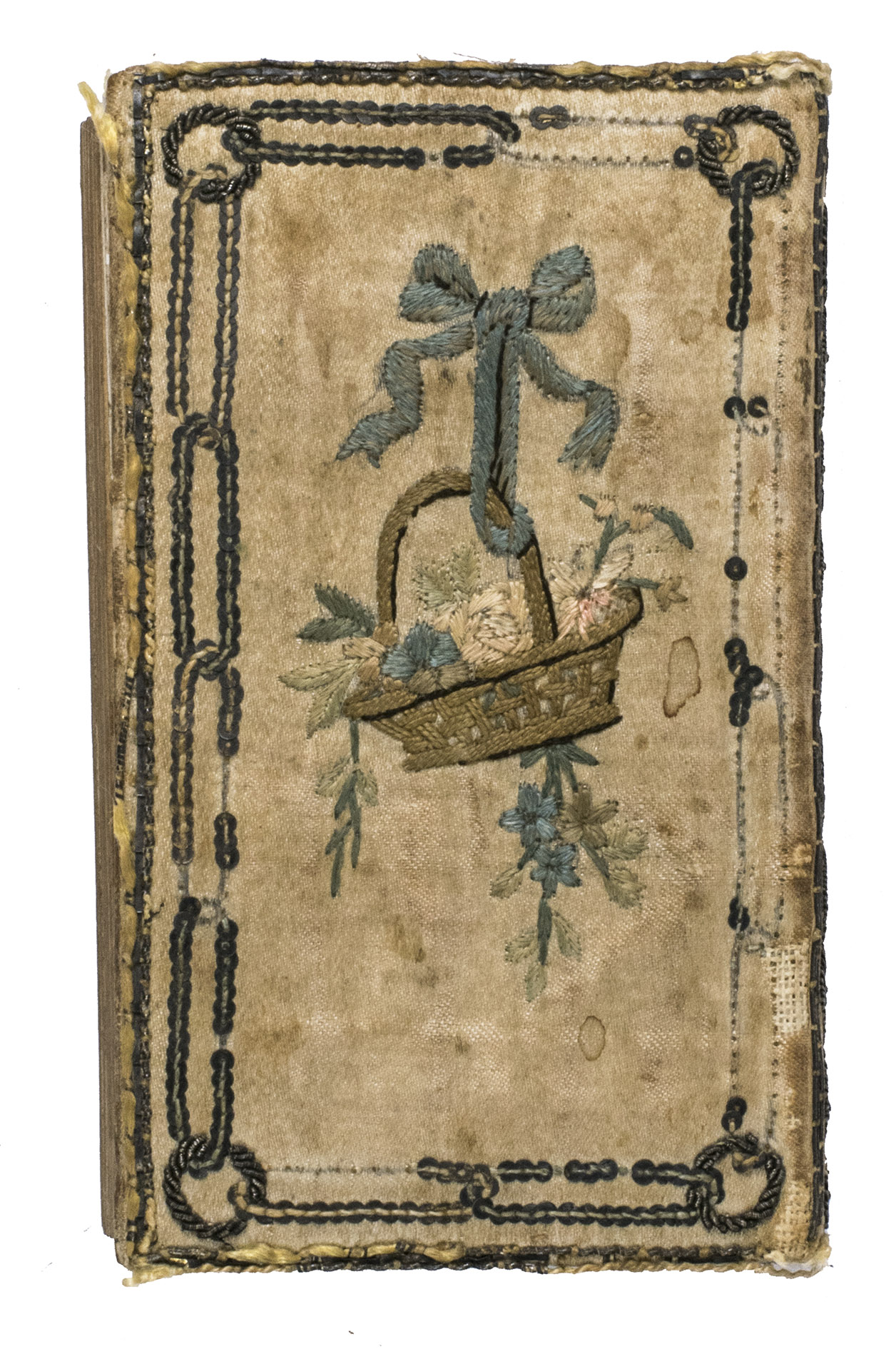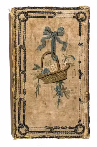 Berlin, George Jacques Decker, [1786]. 24mo (10.7 x 6.2 cm). With an engraved portrait of Princess Frederique of Prussia by C. Tounley after Cuningham, dated 1786 as a frontispiece. This is printed on one double-leaf with the engraved title page. Further with a folding engraved map (13 x 18.2 cm) by D.F. Soltzmann after C.L. Oesfeld (1785) showing the projected Kiel Canal, 12 numbered etchings illustrating the 12 months of the calendar by Daniel Chodowiecki. Text of all pages printed within a frame with small corner pieces. Contemporary German embroidered binding: ivory silk over boards, sides purled with (blackened) silver threat, a double row of silver sequins enclosing on the front cover the embroidered year "1787" within a wreath of silver thread hanging on an embroidered knot and on the back cover a basket with colored flowers also hanging on a knot, spine ornamented with silver thread, gilt edges. [240] pp.