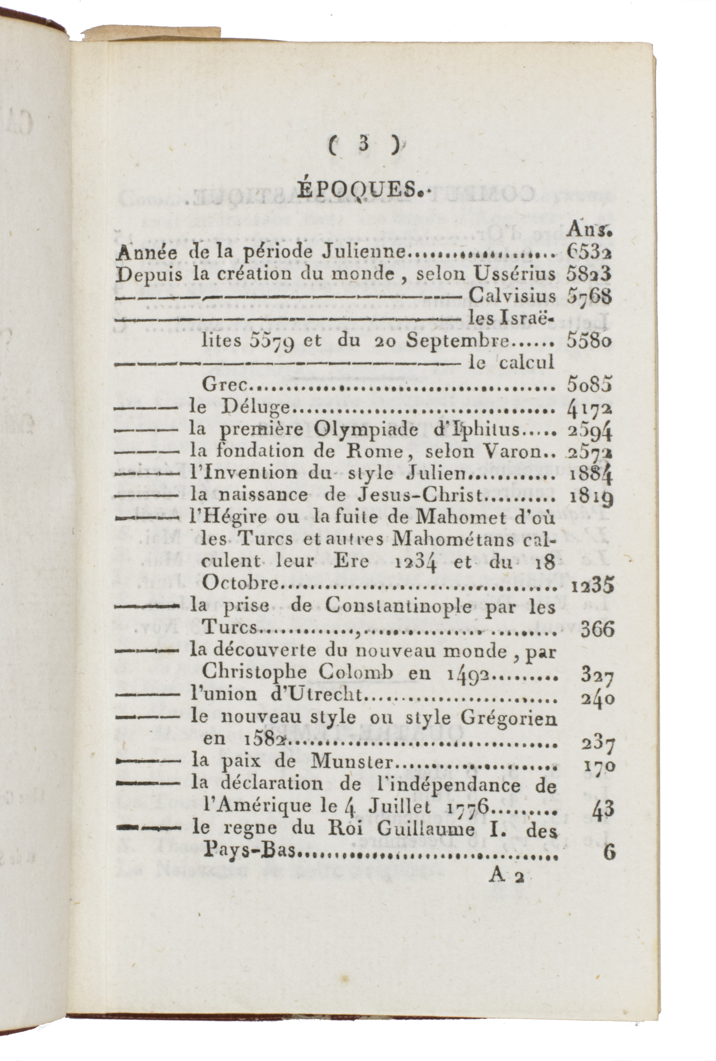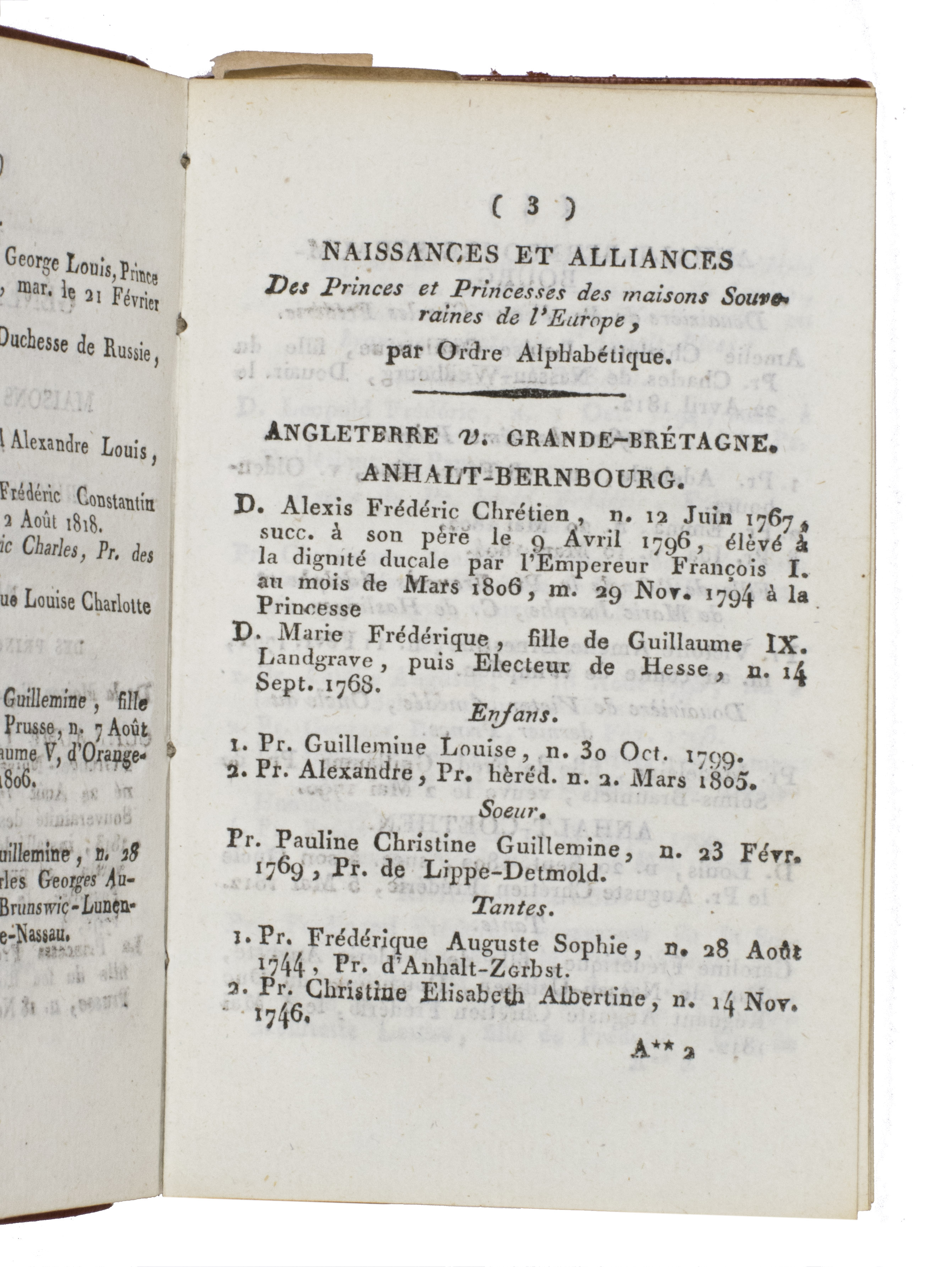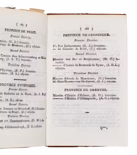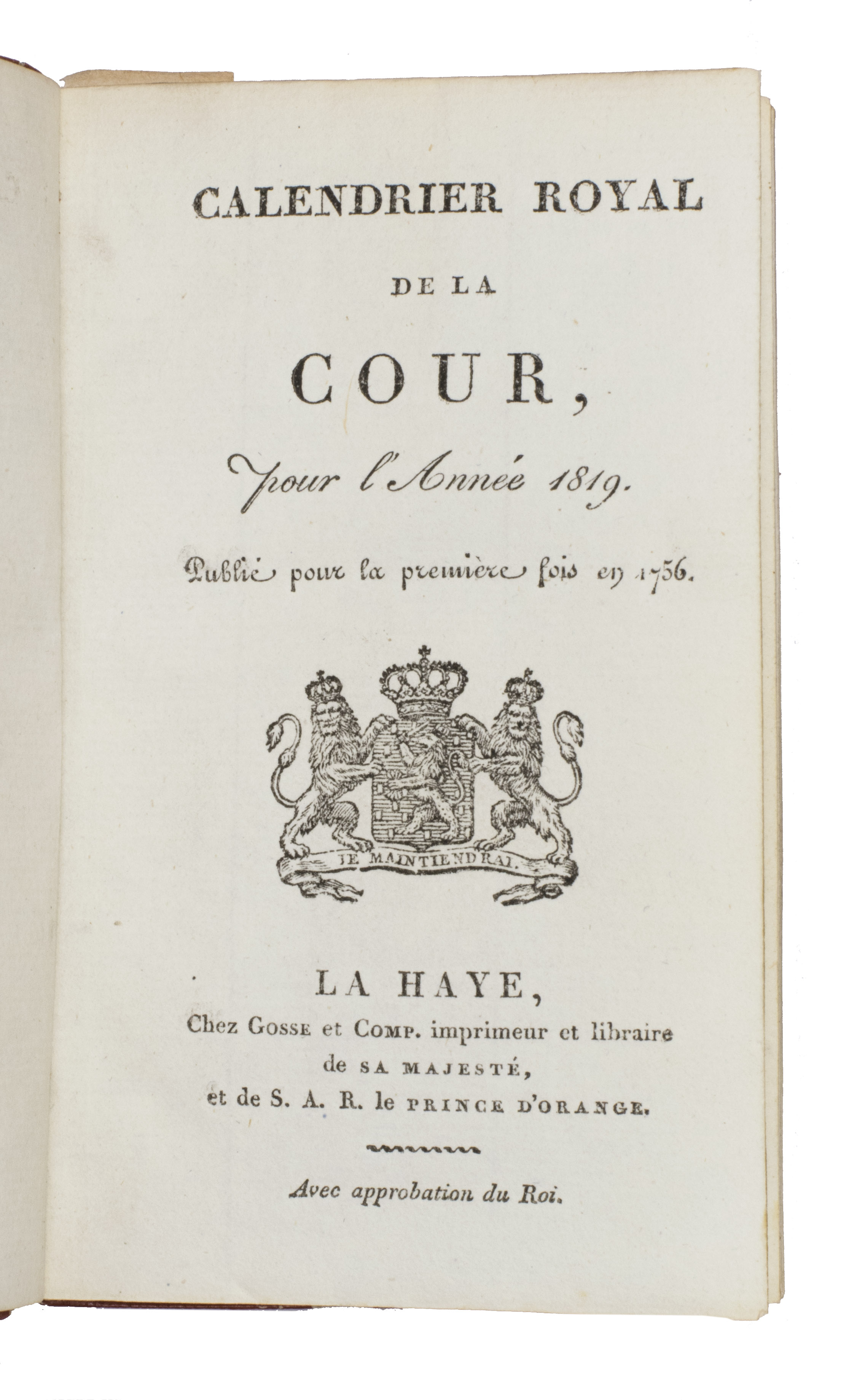 Rare official almanac of the Kingdom of the Netherlands printed by the "imprimeur et libraire de Sa Majesté" for the year 1819 in French, one of the two official languages of the country at the time. Apart from the parts usually present in almanacs (calendar, eclipses, postal rates, coins, etc.), the Calendrier Royal contains a complete overview of the members of the royal family, the official functions of the court and the civil service of the Dutch Kingdom, the government, and the Dutch ambasasdors in other countries, with the names of all the officials and office holders. We have not been able to find the present edition anywhere else.