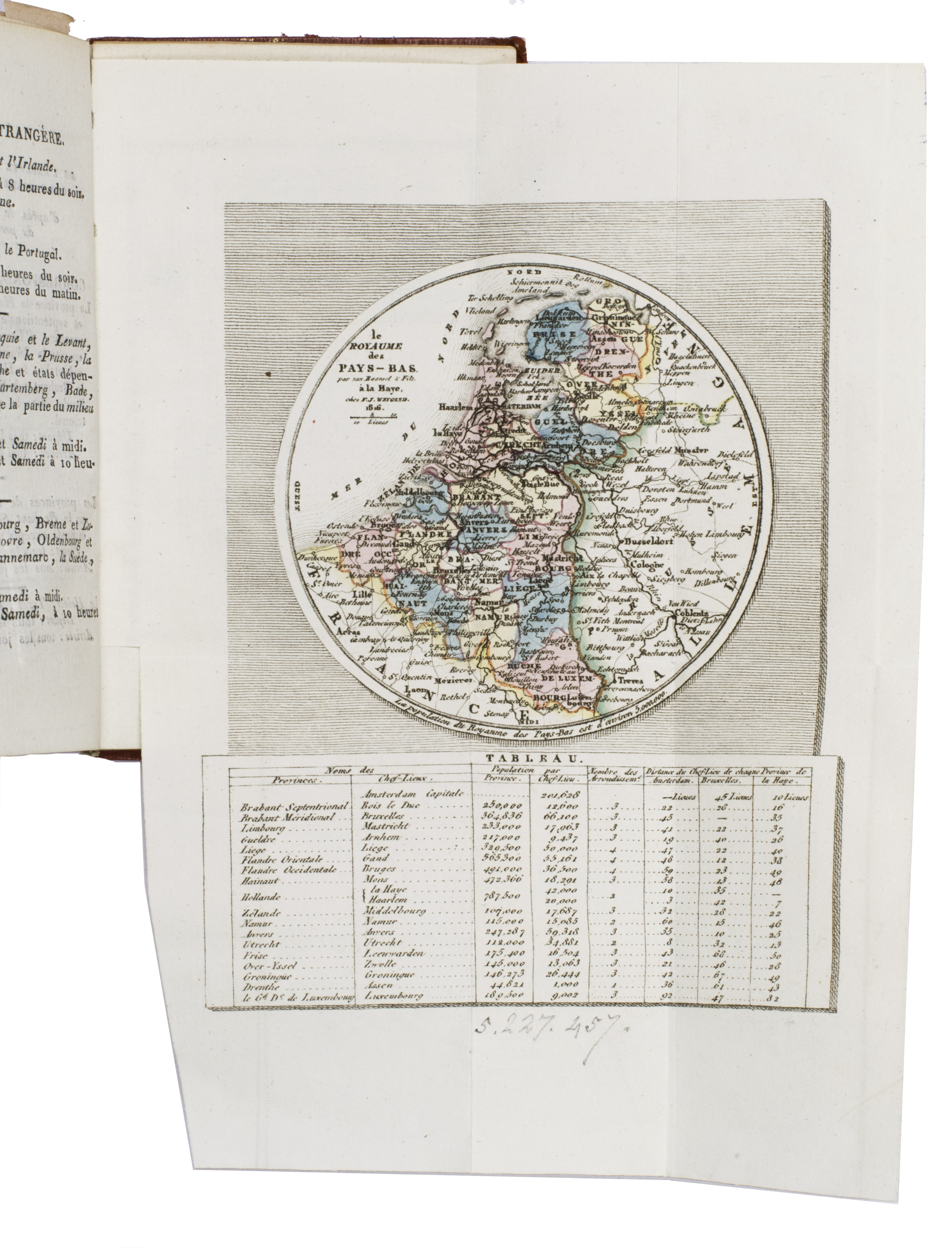The Hague, Gosse et Comp., [1818]. 12mo. With the coat of arms of the Dutch Kingdom on the title page, and a folding engraved hand-coloured map of the Dutch Kingdom in a roundel by Basnel & son, with a list of all the provinces of the Kingdom with the numbers of their populations, and distances from Amsterdam, The Hague, and Brussels. Contemporary gold-tooled imitation long-grained red Morocco, with an ornamental border on both boards, gilt edges. The work is housed in the original matching slipcase. 84, 192, 55, [1] pp.