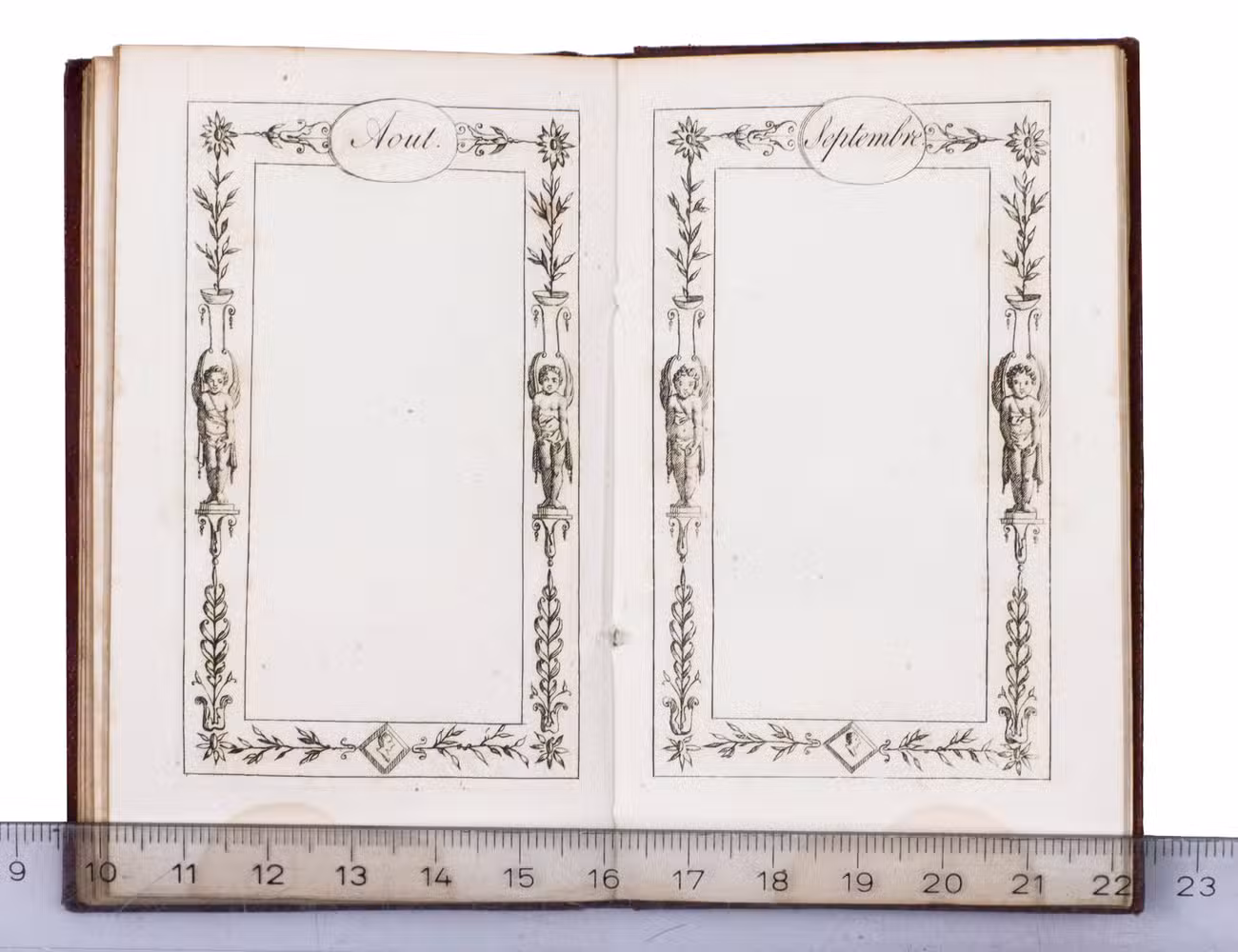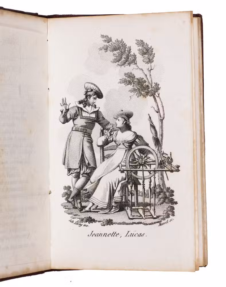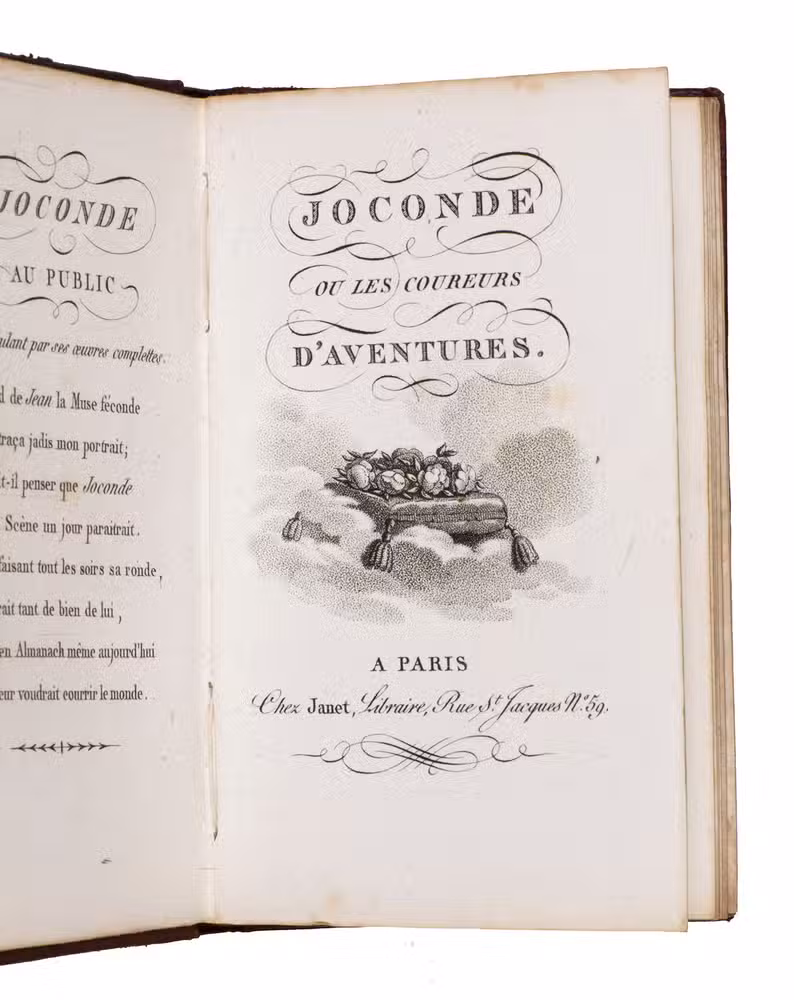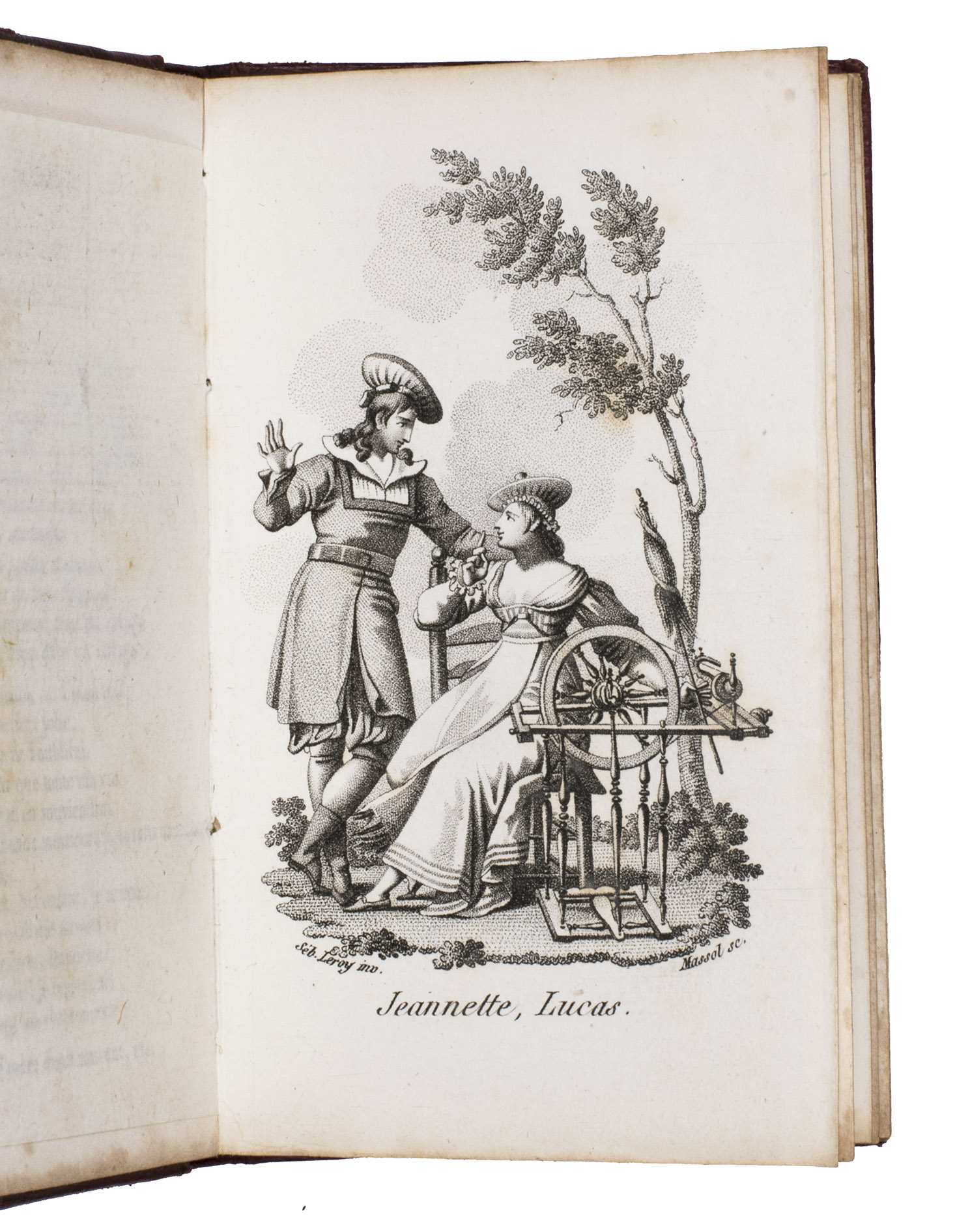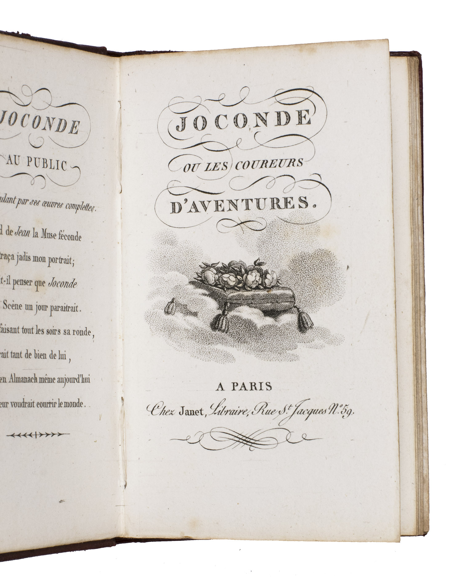 Beautiful almanac for ladies, here published for the first time, inspired by the great success of the Paris opéra comique of the same name, written by Nicolas Isouard (1775-1818). Consequently, Joconde contains a collection of the most popular songs from the musical, beautifully illustrated with engraved plates mostly of stage characters singing duets. The second part, Petit souvenir, consists of the calendar and blank leaves for each day of the week and each month, for annotations. Grand-Carteret lists only this one volume of the almanac, but he mentions that a Monsieur Weckerlin (possibly the composer Jean-Baptise Weckerlin) possessed a copy that was dated 1821.