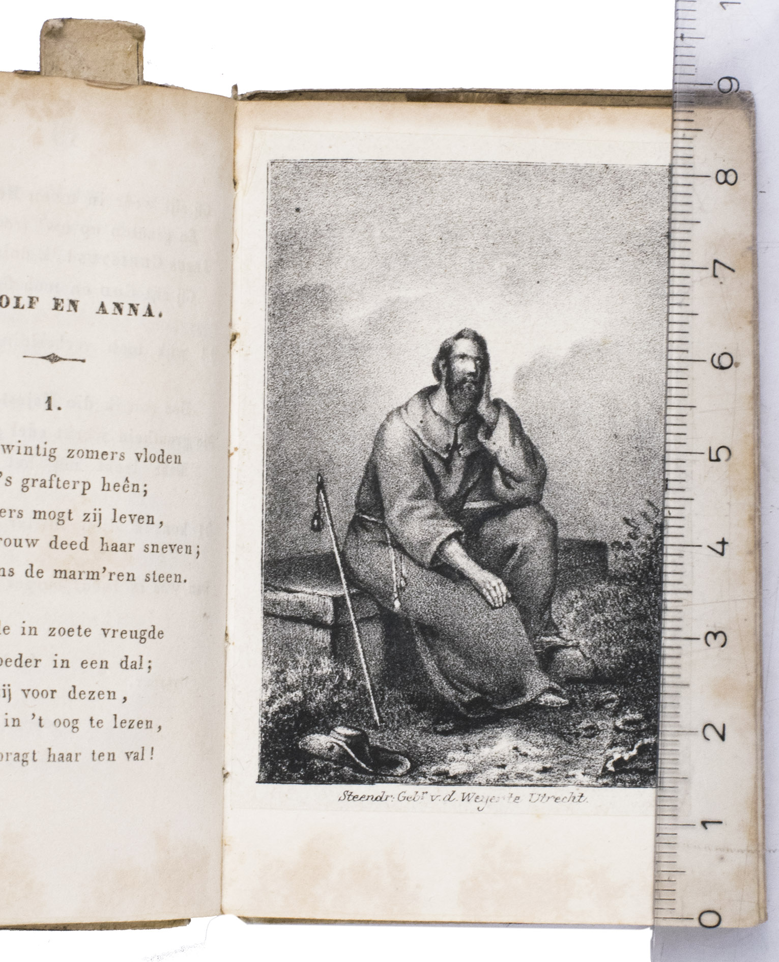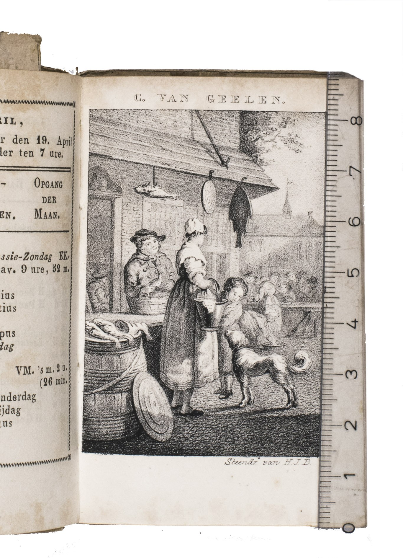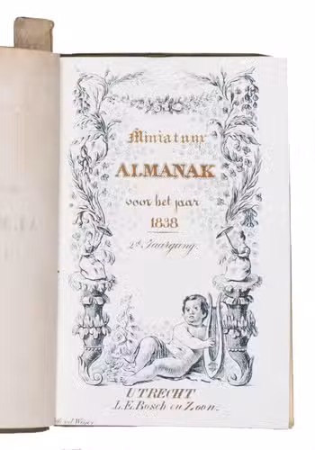 Second volume of a fine series of miniature almanacs, beautifully illustrated. The work aims to present young literary talent to the public and contains songs and poems by both new and more established Dutch authors, including J.J.L. ten Kate, G. le Francq van Berkheij, D.G. den Beer van Portugael, and M.H. de Graaf. Special attention is asked for De dagen onzer Jeugd by J.E. Schut, and for two pieces by T.H. Bussingh van der Koog, a young deceased Leyden student. Also included are some poems in French by A. Clavareau, and two pieces of music, the first is a serenade with music by W. Broedelet and text by J.J.L. ten Kate, and the second is titled In het Album van L.E. Bosch door D. Soeterik. The almanac was published for 15 consecutive years, by various publishers.
