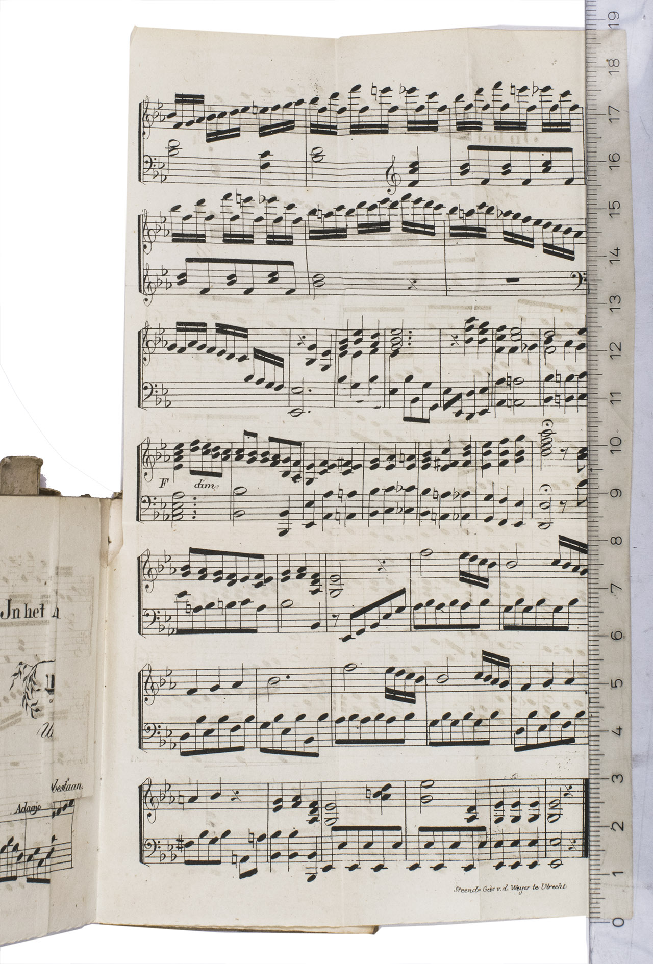 Utrecht, L.E. Bosch en Zoon, [1837]. 12mo. With a lithographed title printed in blue and gold, 4 full-page lithographed plates by H.J. Backer and by De Weijer at Utrecht, and 4 folding leaves with musical score. Original publisher's lithographed pink boards, gilt edges. 51, [2], 121 [5], V, [1 blank] pp.