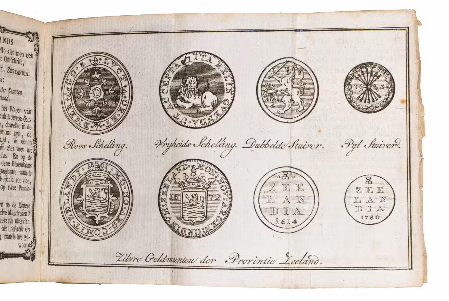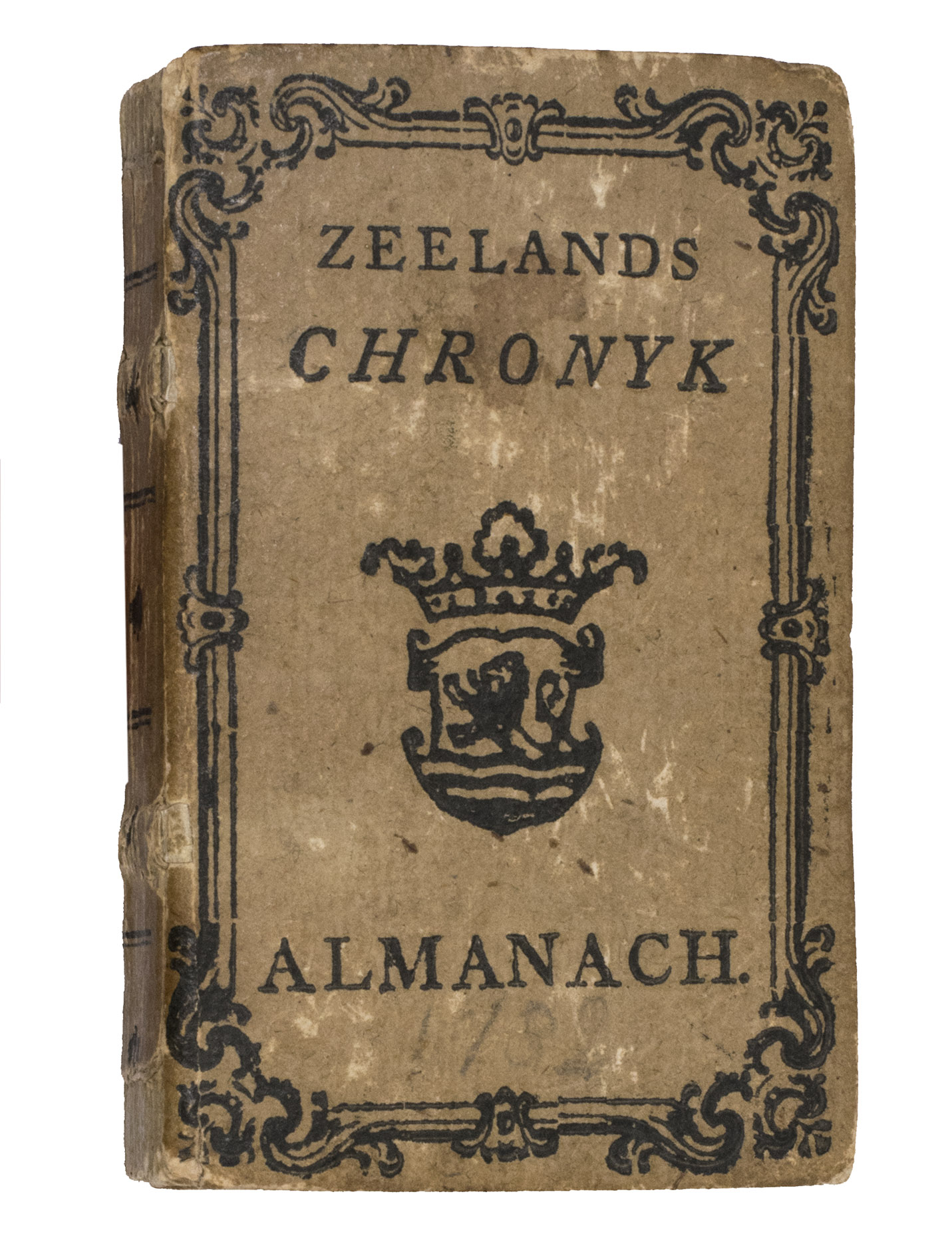 Separate volume of the famous Zeeland almanac teaching children the history of their province in a playful way, by means of questions and answers. Zeelands chronyk-almanach was published from 1777 to 1792, with each volume focussing on a separate aspect of Zeeland. The present volume describes the coins, which are depicted on the folding plates. It further includes the calendar, information on the tides, and the times of the closing of the gates in the various towns of the province, the dates of holidays and markets, the times of departure of the ferries, and an illustrated description of the Middelburg town hall. It also contains the fifth instalment of a chronicle of the history of Zeeland, which was published in parts in each volume.