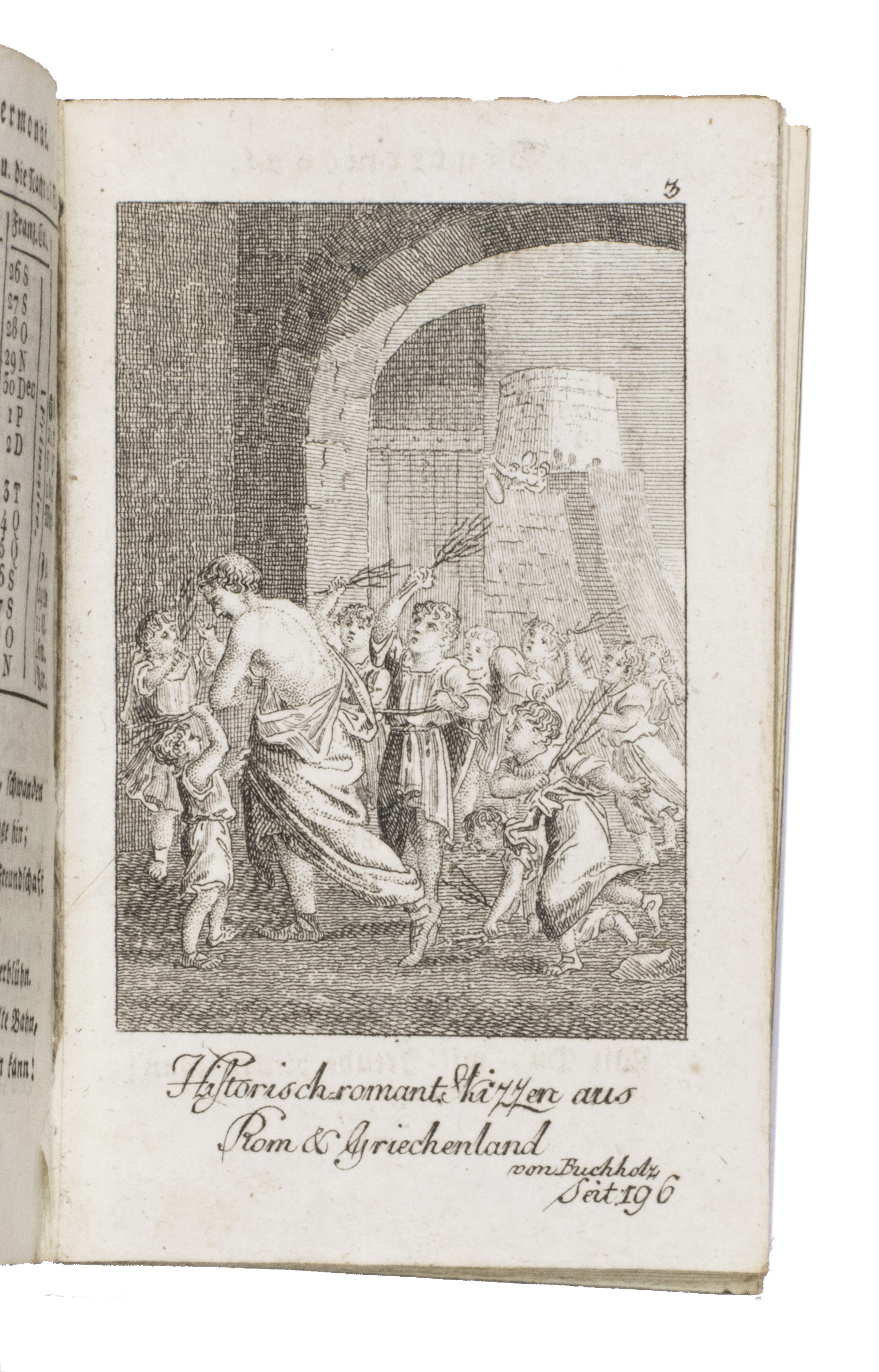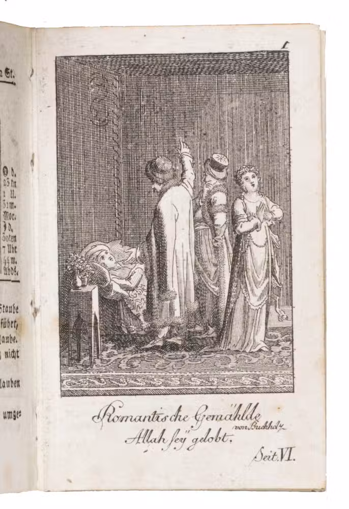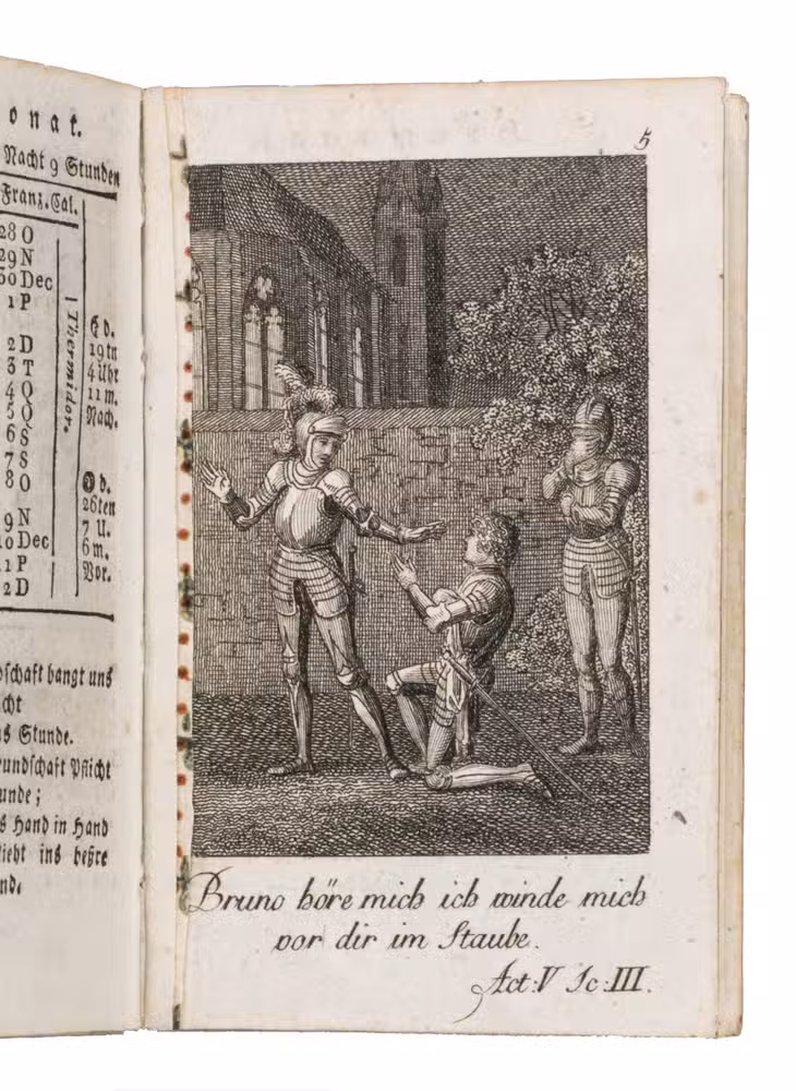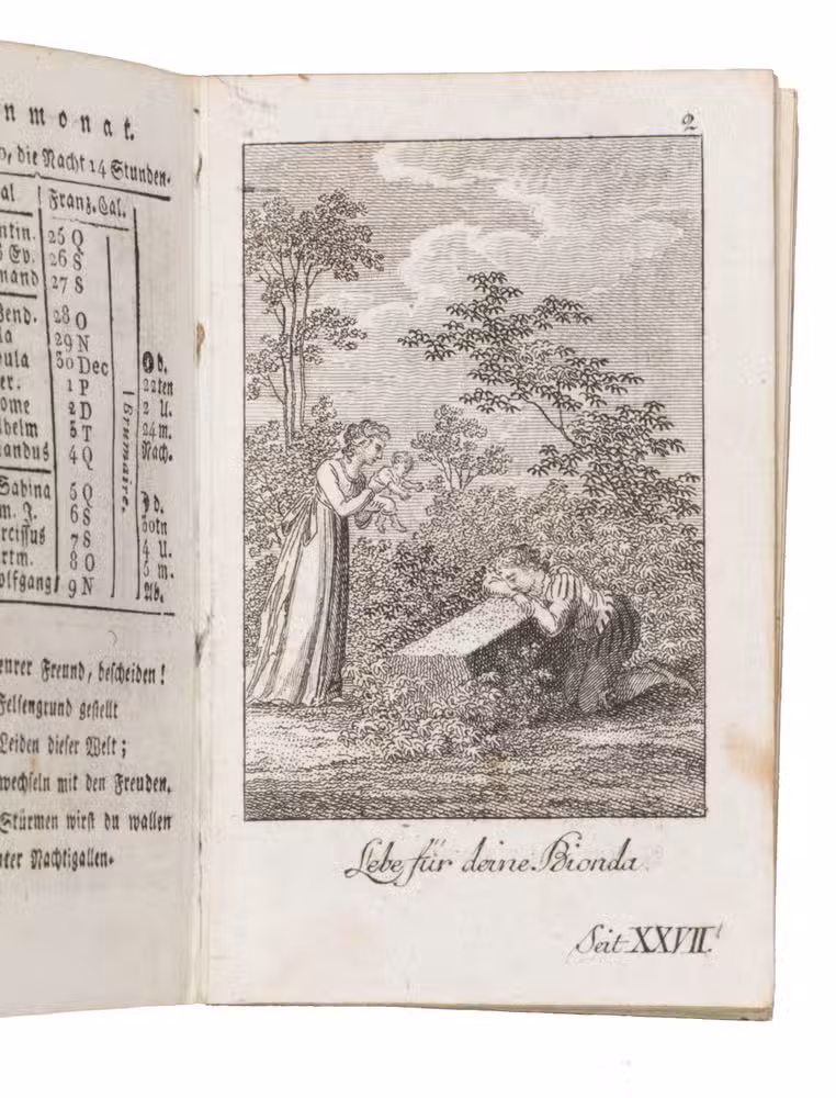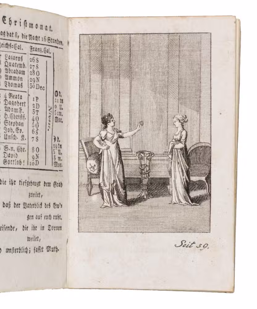 Fine illustrated German almanac, with a calendar, and literary contributions, including poetry, a story in prose, and several aphorisms. Most are signed only with initials, but two have been signed by Von Münchausen. Each month in the calendar is accompanied by a poem. Several of these are listed at the beginning, which means they were considered suitable to use in an Album Amicorum. The plates, not accompanied by explanatory texts, illustrate scenes from a theatre play, and show Romantic scenes after paintings by Buchhöltz.