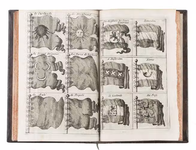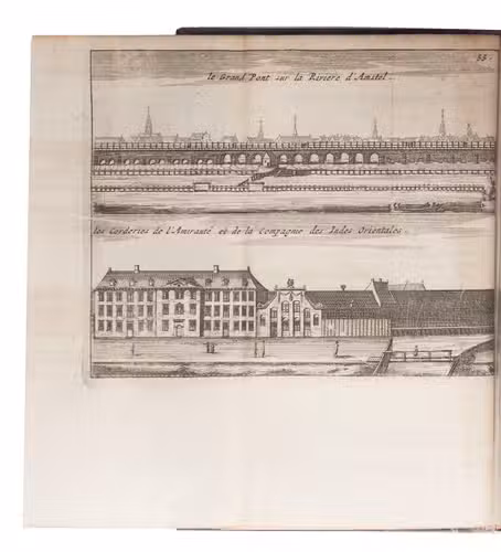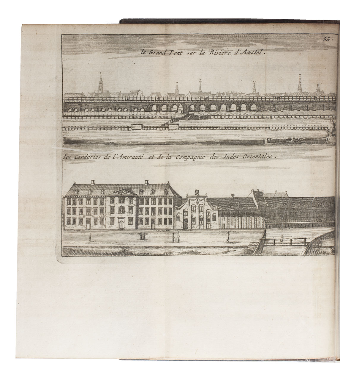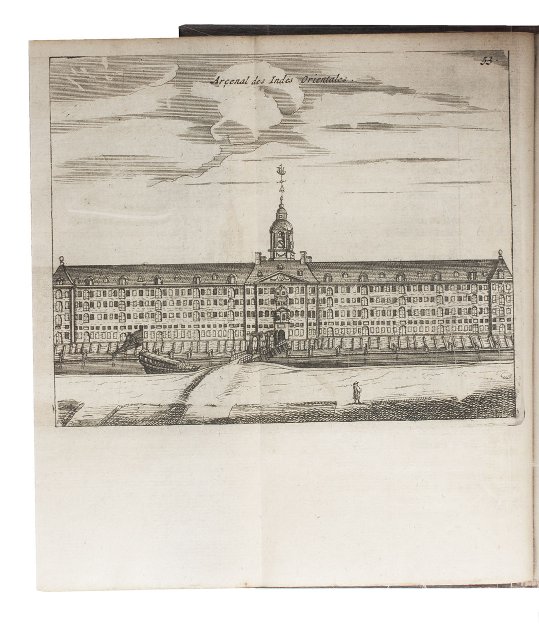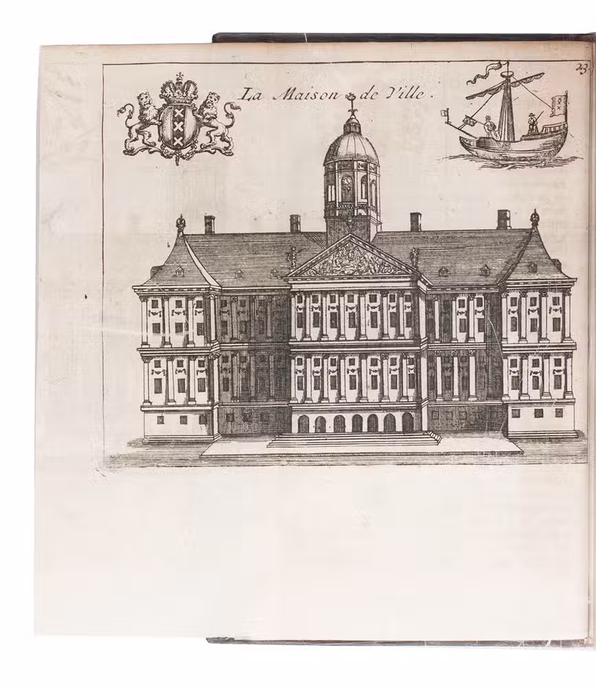 The plates show the most important buildings of the city, such as the city hall (now the Royal Palace of Amsterdam), the stock exchange, the main churches, the 4 city gates, the buildings of the Dutch East India Company (VOC), the Portuguese Synagogue, etc.; the plates with the flags are from Fokkens' L'Art de Blason.
