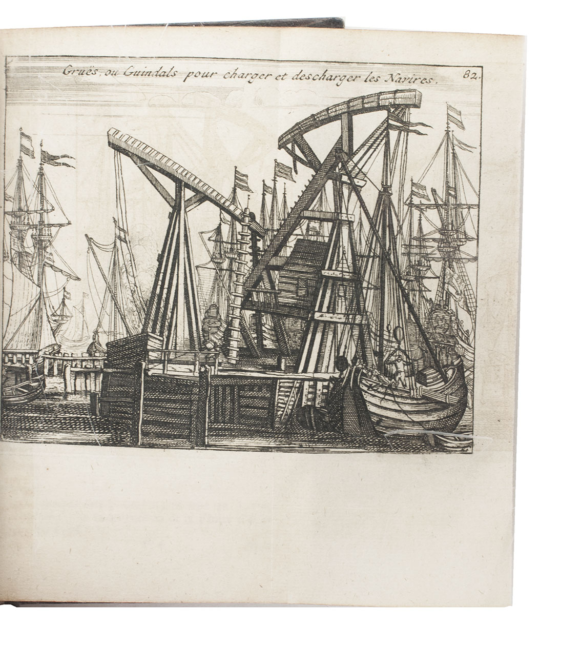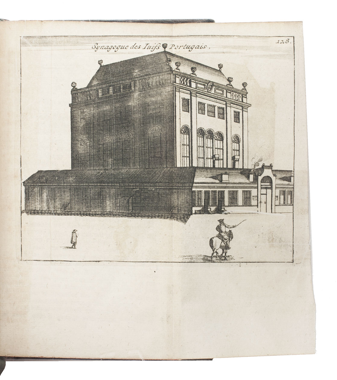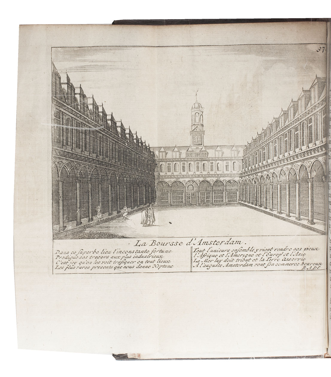 The plates show the most important buildings of the city, such as the city hall (now the Royal Palace of Amsterdam), the stock exchange, the main churches, the 4 city gates, the buildings of the Dutch East India Company (VOC), the Portuguese Synagogue, etc.; the plates with the flags are from Fokkens' L'Art de Blason.
