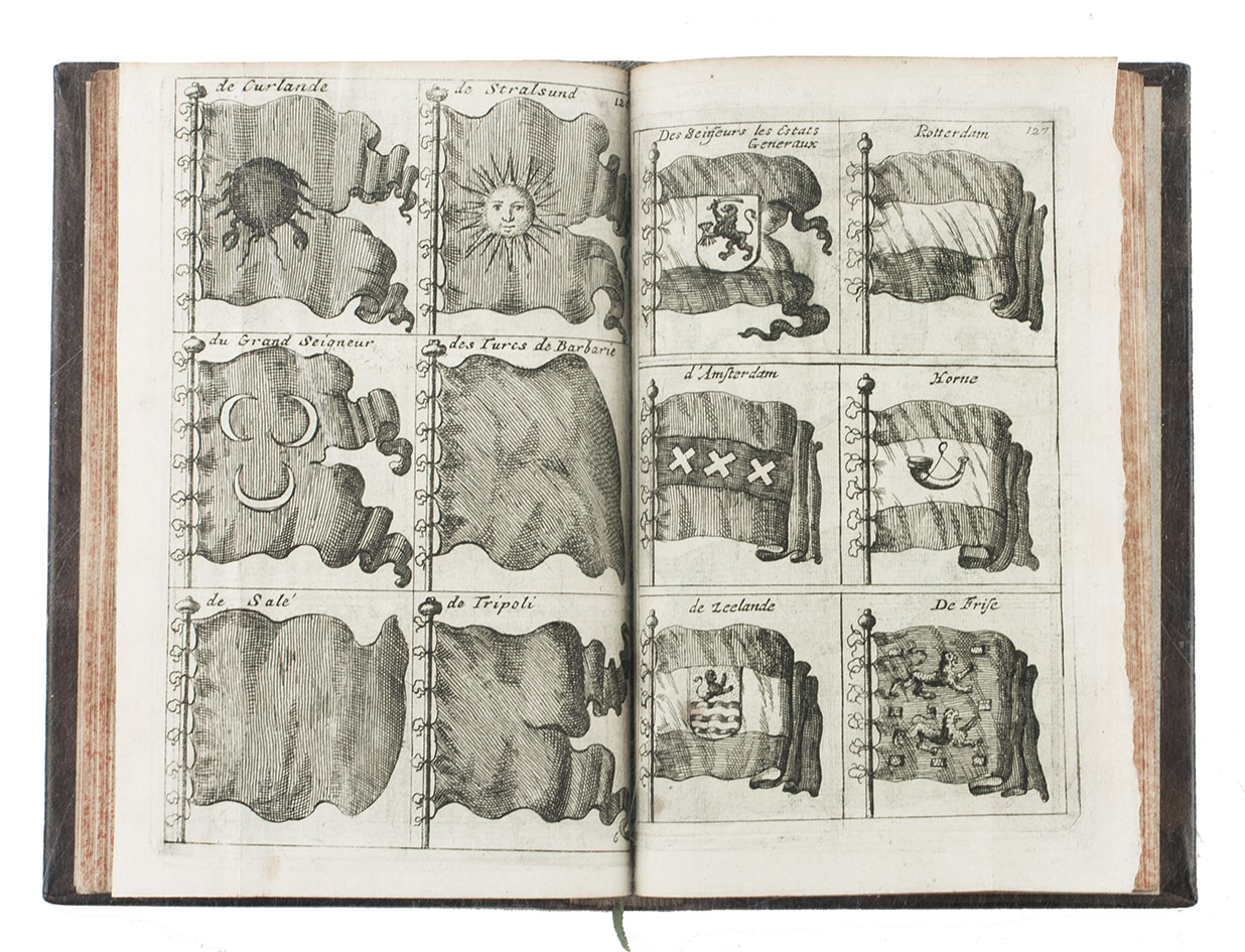 Amsterdam, Paul de la Feuille, 1718. 2 works in 1 volume. 8vo. Ad 1 with 28 engraved illustrations on 24 folding leaves. Further with a small woodcut vignette on the title page, one woodcut decorated initial, and one woodcut headpiece. Ad 2 with a woodcut floral vignette on the title page, and typographical tables in the text. Contemporary gold-tooled mottled calf, with a red morocco title label lettered in gold on the spine, gold-tooled board edges, and red sprinkled edges. [1], [1 blank], [4], "216" [= 198], [2 blank]; 123; [2]; pp.