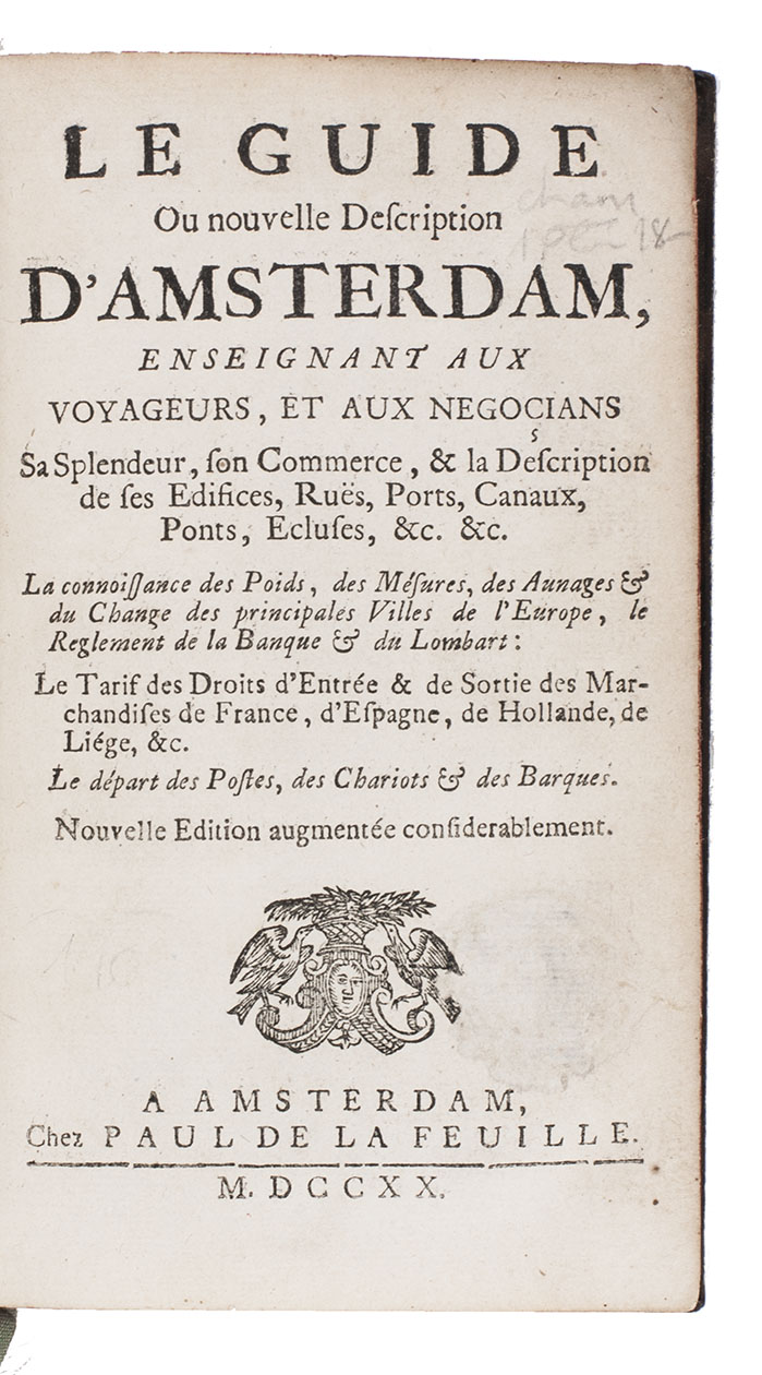 Le guide ou nouvelle description d'Amsterdam, enseignant aux voyageurs, et aux negoçians sa splendeur, son commerce, & la description de ses edifices, ruës, ports, canaux, ponts, ecluses, &c. Nouvelle edition augmentée considerablement.