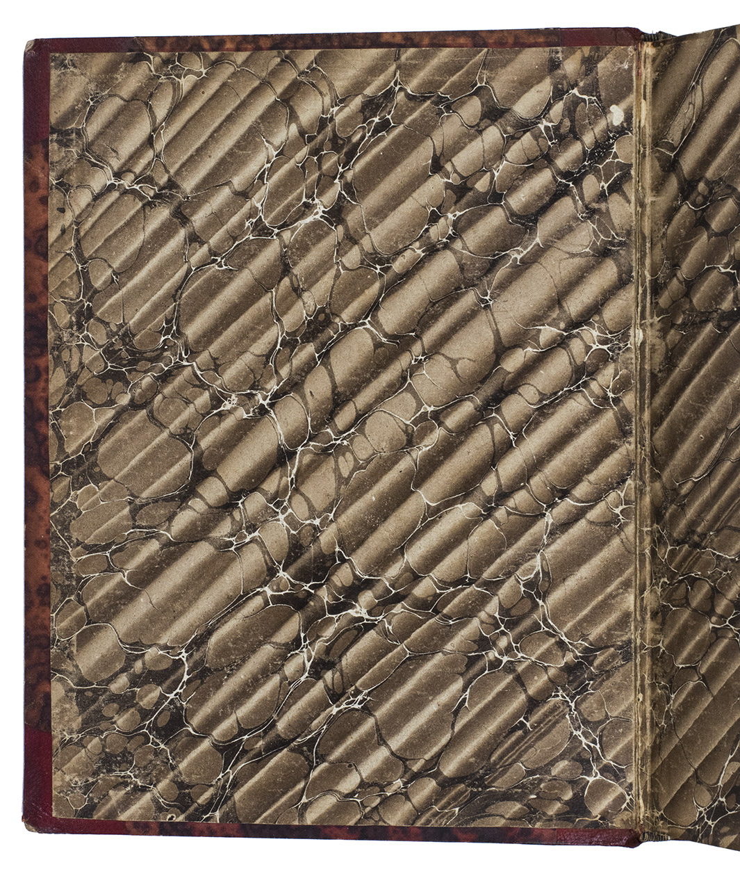 Mid-19th-century half red goatskin morocco, sewn on 4 supports, gold-tooled spine (blind-tooled fillets) with the cypher monogram of a French count in compartments 1, 3 & 5 and "labbé|Barthelemy" and "Dissertations|1760-1792" in mid-19th-century roman capitals across compartments 2 & 4, "agathe" chemical-marbled sides, Spanish-marbled endpapers, red sprinkled edges, green ribbon marker. 16; 43, [1 blank]; 24; 28, XIV; [2], 44; 12; 8; 12; [1], [1 blank], 45, [1 blank]; 9, [1 blank] pp.