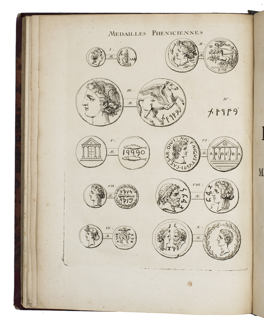 With 4 plates (numbered I-IV, nos. I & III folding), the first 3 signed by P.L Charpentier, of Phoenician inscriptions, alphabet and medals. With a woodcut (oak branches with a ribbon) on the title-page and a woodcut headpiece.