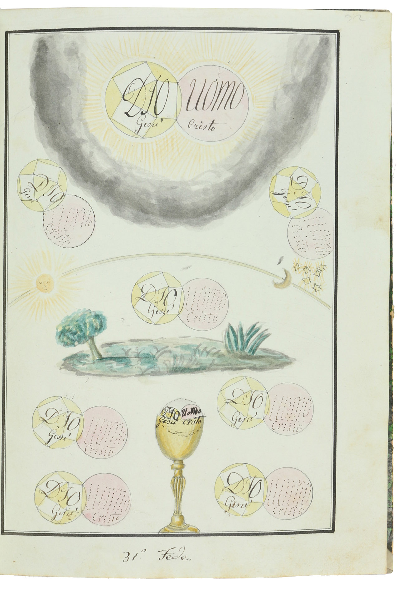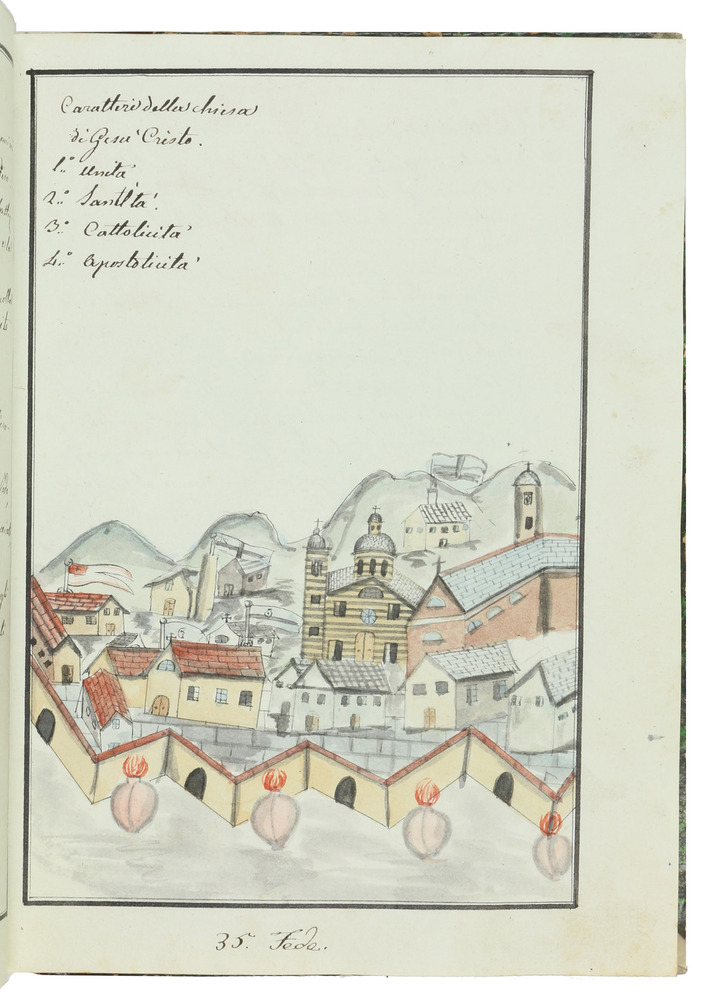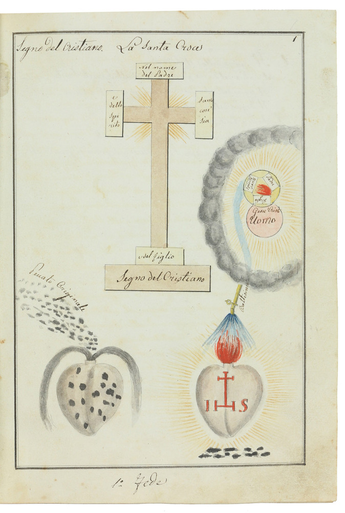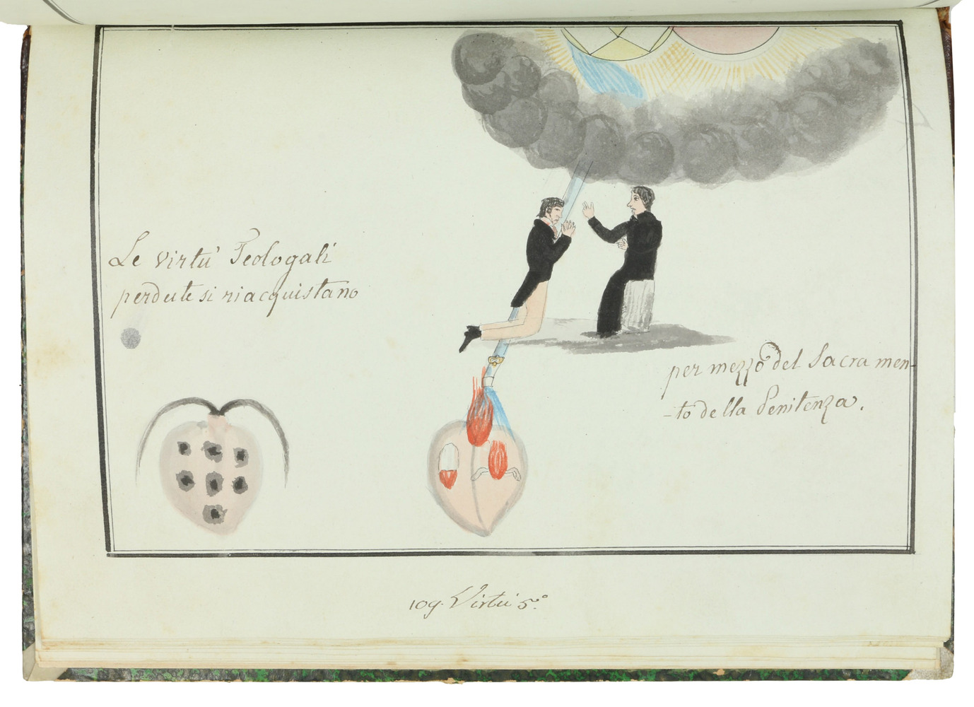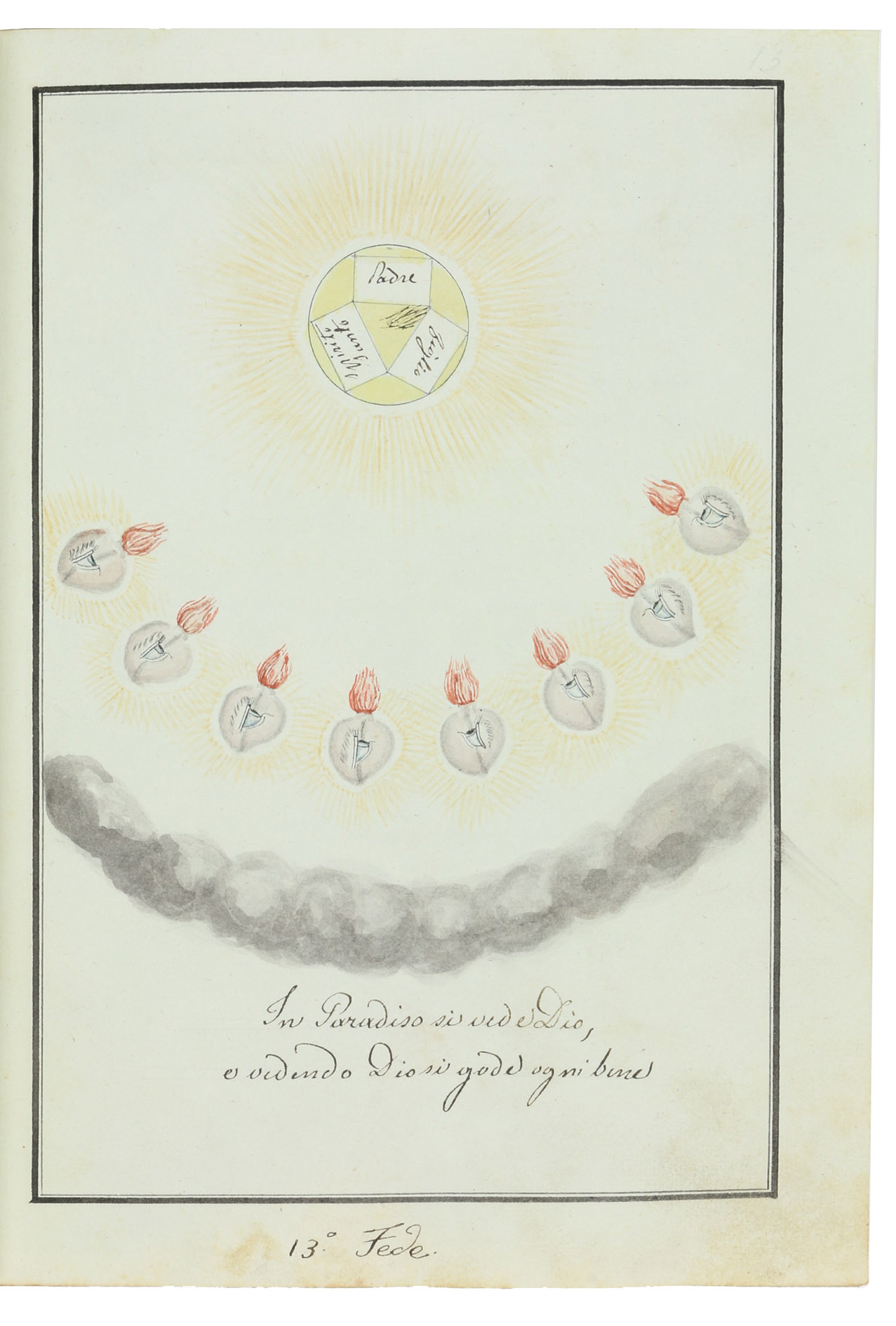 The style of the watercolours is somewhat primitive and popular, but very rich in detail. They illustrate faith in general ("fede"; nos. 1-42); the commandments ("legge"; nos. 43-51); prayers ("preghiera" 1-10; nos. 52-61); the sacraments ("sacramenti"; nos. 62-95, 97-104); virtues ("virtu" 1-14; nos. 105-118), and include views of heaven and hell, creation, a city, priestly activities, and all kinds of Catholic symbols, etc.