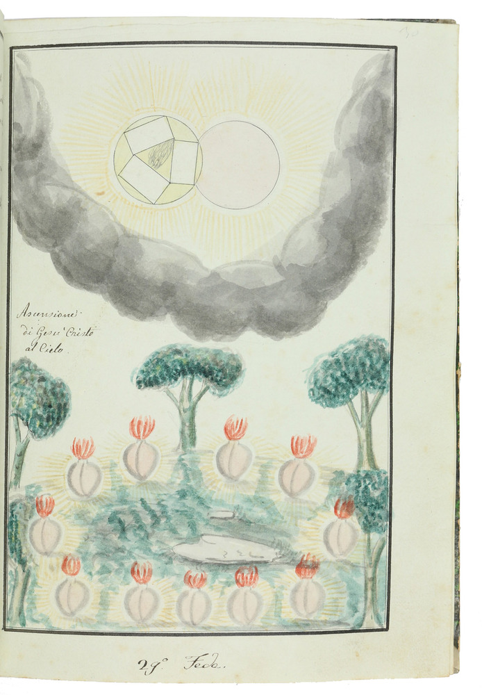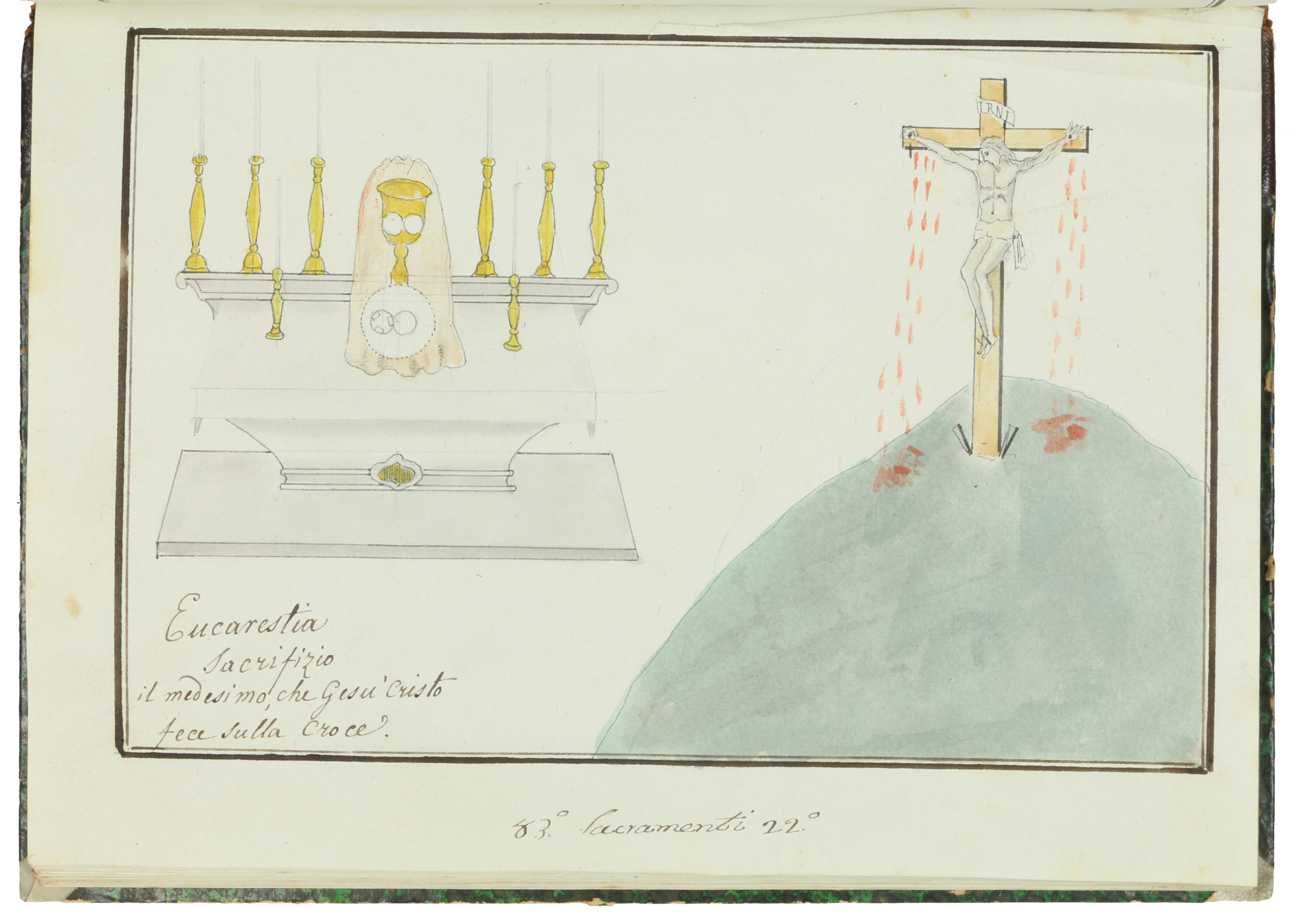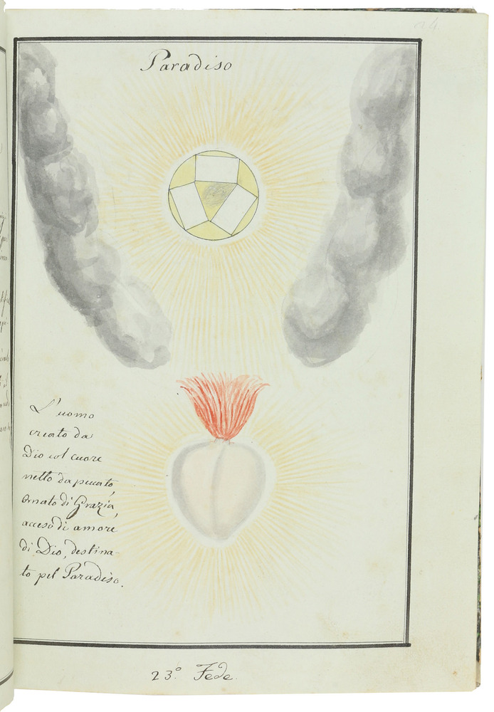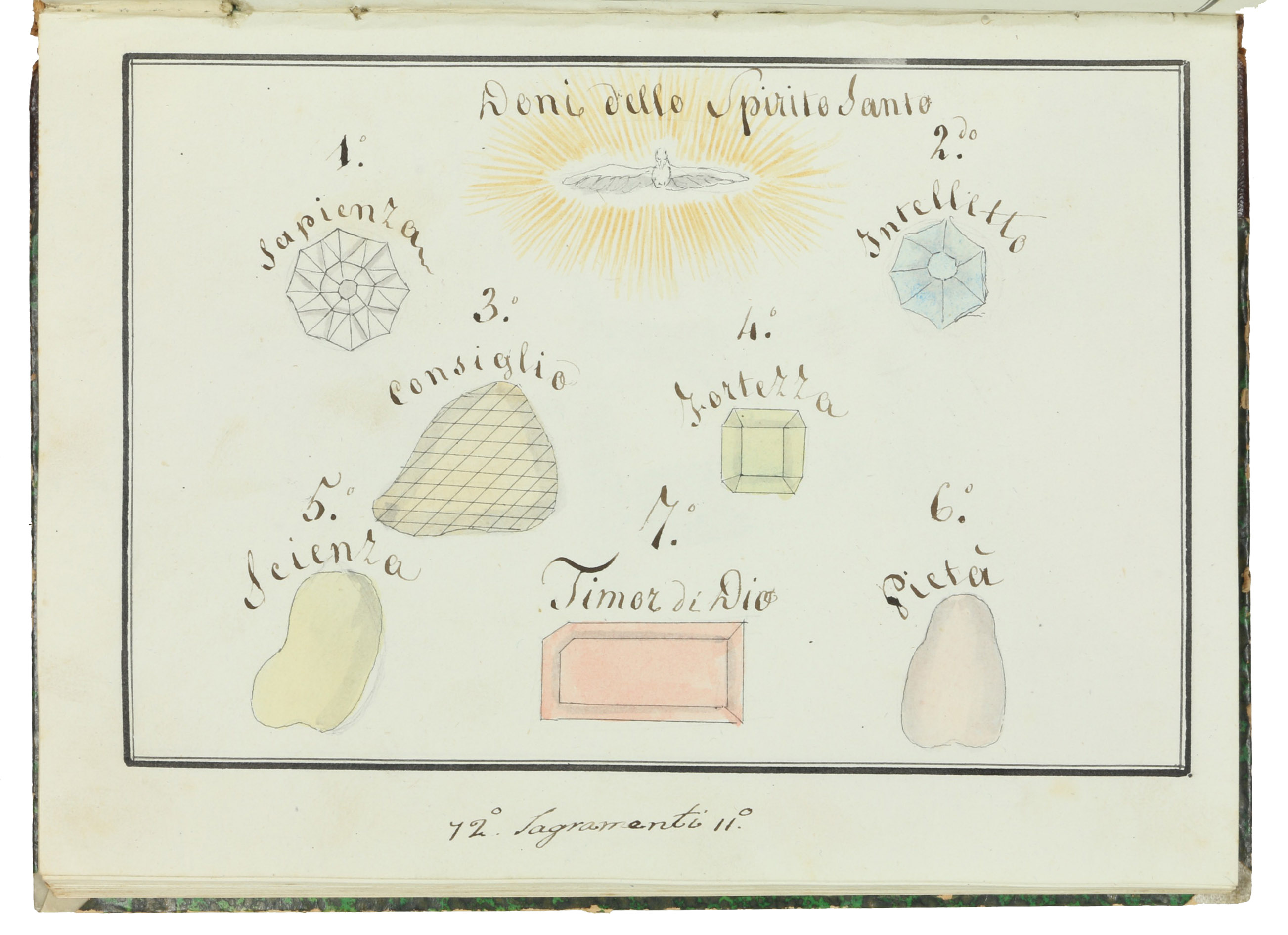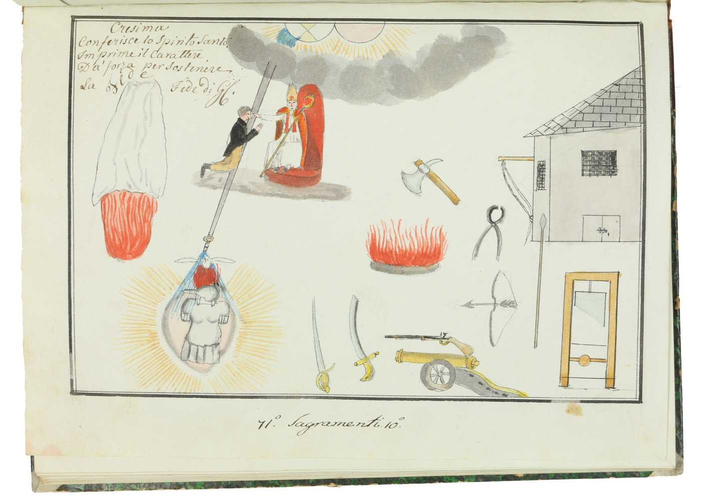 The style of the watercolours is somewhat primitive and popular, but very rich in detail. They illustrate faith in general ("fede"; nos. 1-42); the commandments ("legge"; nos. 43-51); prayers ("preghiera" 1-10; nos. 52-61); the sacraments ("sacramenti"; nos. 62-95, 97-104); virtues ("virtu" 1-14; nos. 105-118), and include views of heaven and hell, creation, a city, priestly activities, and all kinds of Catholic symbols, etc.