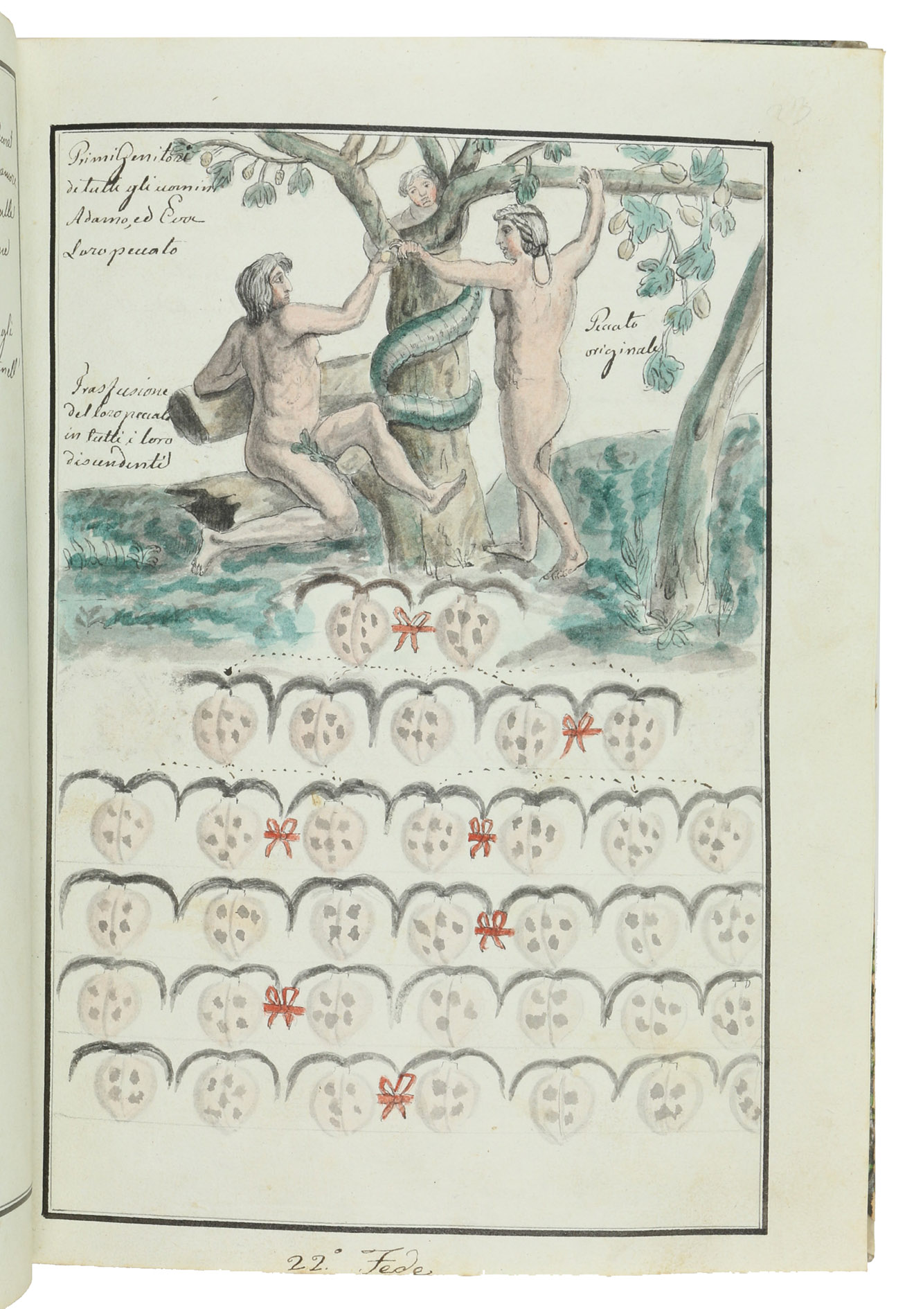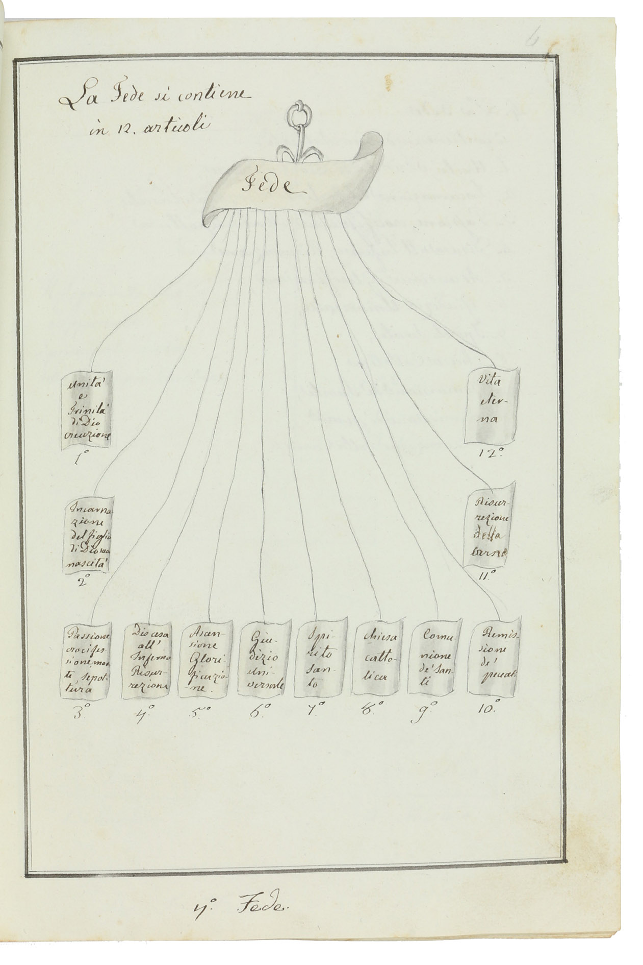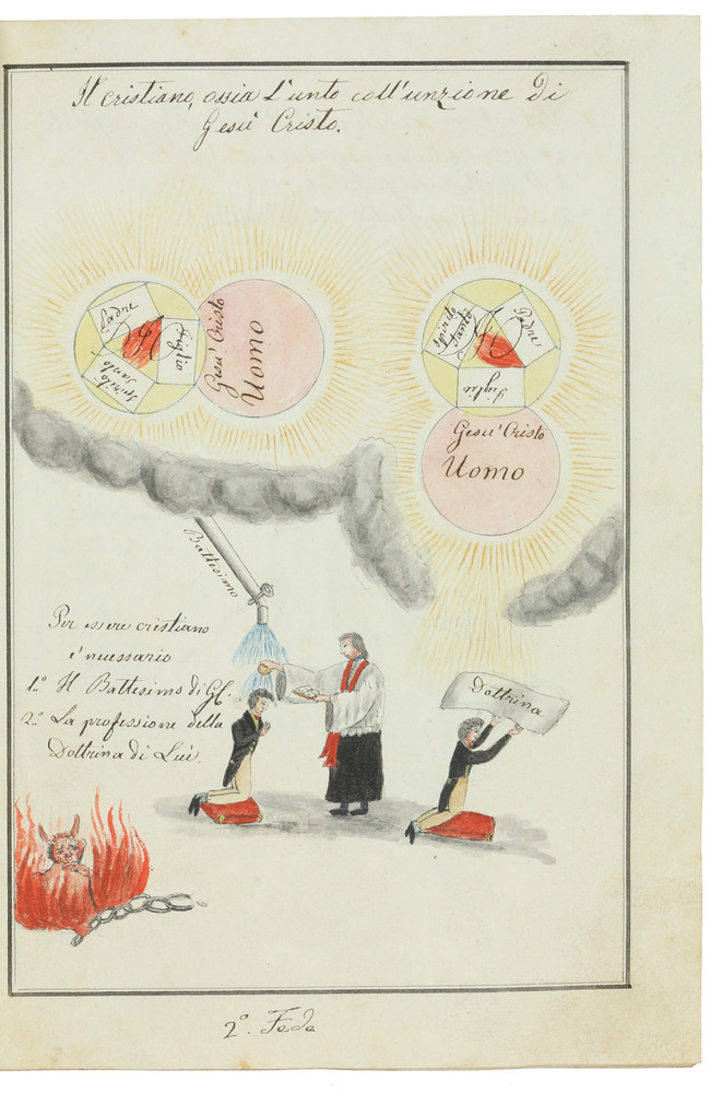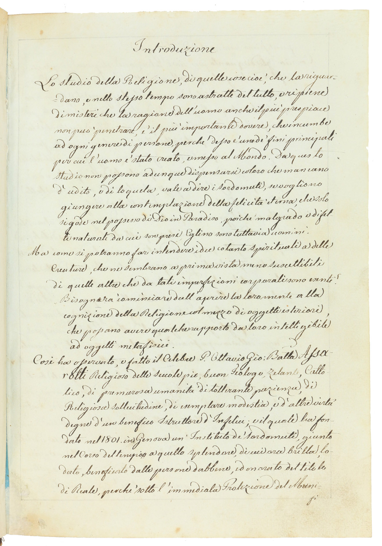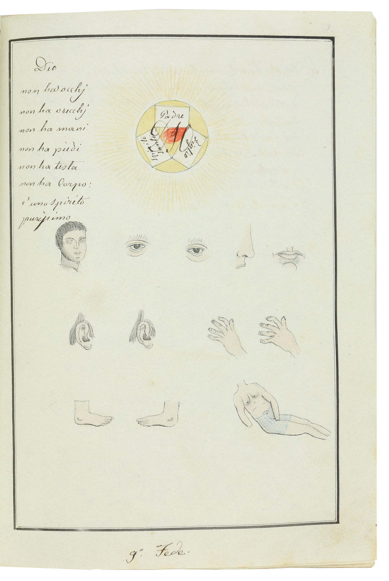 Important manuscript containing a method of teaching "Dottrina Christiana" (Christian doctrine) to Italian deaf-mutes, devised in Genoa by Padre Ottavio Giovanni Battista Assarotti (Genoa 1753-1829). Assarotti was an Italian philanthropist and founder of the first school for deaf-mute people in Italy. It is not certain that Assarotti himself wrote the present manuscript, which may be the work of one of his collaborators, based on the method Assarotti invented and developed and using the illustrations he designed. The introduction discusses the difficulty of teaching abstract concepts, such as religion, to deaf-mute pupils, necessitating the use of illustrations as designed by Assarotti. Assarotti "never wrote down his educational philosophy and methods, and so fell into obscurity after his death" (Deaf history unveiled). As far as we know this manuscript is the only surviving witness of Assarotti's theories.