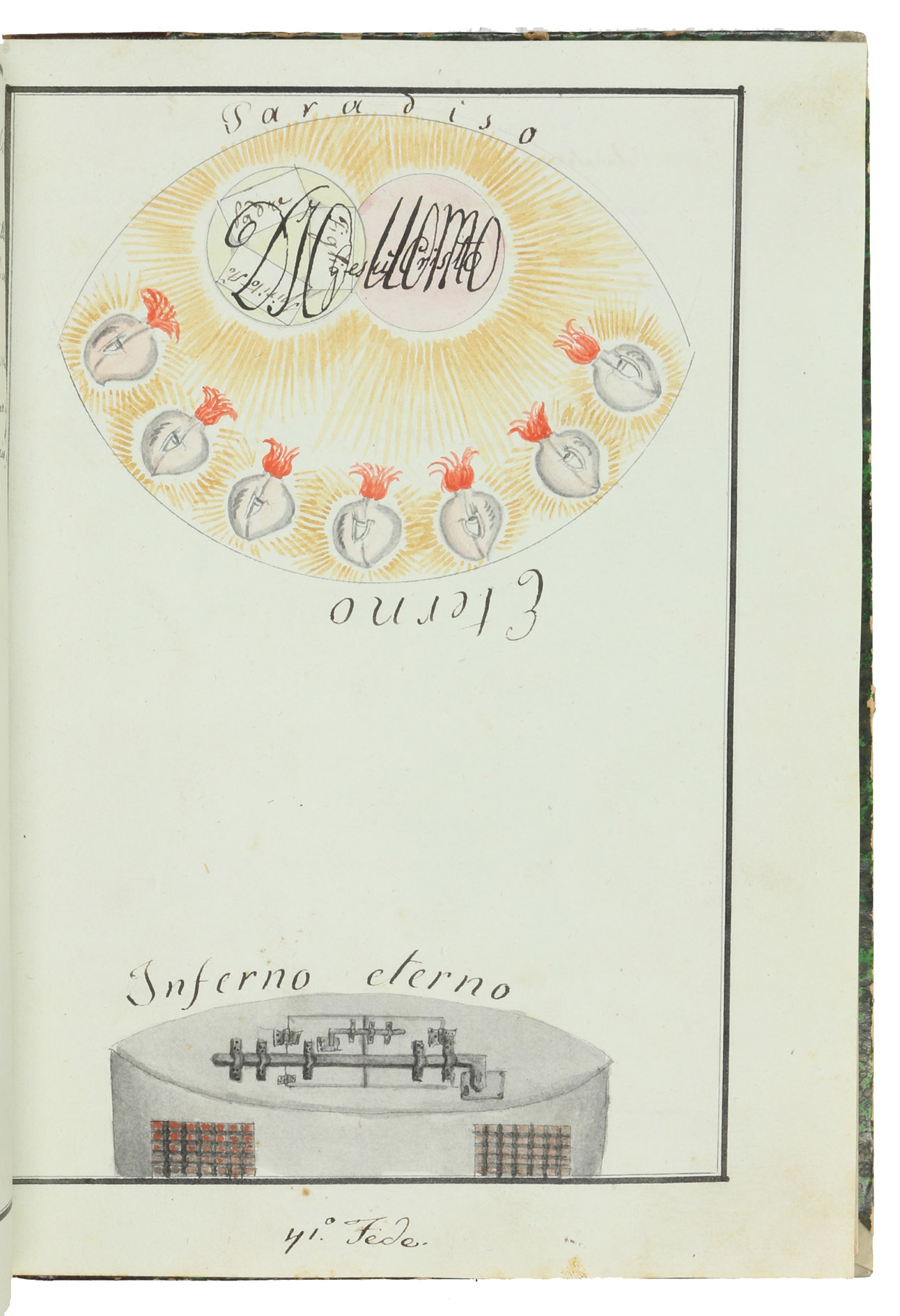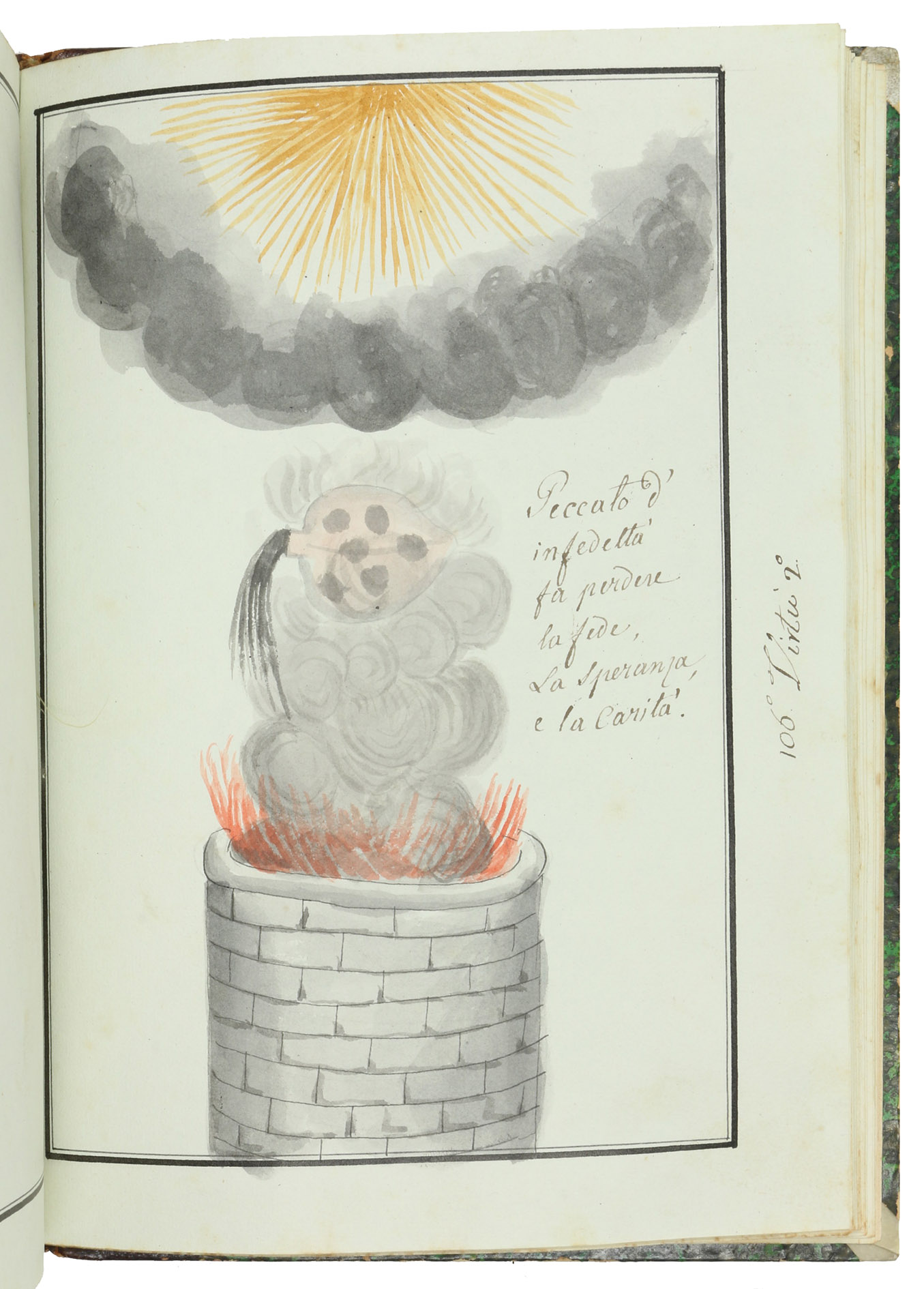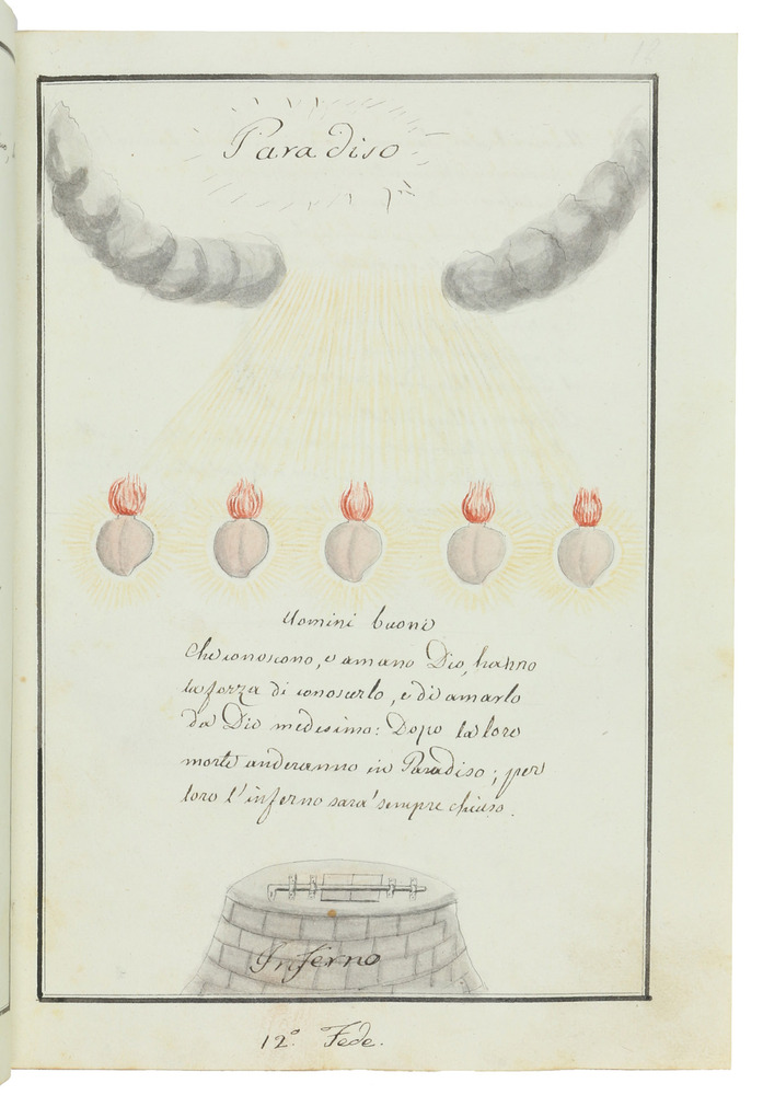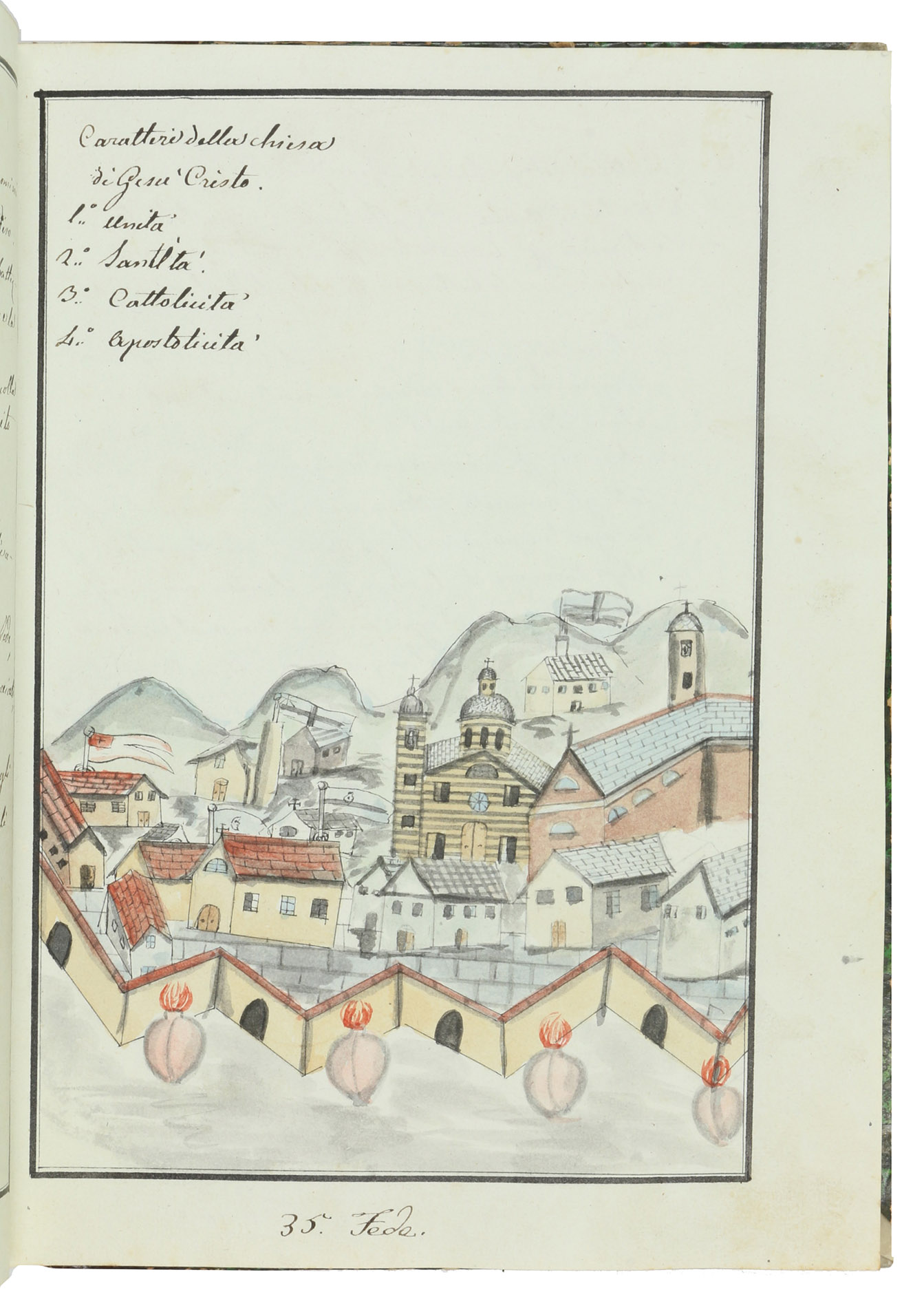 [Genoa, ca. 1815/20]. 8vo. With 117 (of 118) full-page hand-coloured drawings, each in a frame of double rules (20.5 x 14 cm), with lively illustrations of the Christian doctrine, and text in Italian. Contemporary half calf, gold-tooled spine. 117 (of 118), [3 blank] ll., including the last 3 blanks.