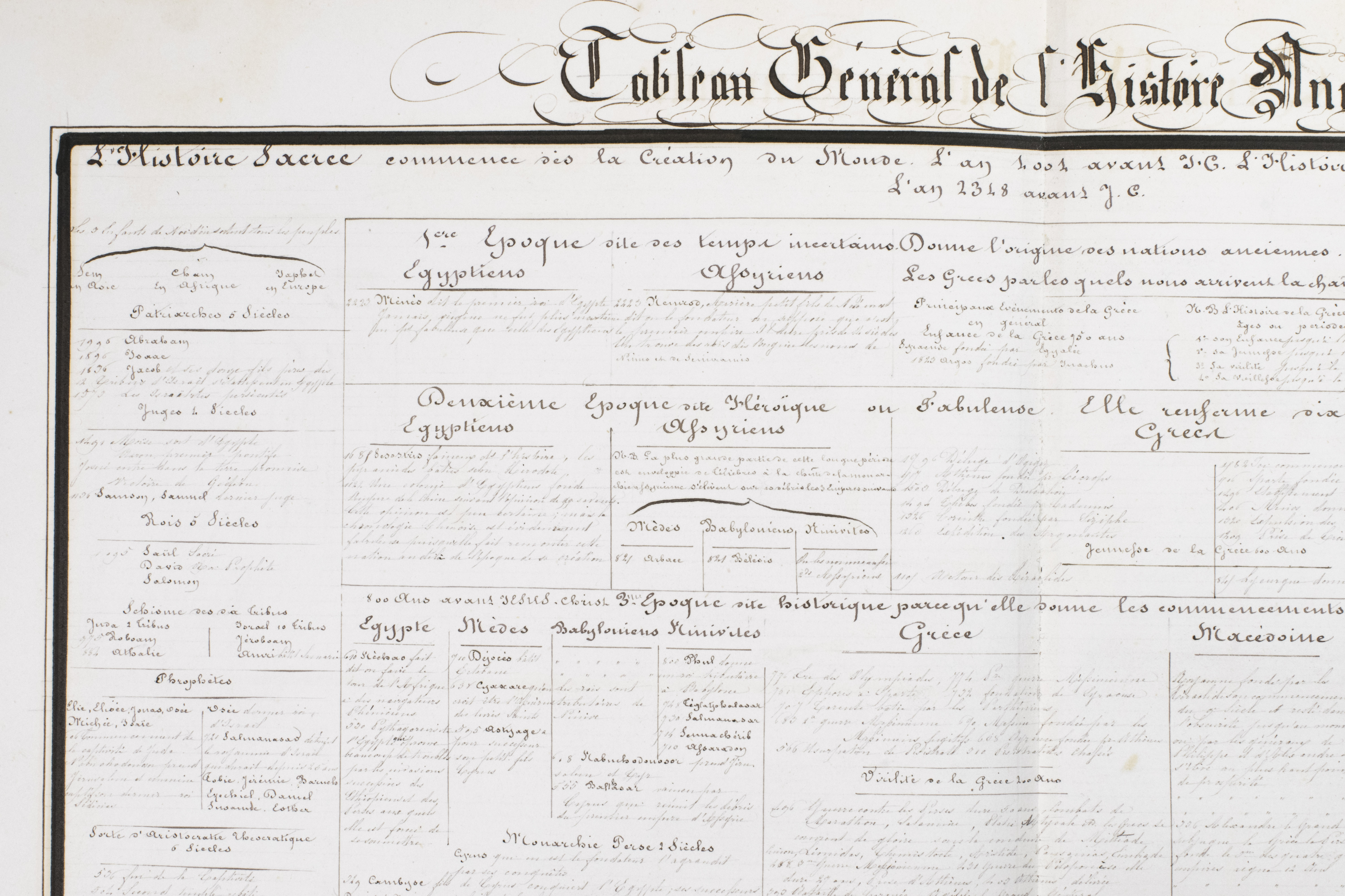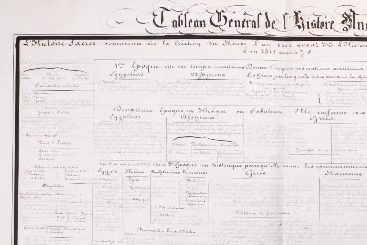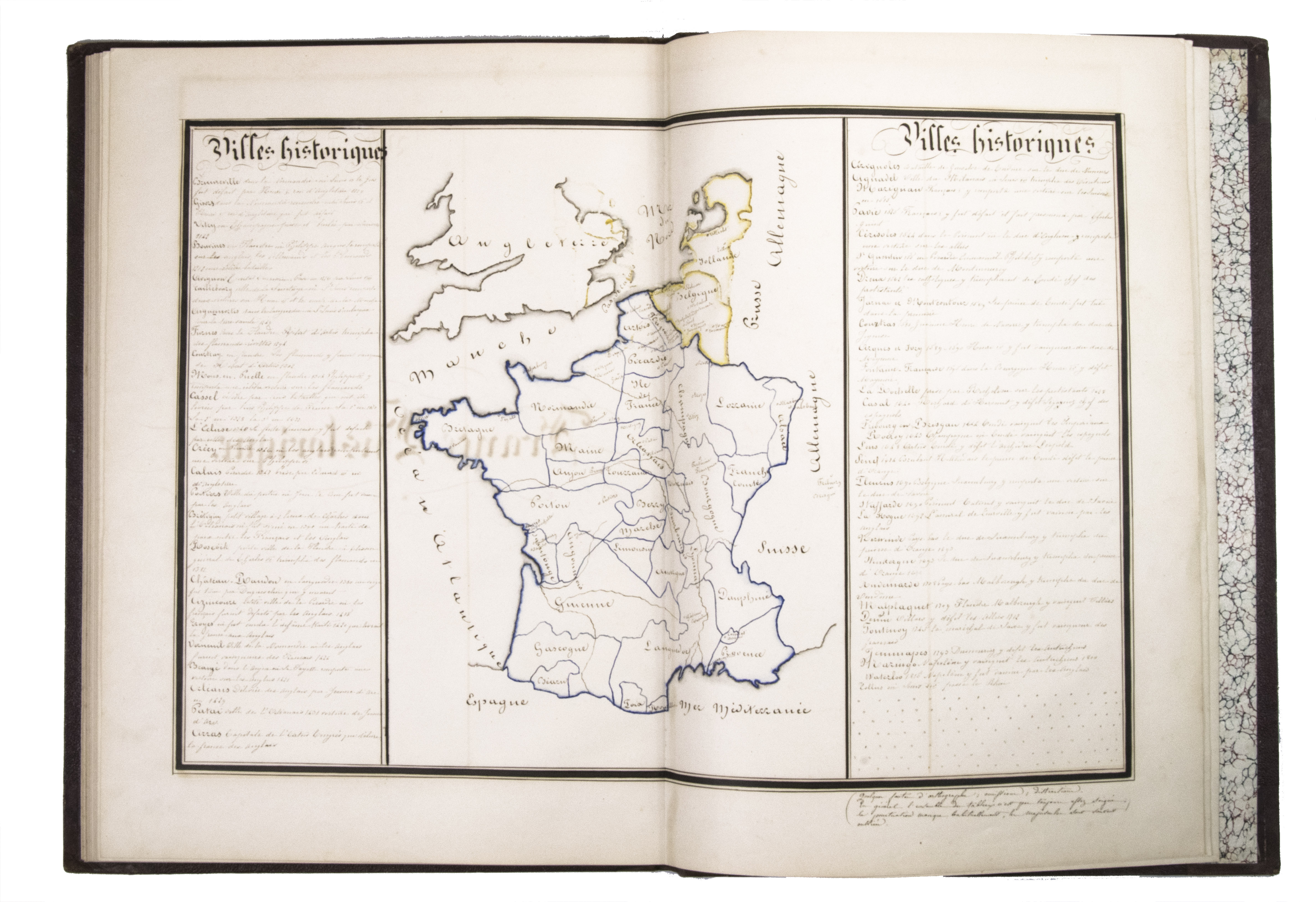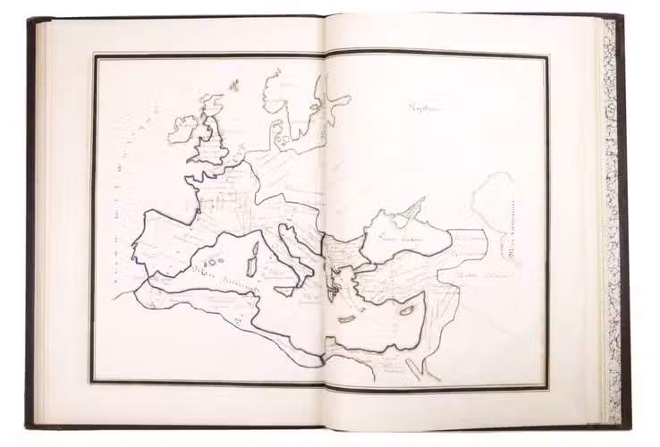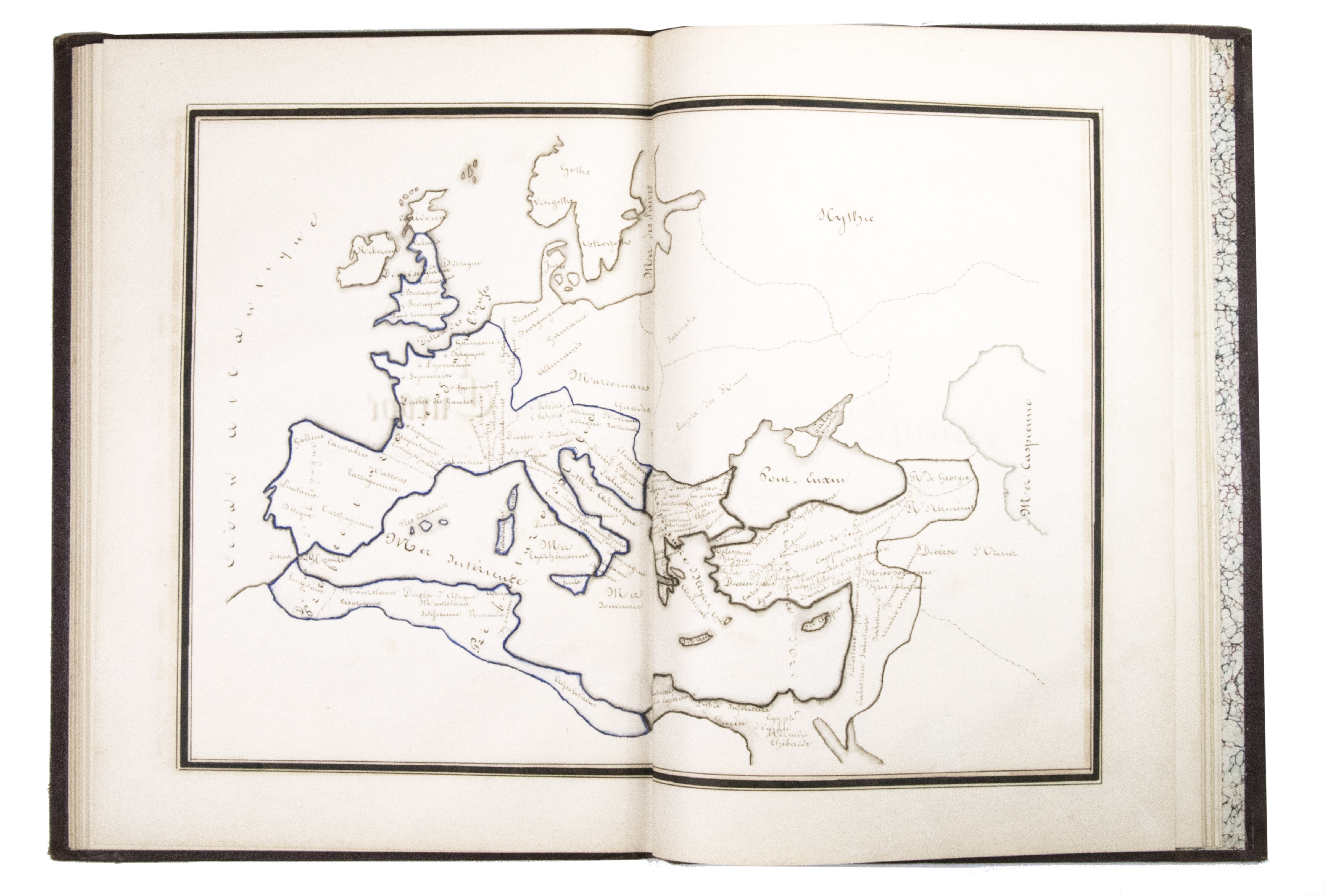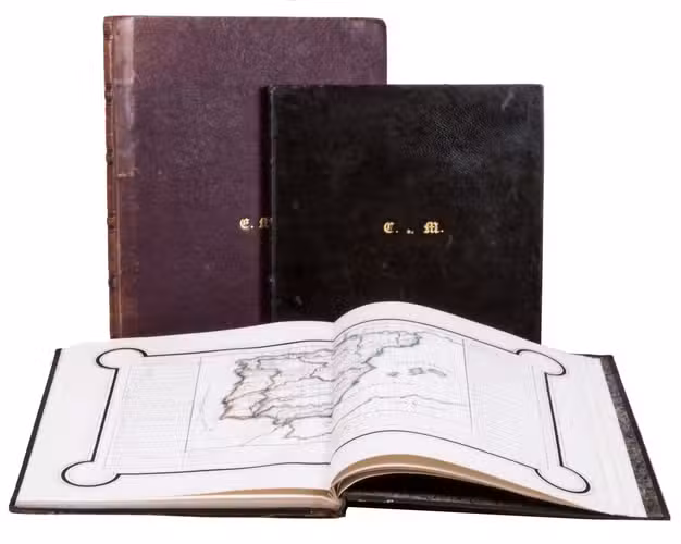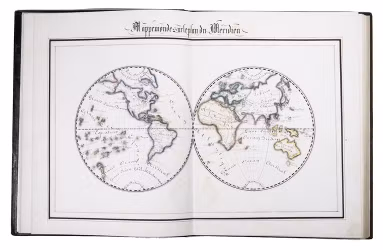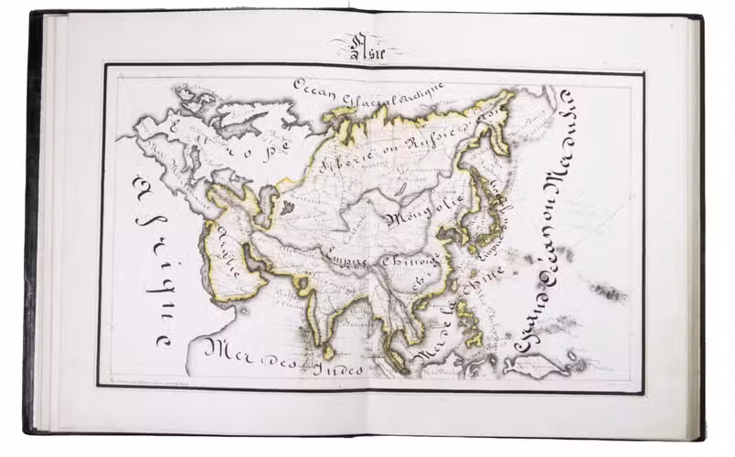 A 3-volume historical manuscript atlas with beautiful manuscript maps, the volumes titled: Atlas historique, Souvenirs historiques and Tableaux et cartes. The Atlas historique contains finely calligraphed chronological tables displaying events in ecclesiastical history, the history of the Roman Empire and France, from the first century to 1850, followed by coloured double-page maps of France, the Ottoman Empire, Europe and the Roman Empire. The Souvenir historiques has the same structure, but is solely devoted to the history of England, Spain, Germany and Italy, covering the period from the fifth century to 1850, with coloured double-page maps of the British Isles, the Iberian Peninsula, the German states, and Italy. The Cartes et tableaux is the most ambitious volume, containing no fewer than 14 coloured double-page maps, including two world maps, maps of Africa, Asia, America, Oceania, Europe, etc., and numerous chronological tables.