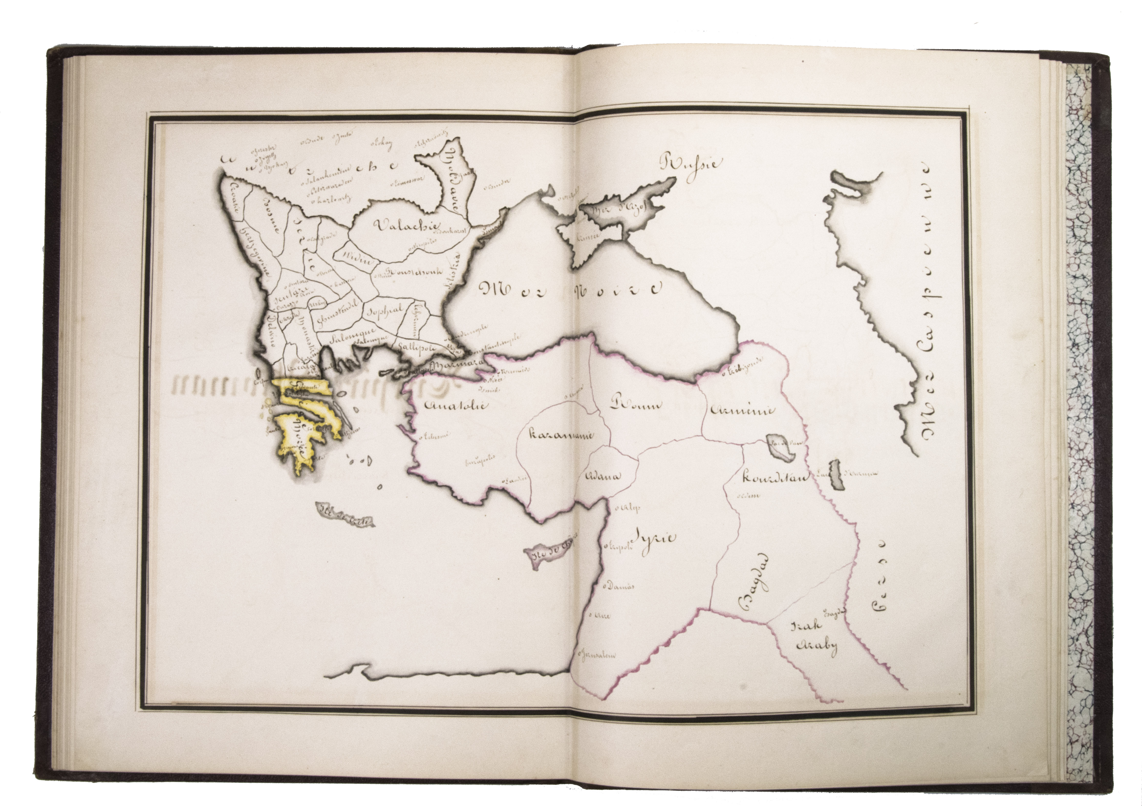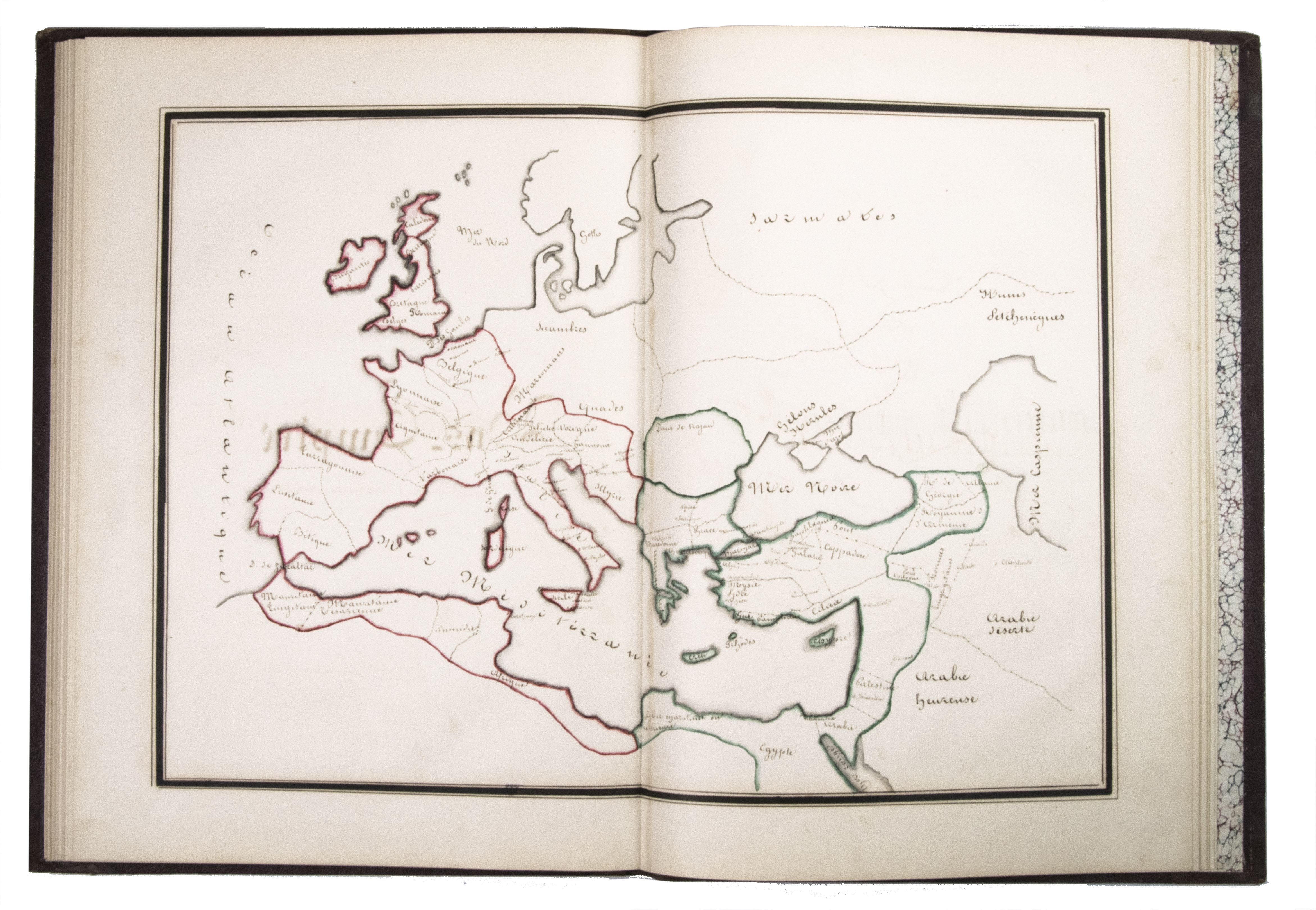 [Montpellier?], [date on spine of vol. 1:] 1851. 3 volumes. Folio (vol. 1) and large 4to (vols. 2-3). Neatly written manuscripts on paper with 23 graphically vibrant maps, coloured in outline with subtly shaded washes in grey (for the coasts) and numerous bright colours (for political boundaries), and with calligraphic headings. Contemporary bindings: vol. 1 red half goatskin; vol. 2 black half goatskin; vol. 3 black sheepskin. [1], [26 double]; [1], [22 double]; [1], 30 double, [1] ll.