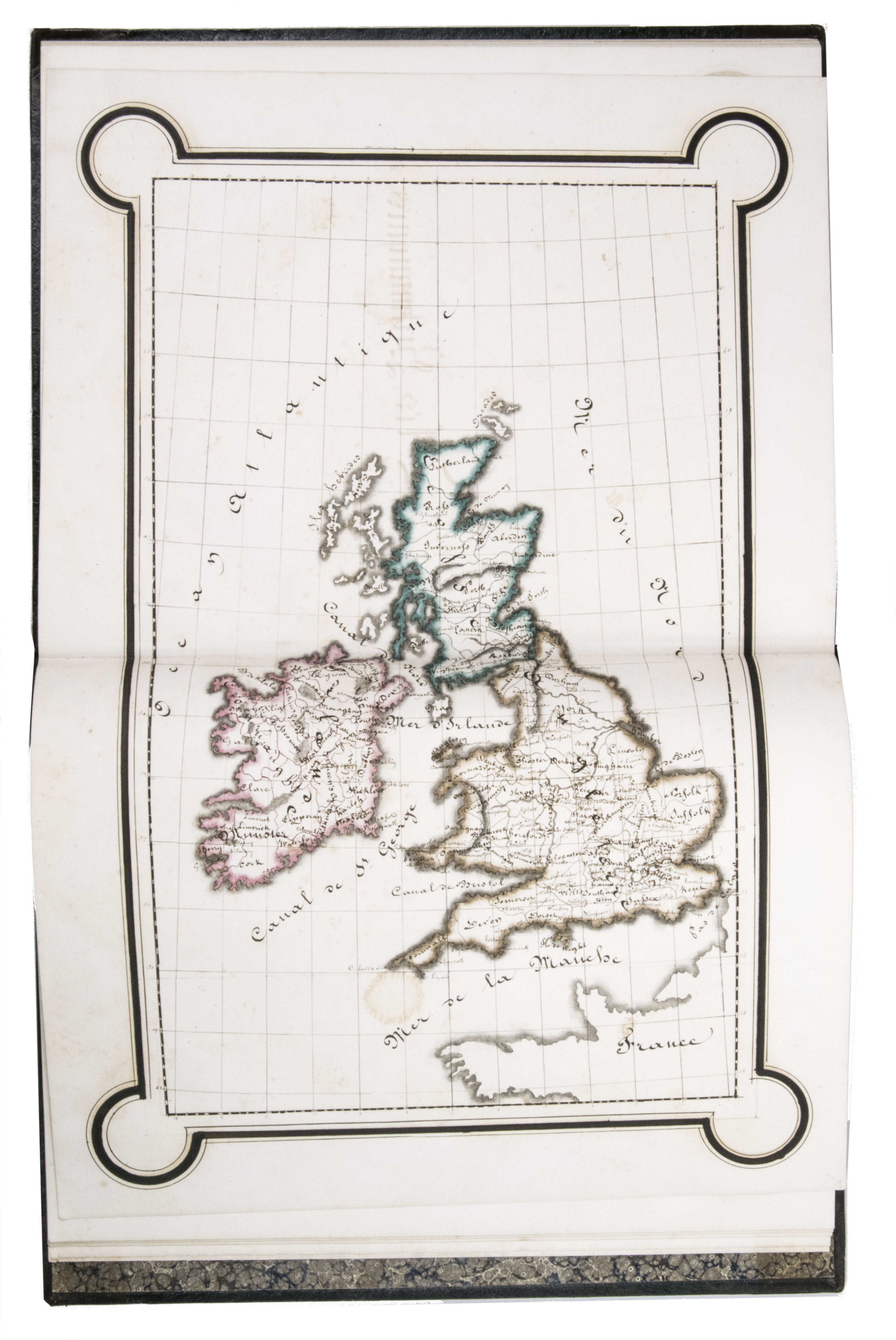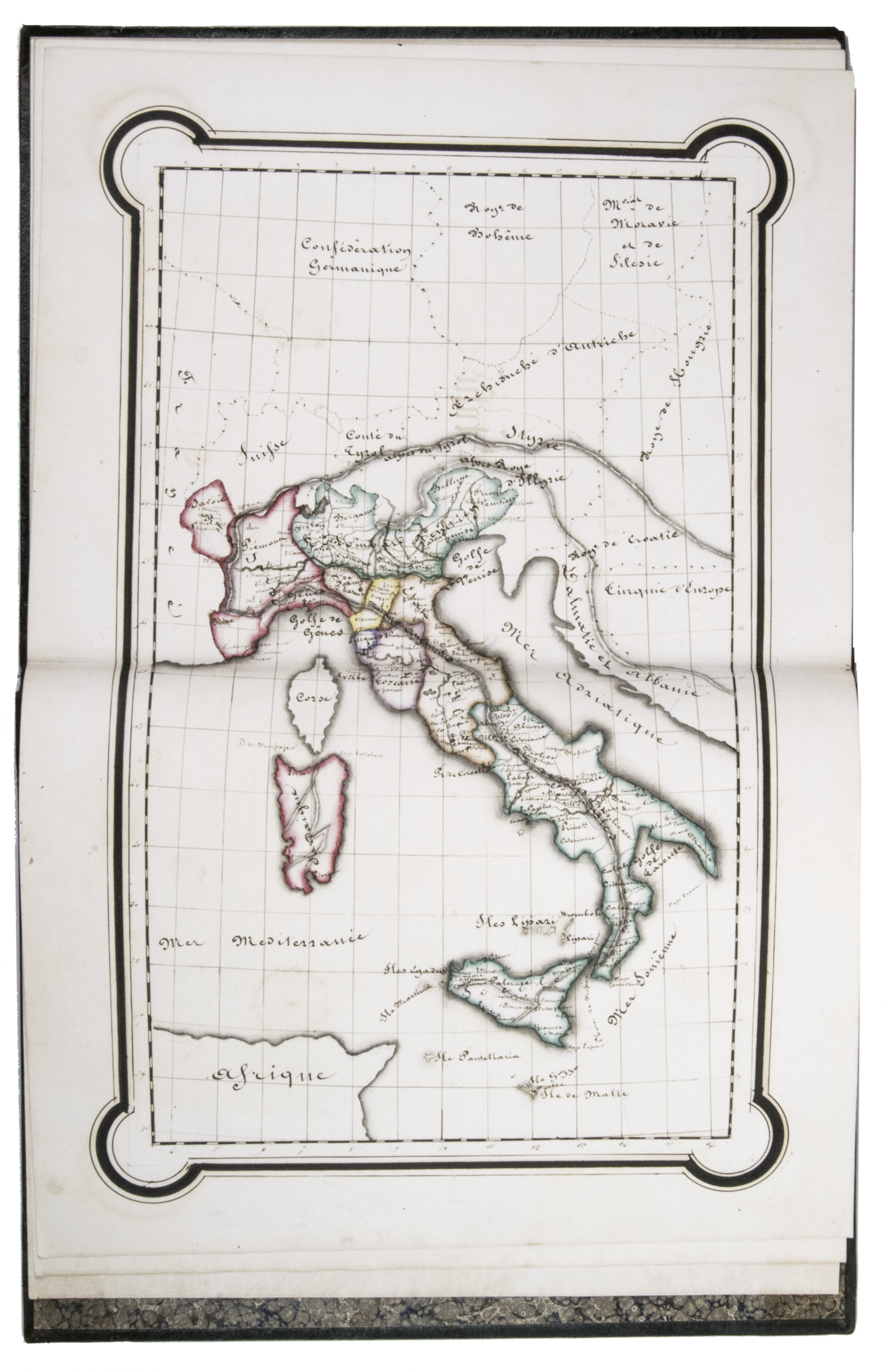 The ink has sometimes left a browned shadow on the back of the leaves or facing leaves and occasionally eaten a small hole in the paper, but the atlas is otherwise in very good condition. Bindings slightly chafed. A graphically vibrant French historical manuscript atlas.