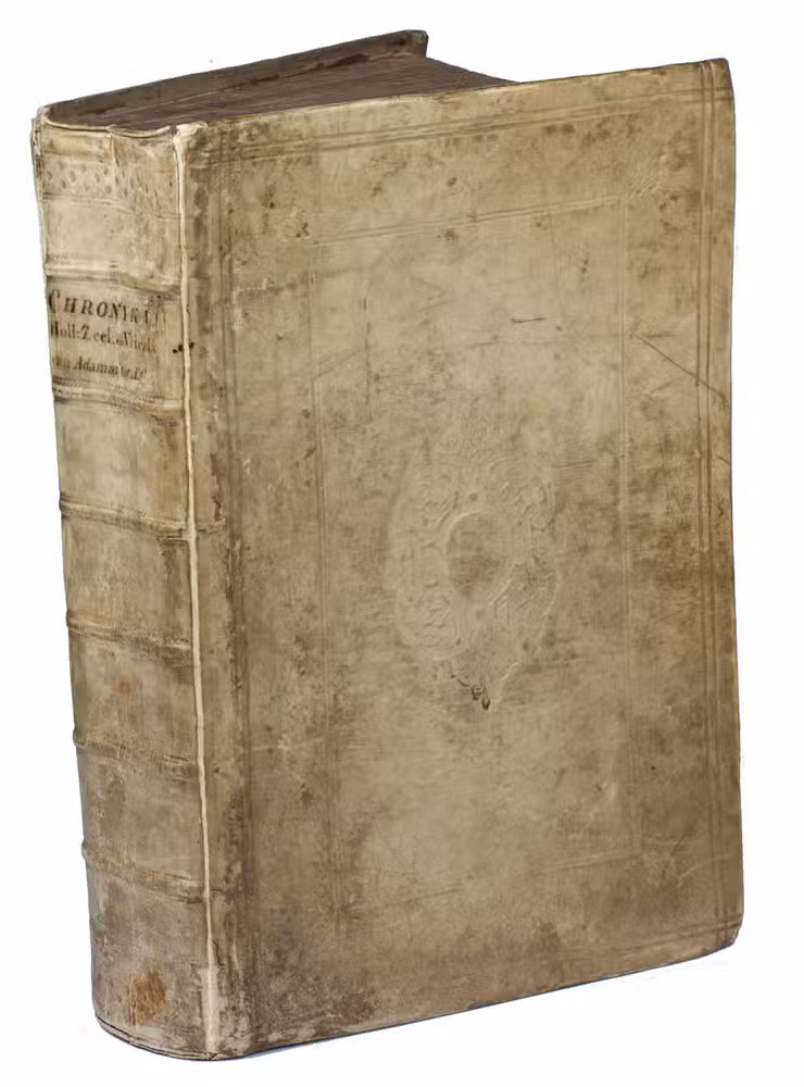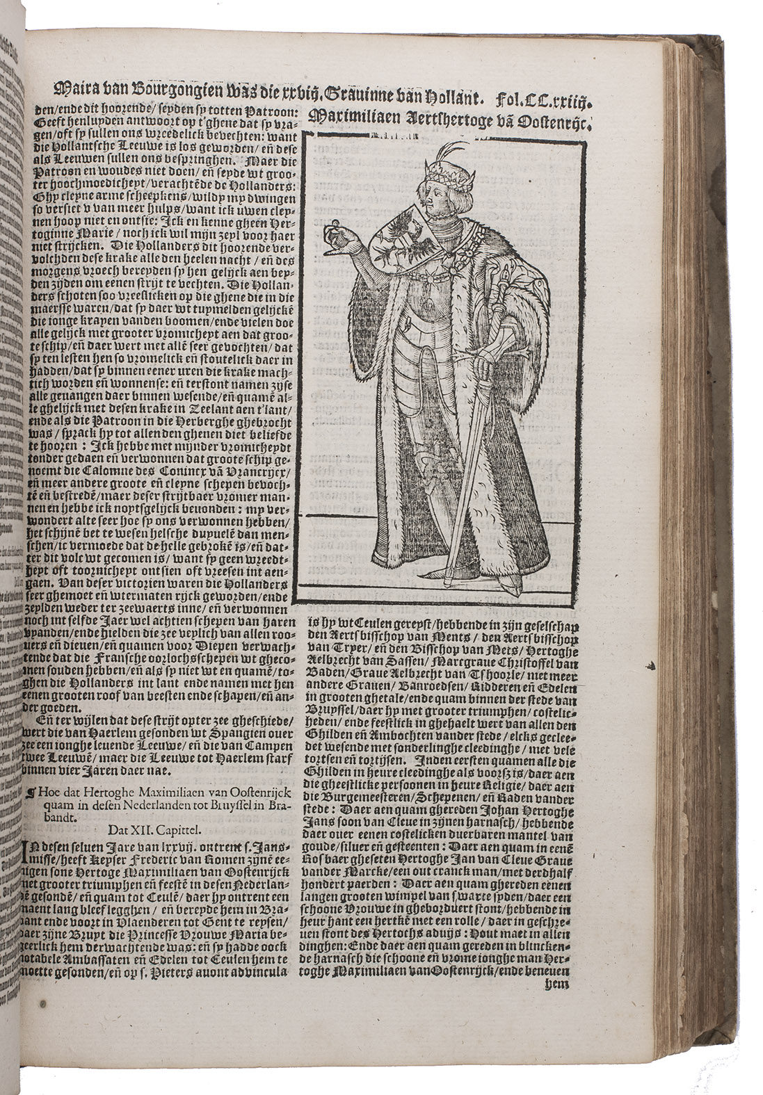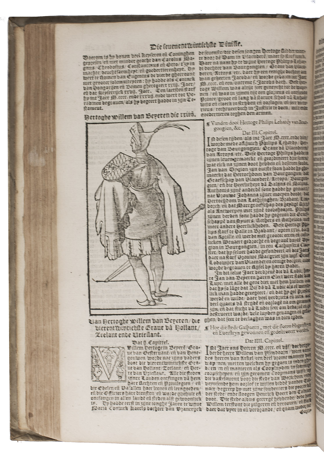 Die cronycke van Hollant, Zeelant ende Vrieslant. Dordrecht, Peeter Verhaghen, 1591, 1591, 1590. 3 volumes bound as 1. Small folio (30.5 x 20.5 cm). With 3 title-pages, each with a different woodcut full-length portrait (the first count of Holland Dirck I, the Holy Roman Emperor Charles V and King Philip II of Spain), 1 double-page engraved map of Holland in part 2 (in its first state), and 36 woodcut portraits in text. Blind-tooled vellum (ca. 1740?). [6], 264; [6], 162; [1], 1-110, 110-130, [6] ll. plus the map.