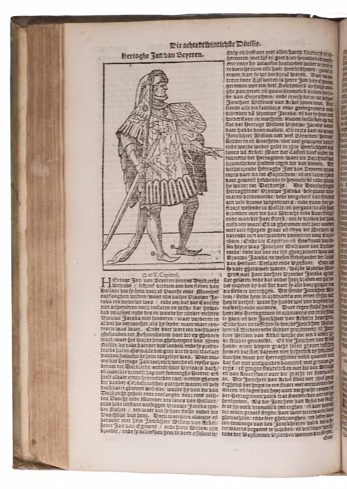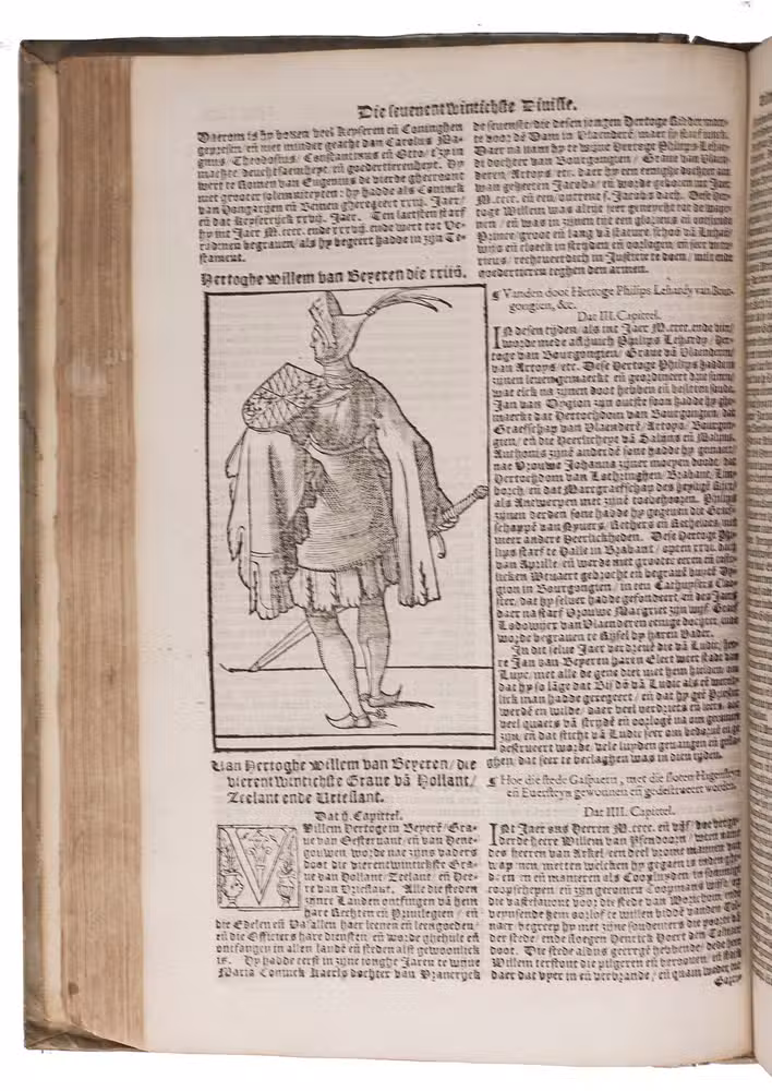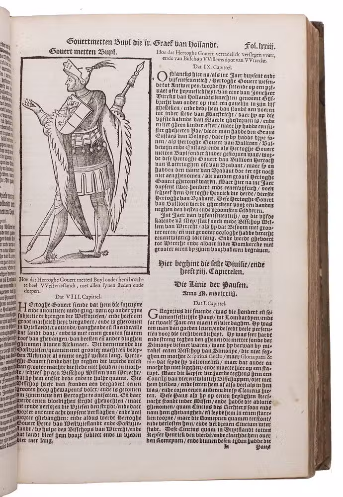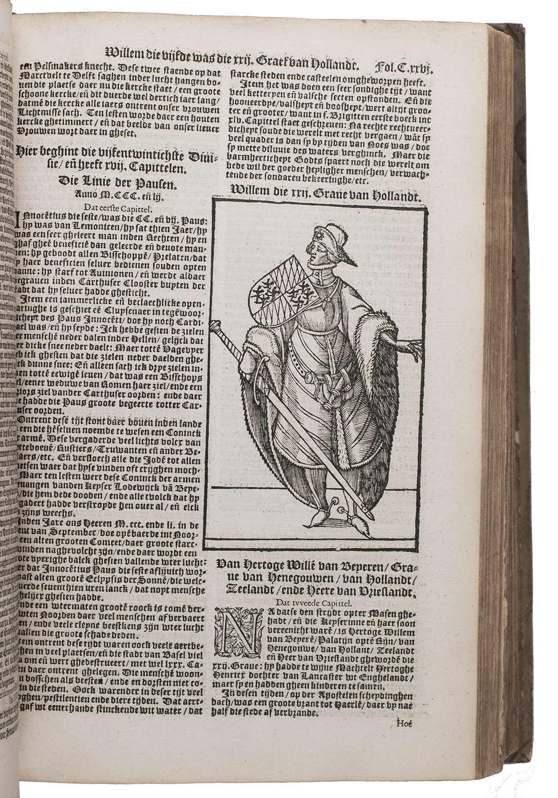 One of the four issues (differing only in the imprint) of the third major revision and extension of the famous Dutch national chronicle, known as the "Divisiekroniek", the first edition to include the important continuations by Ellert de Veer (to the year 1591), along with the double-page engraved map of Holland, drawn and engraved for the present edition (so here in its first state) by Jan Pieterszoon Saenredam, but often lacking. The work is beautifully illustrated with 36 woodcut full-length portraits in the text, depicting the counts of Holland and their coats of arms.