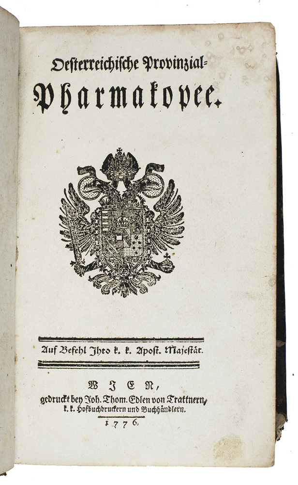 Corners slightly bumped, otherwise in very good condition. Christa Kletter, The civil Pharmacopoeias of Austria (Paper Austrian International Society for the history of Pharmacy, 2015), pp. 7-8.