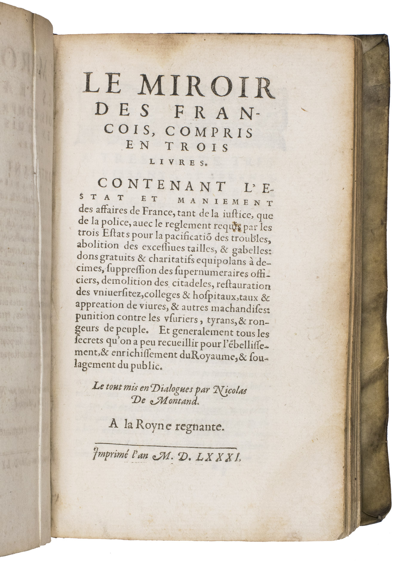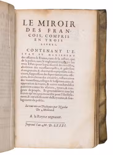 Le miroir des Francois, compris en trois livres. contenant l'estat et maniement des affaires de France ... Et generalement tous les secrets qu'on a peu recueillir pour l'ébelissement, & enrichissement du royaume, & soulagement du public. Le tout mis en dialogues par Nicolas De Montand. A la royne regnante.