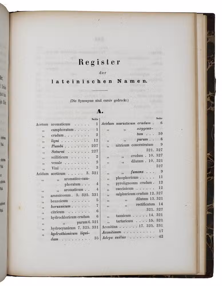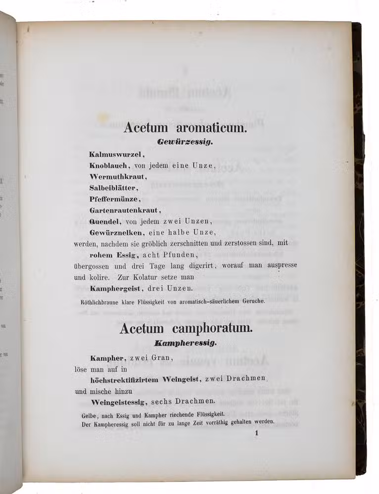 Library stamp on title. Some stains, especially on the first leaves, otherwise in good condition. The afterword by Wolgang Schneider in the reprint of the Pharmakopoe of 1988; Neues Repertorium für die Pharmacie, vol. 9 (1859), 3. Abschnitt, pp. 39-43.
