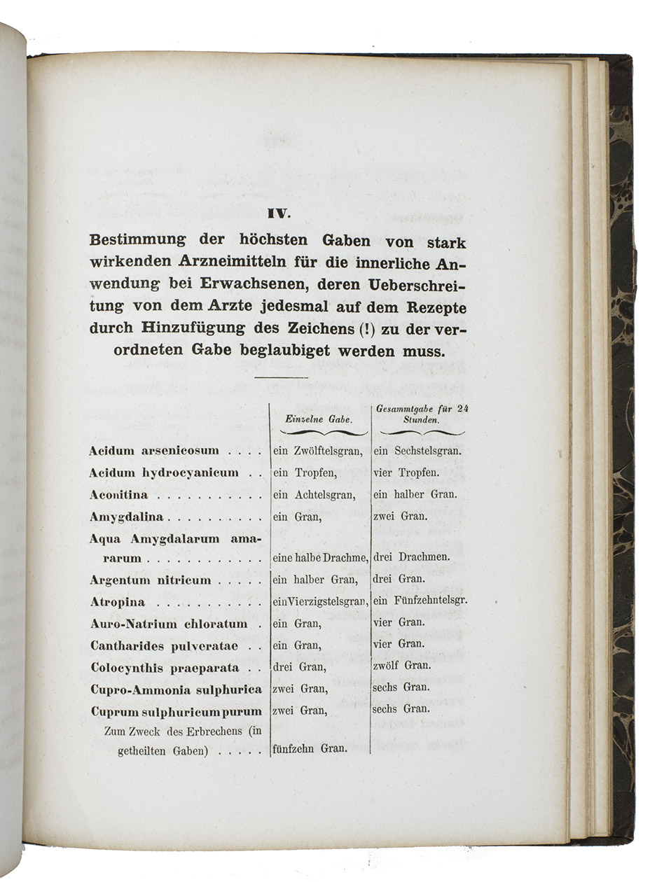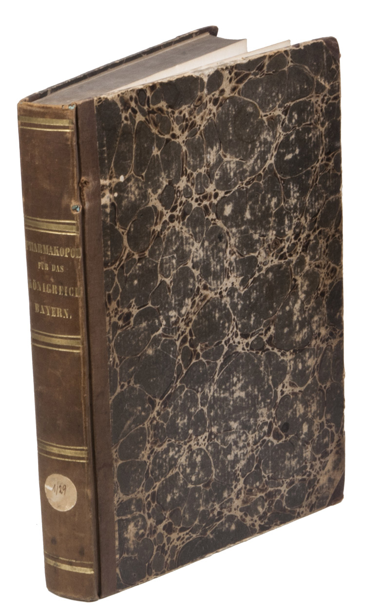 First edition of a new Pharmacopeia for the Kingdom of Bavaria, ordered by the liberal King Maximilian II (1811-1864, who succeeded his father in the revolutionary year 1848) to replace the obsolete Bavarian Pharmacopeia of 1822. The compilers of the new work were a.o. Prof. Max Pettenkofer, Hofapotheker and first German Hygienist (1818-1901) and Dr. Ernst Aug. Buchner.