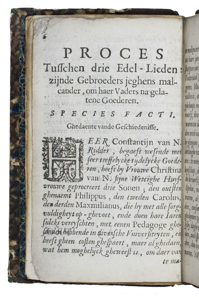 Het stichtigh ende vermakelijck proces van drie ghebroeders, edel-lieden. Den eenen zijnde een dronkaert. [Den] tweden een hoer-eerder. [Den] derden een speelder. Dat wie bevonden sal worden vande drie ghebreken het kleenste begaen te hebben, het meeste erven sal van zijn vaders nae ghelatene goederen, volghens het testament daer af sijnde ghevonden, wesende onder sekere oude papieren, van M. P. v. O.