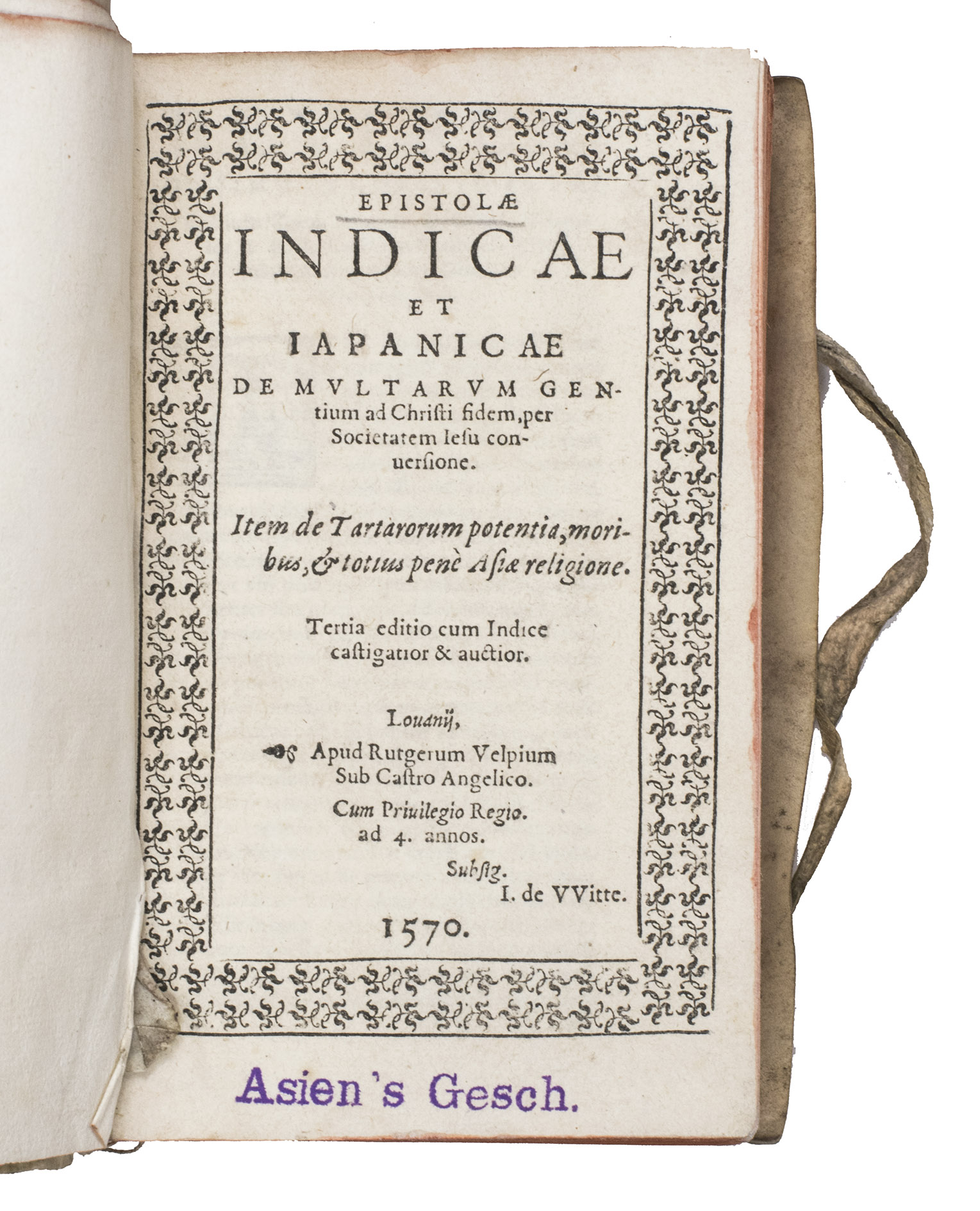 With an owners inscription on flyleaf dated 1571 and a library stamp on title-page ("Asiens Gesch"). A very good copy. Ad 1: Alt-Japan-Katalog 468; De Backer & Sommervogel I, cols. 996-997; Bibl. Belg. II, p. 267 (E14); Cordier, Japonica, cols. 52-53; Floor, The Persian Gulf, p. 18 note; not in Machiels; ad 2: Machiels G-87; NNBW III, col. 3403; not in Bibl. Belg.