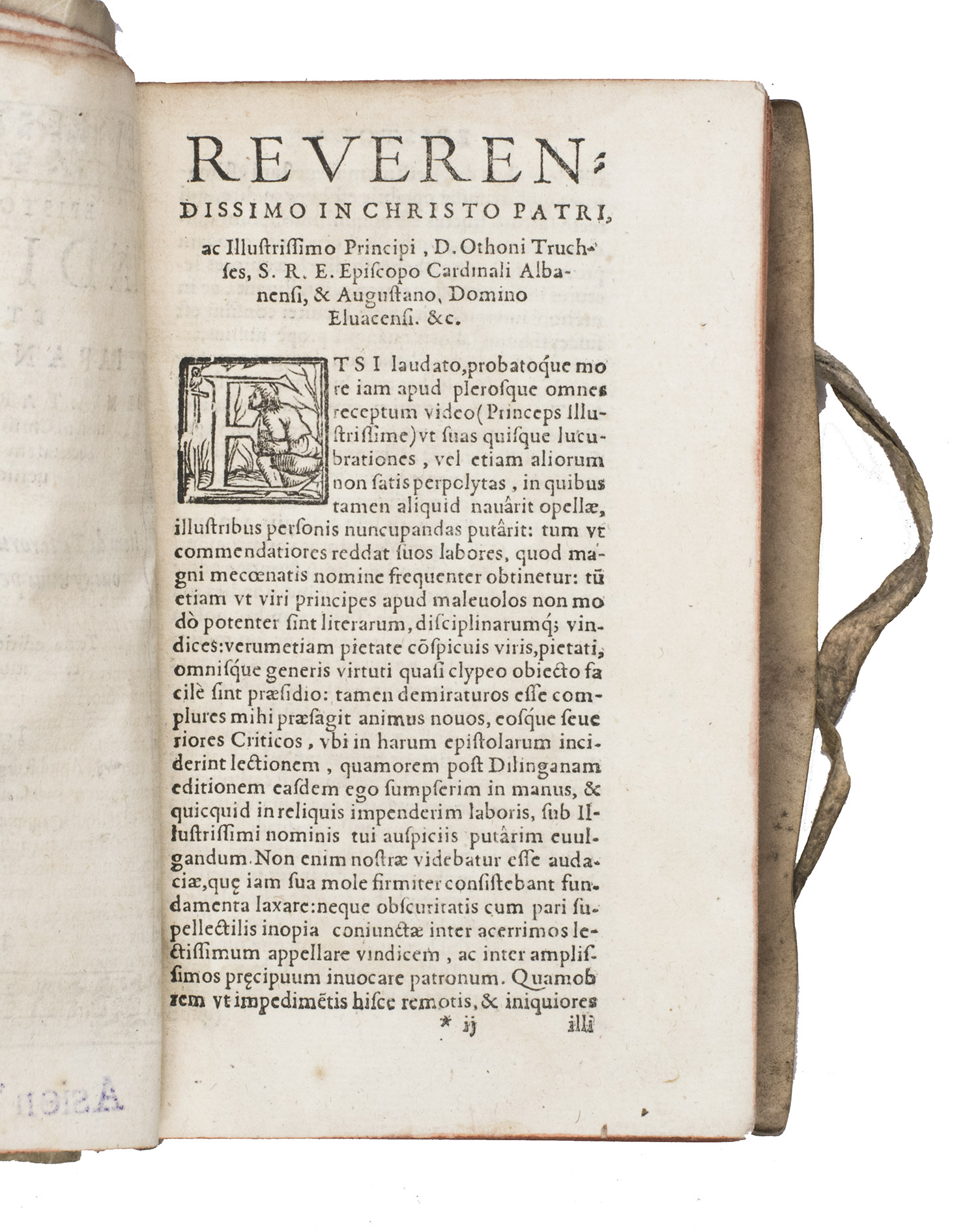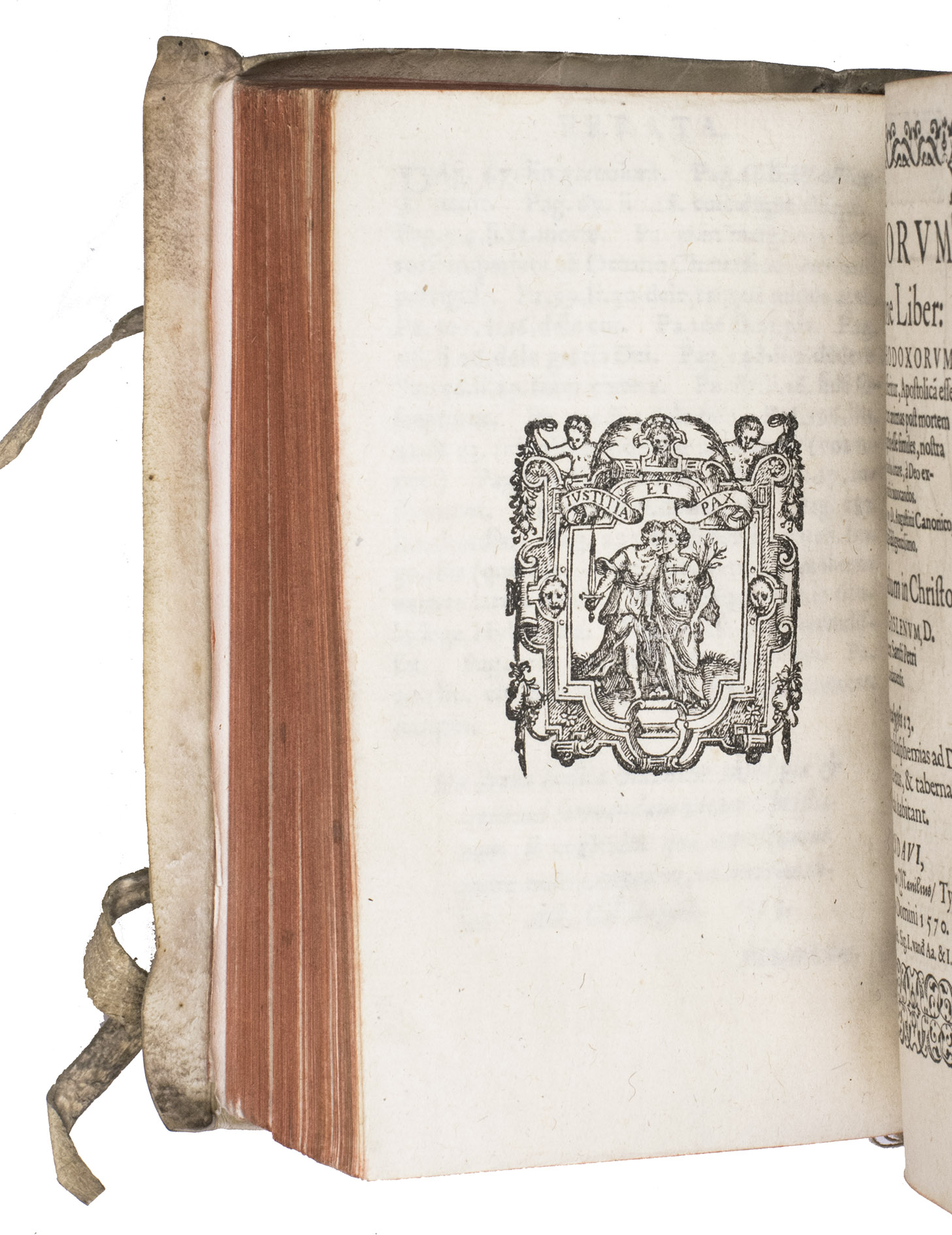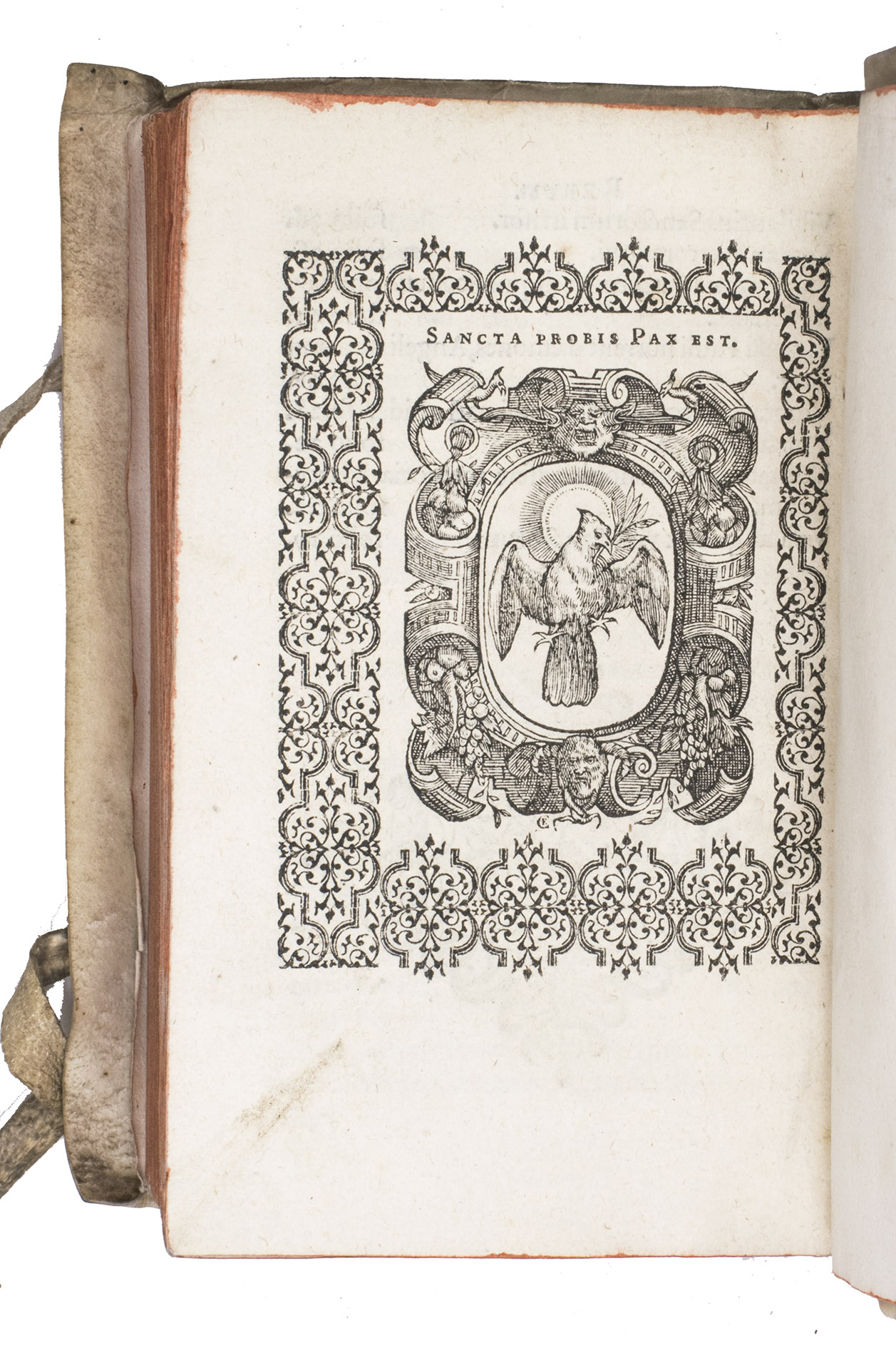 2 works in 1 volume. 8vo. Ad 1 with the title-page in a frame built up from fleurons, and a woodcut publisher's device on last blank, ad 2 with the title-page in a frame built up from fleurons, the woodcut coat-of-arms of Cunerus Petri (bishop of Leeuwarden) on the back of the title-page and on the last leaf a woodcut printer's device within a frame built up from fleurons.