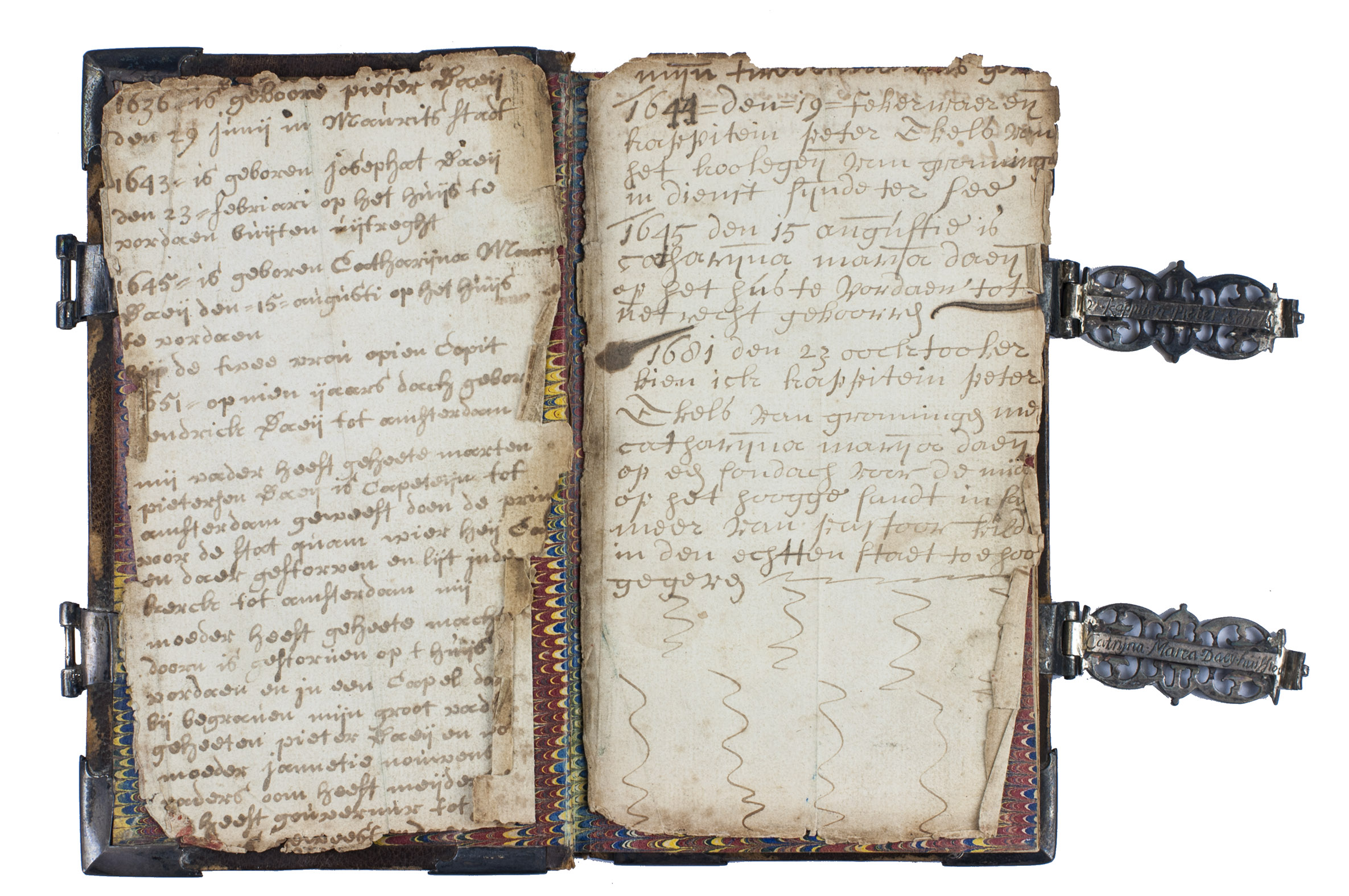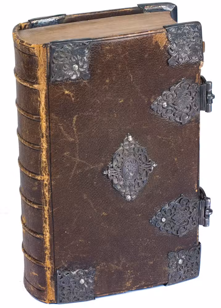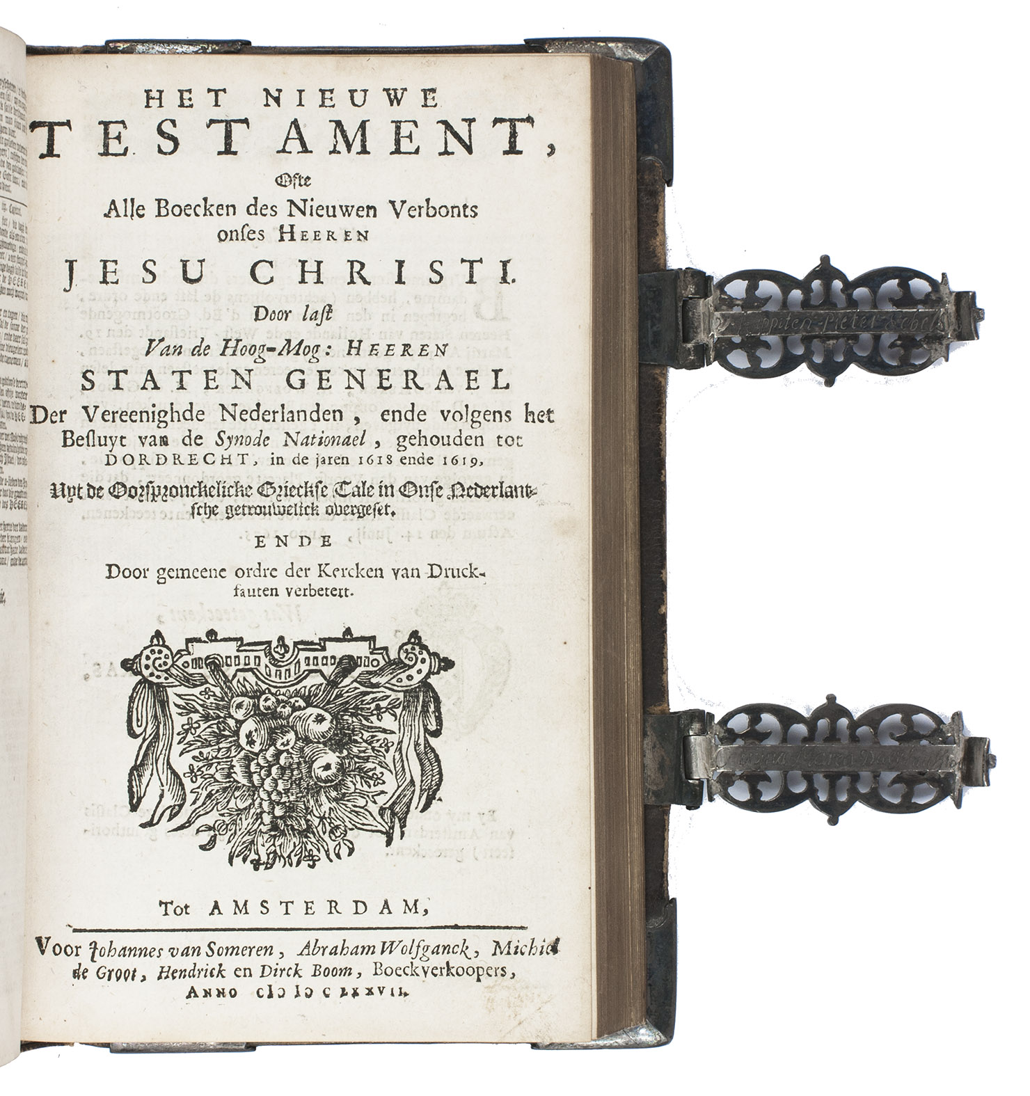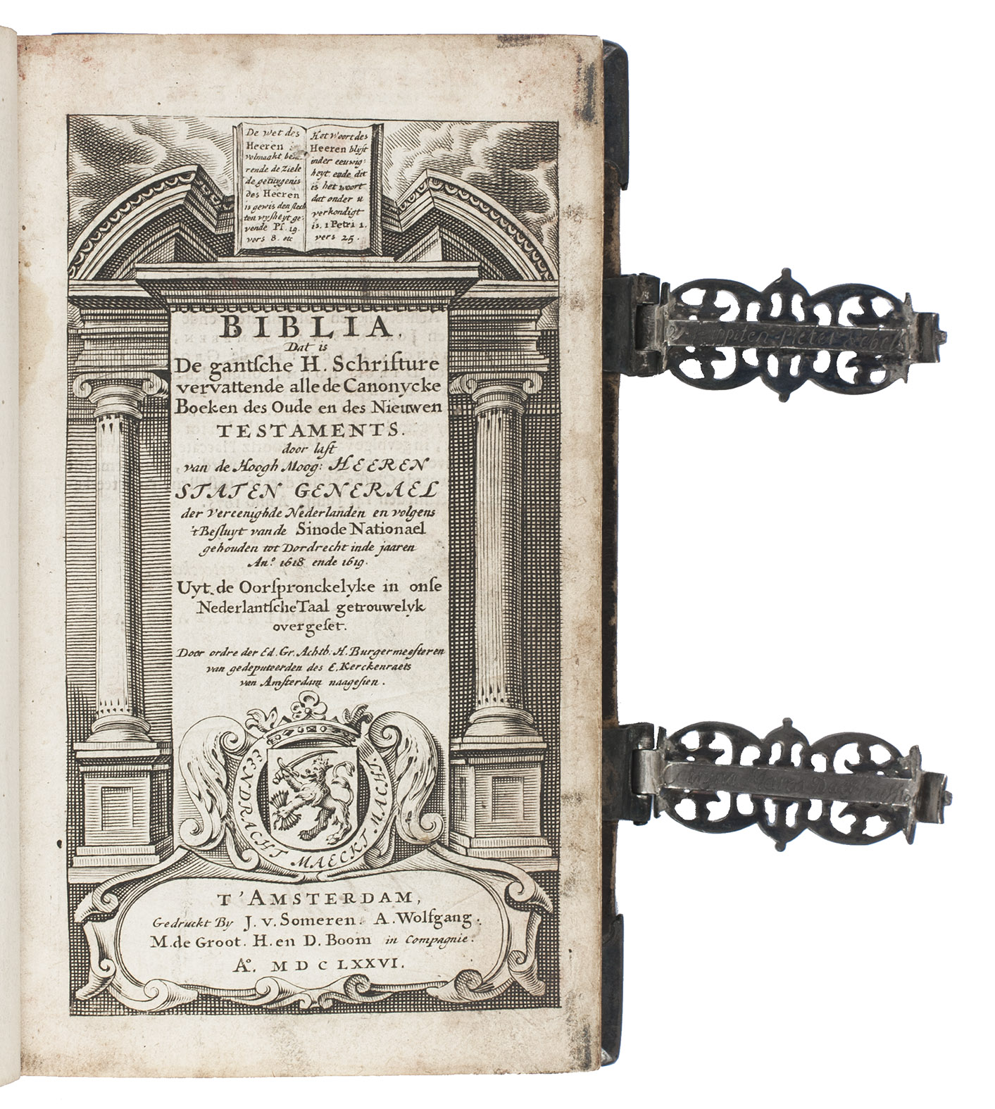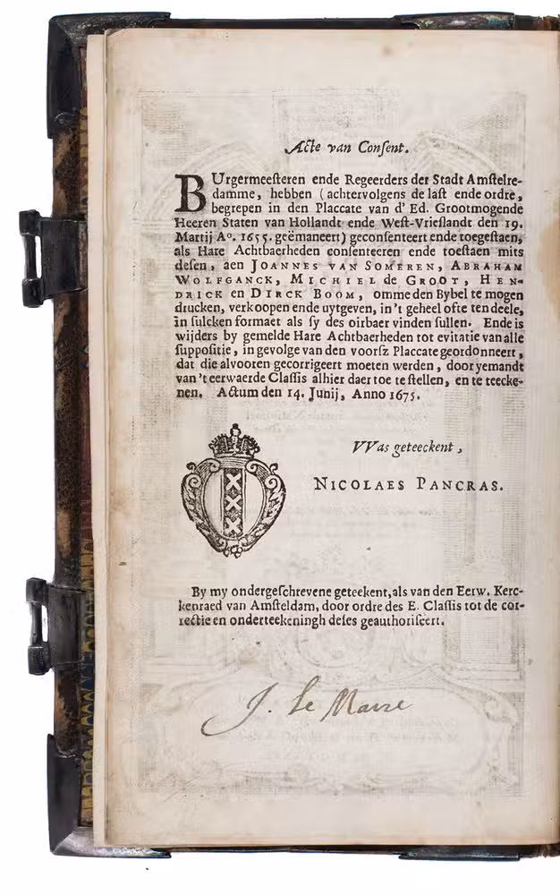 Very scarce, early edition of the Dutch States Bible as published by the Amsterdam publisher's "company" of Joannes van Someren, Abraham Wolfgang, Michiel de Groot, and Hendrik and Dirk Boom. The present copy presumably was a gift to Catharina Maria Daey (1645-in or after 1689) on the occasion of her marriage in October 1681 to Captain Peter Ebels (1644-in or after 1689 in 1681. Their names are engraved on the inside of the silver clasps. Together they had 6 children. Peter Ebels was Catharina Maria's second husband, she was married to Hermannus Folckers (ca. 1639-1680) from 1664 until his death and the pair had 3 children.