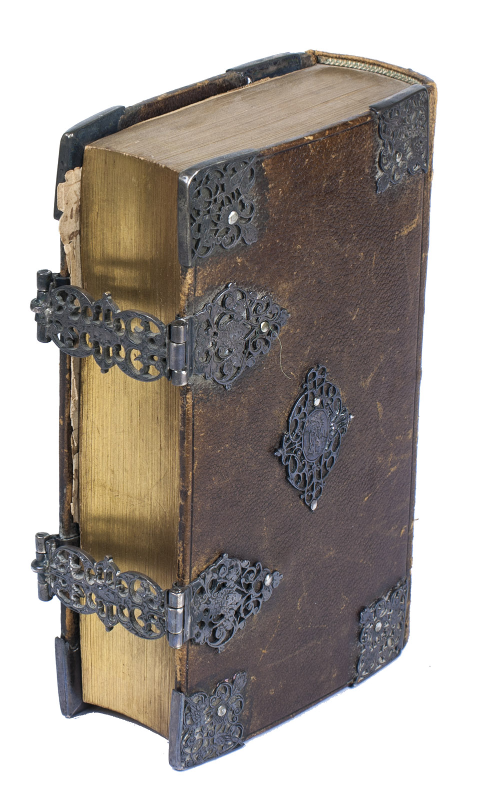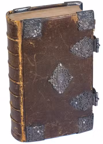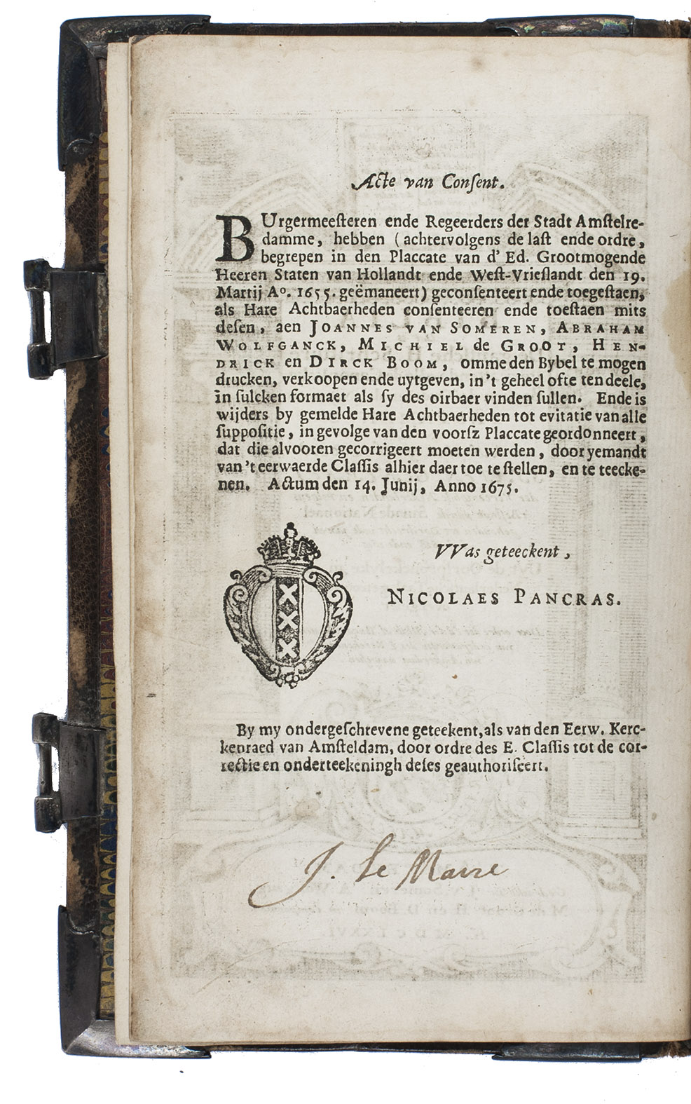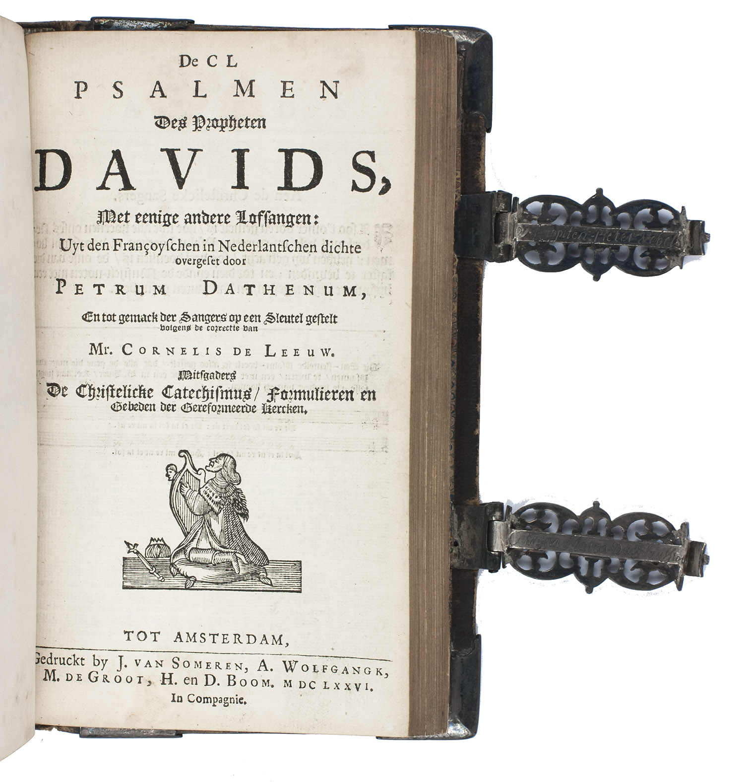 Amsterdam, Johannes van Someren, Abraham Wolfgang, Michiel de Groot, Hendrick and Dirk Boom, 1676. 3 works in 1 volume. 8vo (15.3 x 9.3 cm). Ad 1 with an engraved general title page, the woodcut coat of arms of the city of Amsterdam on the verso of the title page, a small woodcut decorated initial , and a woodcut floral tailpiece. Ad 2 with a woodcut floral vignette on the title page, the woodcut coat of arms below the "acte van consent" on the verso of the title page, a woodcut headpiece and tailpiece, and 2 woodcut decorated initials. Ad 3 with a woodcut vignette on the title page, all psalms are accompanied by musical notation. Late 18th- or early 19th-century brown sheepskin with late 17th-century silver fittings, marbled endpapers, and gilt edges. 338; [2], "109" [= 107], [1 blank]; [98] ll.