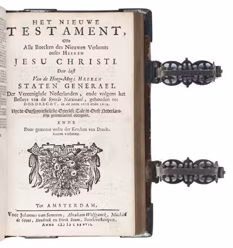 The present edition includes the New Testament and the 110 psalms of David, but does not include the apocrypha. It is the first or one of the earliest editions of the Dutch States Bible published by the "company" of Van Someren, Wolfgang, De Groot, and H. & D. Boom. It is very scarce, as barely any copies of this edition are known in institutions. WorldCat mentions 2 copies (one in the US and one in Australia), while the STCN does not list this 1676 edition of the work as a whole and only lists two copies (incl. 1 incomplete) of the New Testament and only 1 of the Psalms.