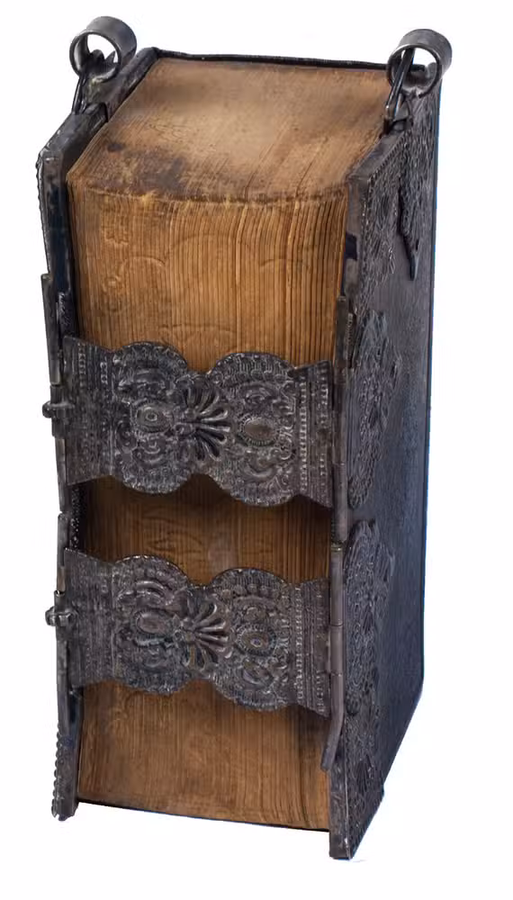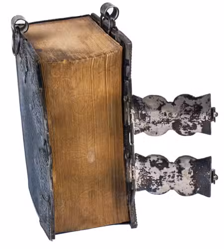 With letterpress-printed music notes for the psalms. 3 works in 1 volume. 8vo. 20th-century so-called sharkskin with several elaborate silver-plated fittings, (large cornerpieces on both sides, two cord rings on the head intended to secure a carrying cord or chain, two large clasps: one inscribed "J.R.M." and the other dated "1932", catch-plates), gilt and gauffered edges. [1], 416; 126; 132 ff.