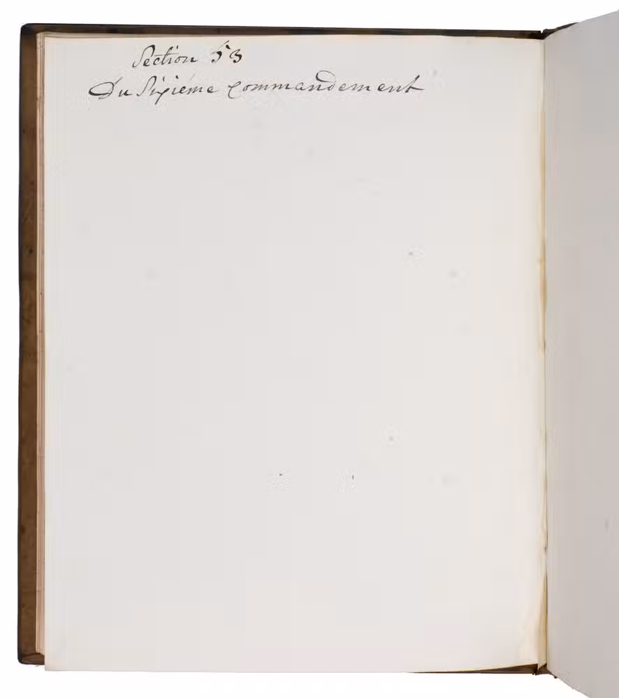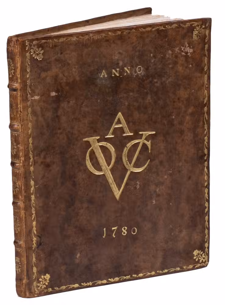 [The Netherlands?, ca. 1780?]. 4to (ca. 19 x 15 cm). Manuscript in French, written in black ink on paper, in a neat cursive script by one hand. With chapter divisions (numbered 39-75) and headings. The text is written upside down in relation to the binding. Most leaves show an identical watermark, depicting a lion rampant on a pedestal with "Vryheyt" in a crowned ring with "Pro Patria Eiusque Libertate" and the letters "CR" below, which is very close to Heawood 3149 (date: 1753). Late 18th-century gold-tooled brown mottled calf, sewn on 5 supports, bound by the so-called Acorn-and-Foliage Tool Bindery in Amsterdam (Storm van Leeuwen). Both boards show the large gold-tooled monogram of the Amsterdam chamber of the VOC as a centre piece sandwiched between the gold-tooled date "Anno 1780", all within a gold-tooled floral frame with floral corner pieces in the inside corners, spine gold-tooled in six compartments, red sprinkled edges. [28] ll.