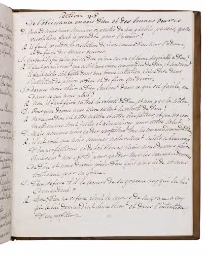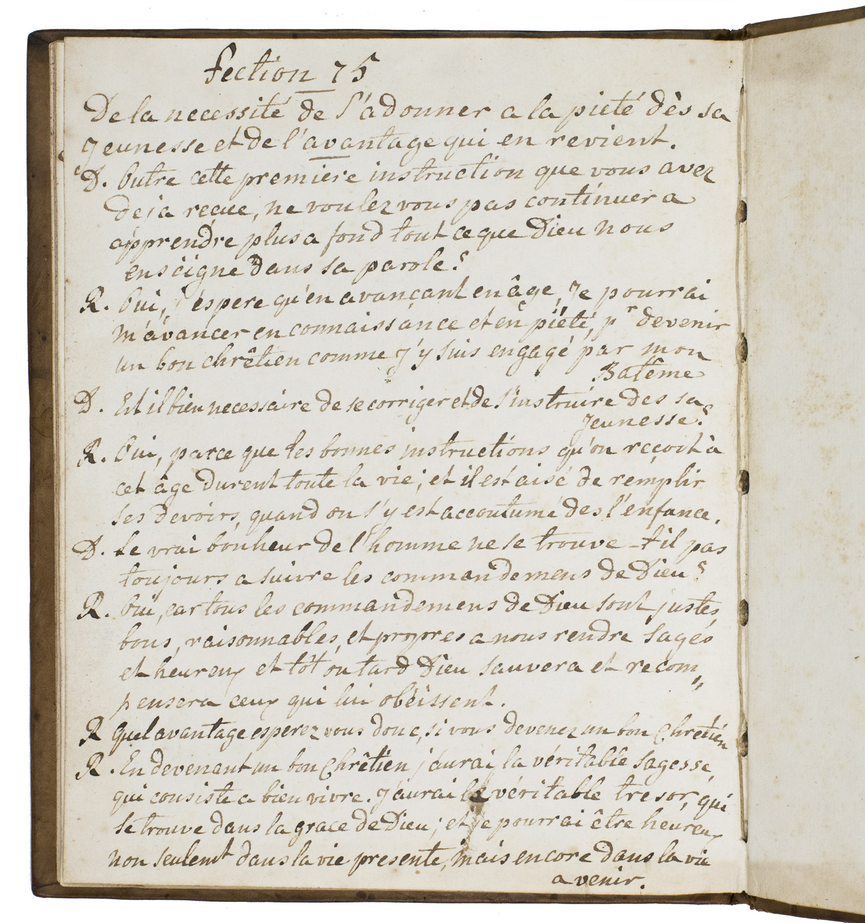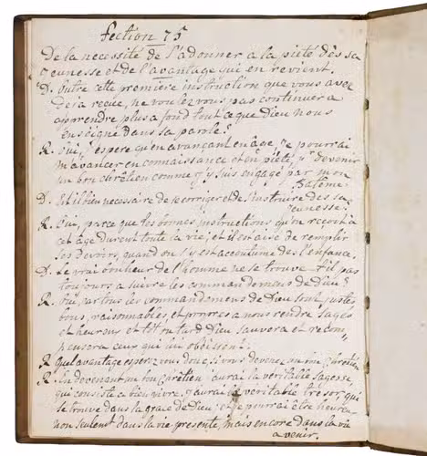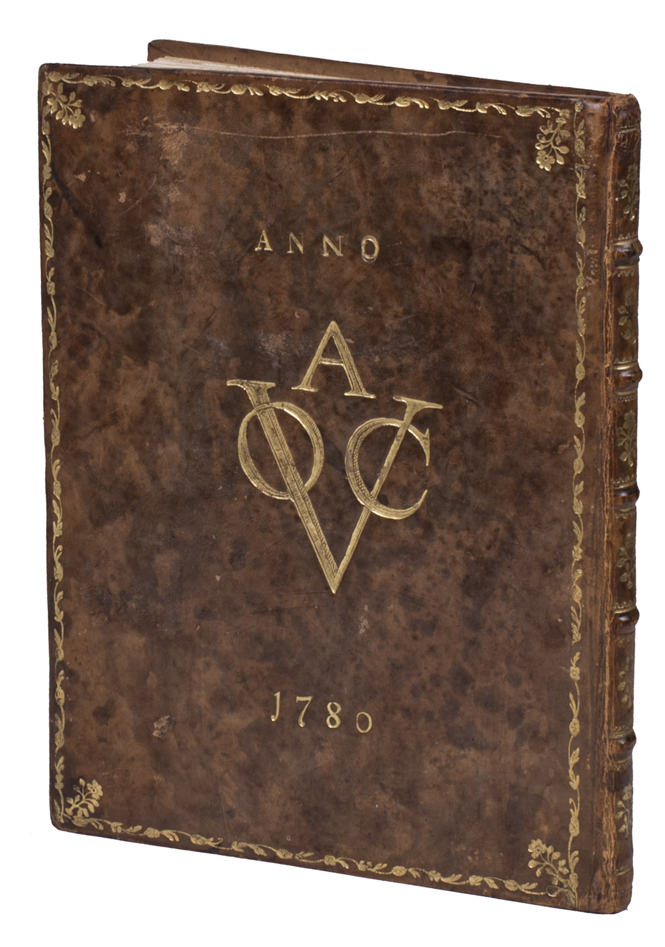 Late 18th-century manuscript copy of a French childrens catechism by the Swiss theologian Jacob Vernet (1698-1789), bound in a remarkable late 18th-century binding, originally produced for the Amsterdam Chamber of the Dutch East India Company (VOC) by the so-called Acorn-and-Foliage Tool Bindery which was active between ca. 1760 and ca. 1784 (Storm van Leeuwen).It shows the large monogram of the Amsterdam Chamber of the VOC sandwiched between the date "Anno 1780" on both boards. These bindings were usually commissioned as gifts to persons important to the VOC, often containing an almanac for the relevant year but possibly also produced as blank notebooks. The present work comprises chapters 39-49 and 58-75 of Vernet's work, which form almost the second half of printed editions. The chapters included in the present work are complete and exactly follow the order of the printed text in the Geneva 1742 edition (pp. 75-140, checked using a digital copy) with a slightly different spelling and replacing some words. For unclear reasons, chapters 50-57 (dealing with the fourth through tenth commandment) have not been copied and several leaves between the end of chapter 49 and the beginning of chapter 58 have been left blank.