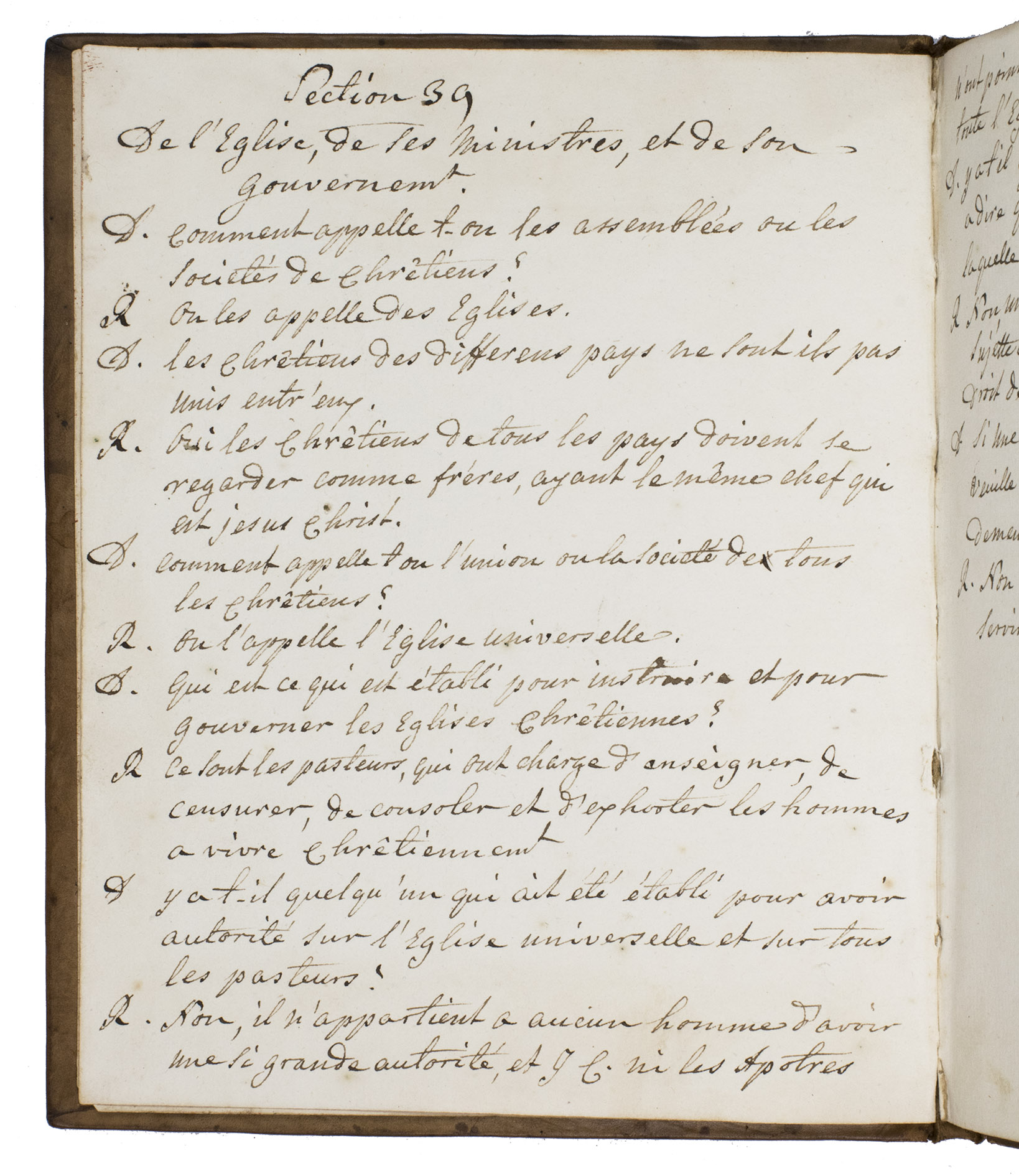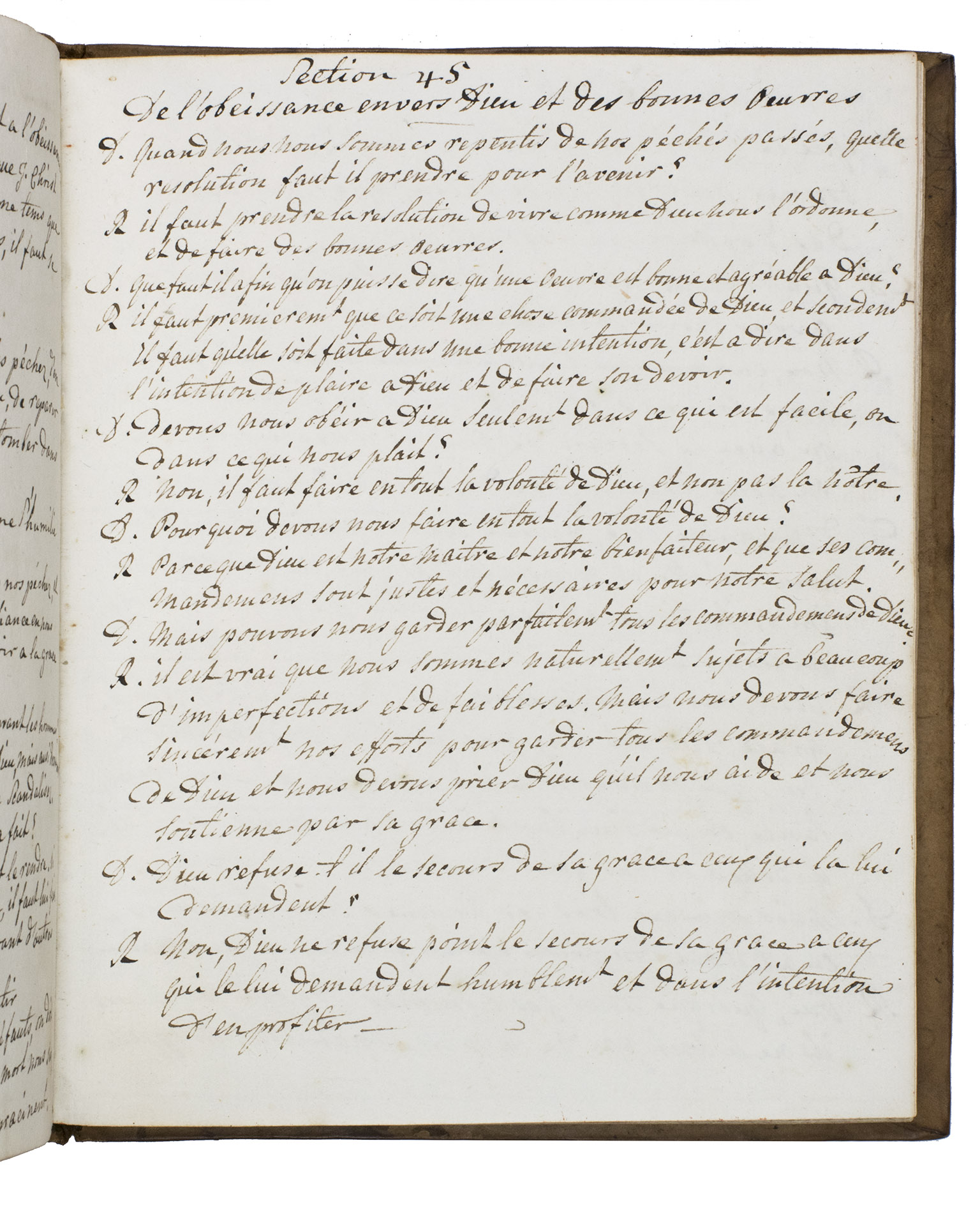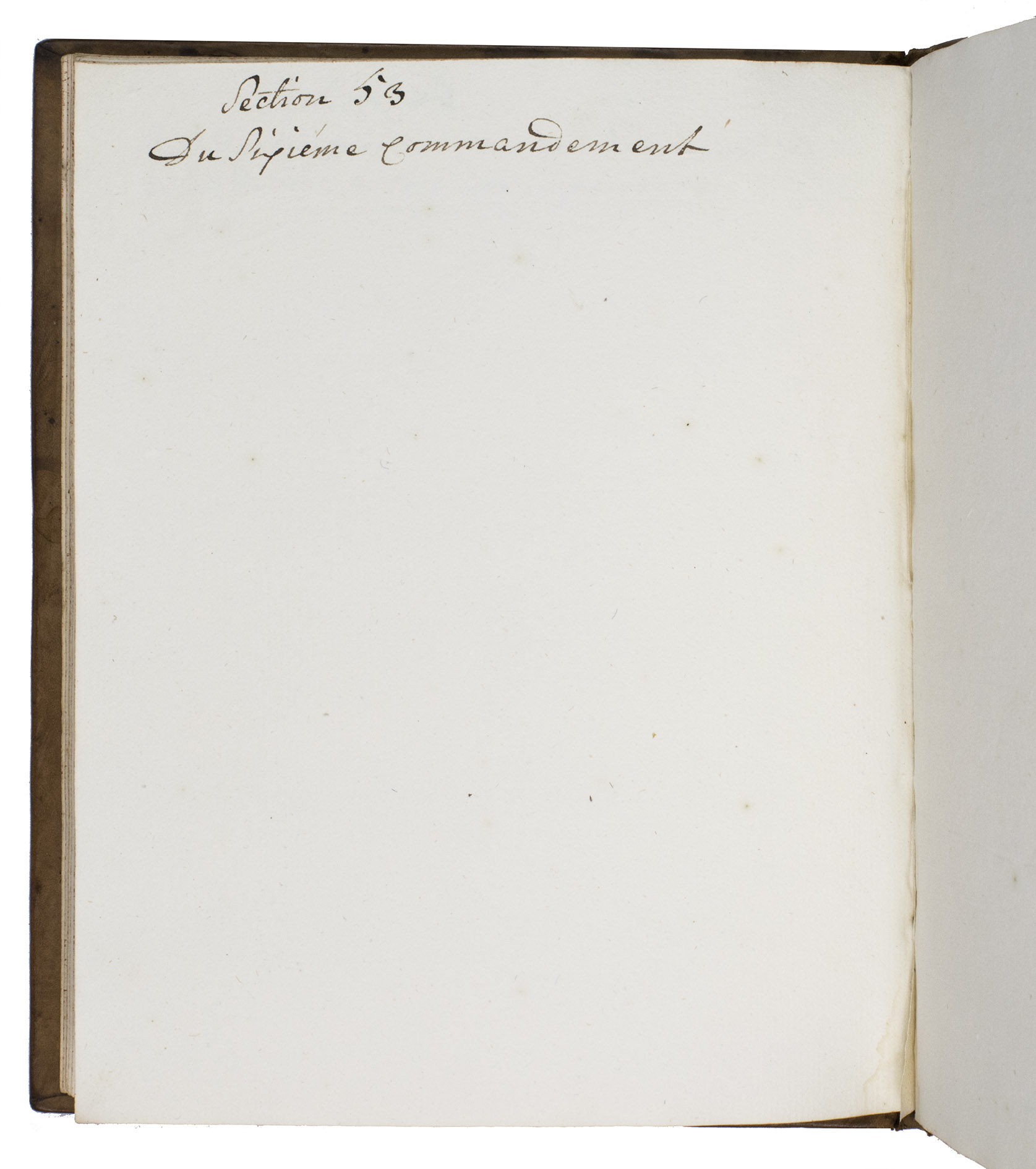 Late 18th-century manuscript copy of a French childrens catechism by the Swiss theologian Jacob Vernet (1698-1789), bound in a remarkable late 18th-century binding, originally produced for the Amsterdam Chamber of the Dutch East India Company (VOC) by the so-called Acorn-and-Foliage Tool Bindery which was active between ca. 1760 and ca. 1784 (Storm van Leeuwen).It shows the large monogram of the Amsterdam Chamber of the VOC sandwiched between the date "Anno 1780" on both boards. These bindings were usually commissioned as gifts to persons important to the VOC, often containing an almanac for the relevant year but possibly also produced as blank notebooks. The present work comprises chapters 39-49 and 58-75 of Vernet's work, which form almost the second half of printed editions. The chapters included in the present work are complete and exactly follow the order of the printed text in the Geneva 1742 edition (pp. 75-140, checked using a digital copy) with a slightly different spelling and replacing some words. For unclear reasons, chapters 50-57 (dealing with the fourth through tenth commandment) have not been copied and several leaves between the end of chapter 49 and the beginning of chapter 58 have been left blank.