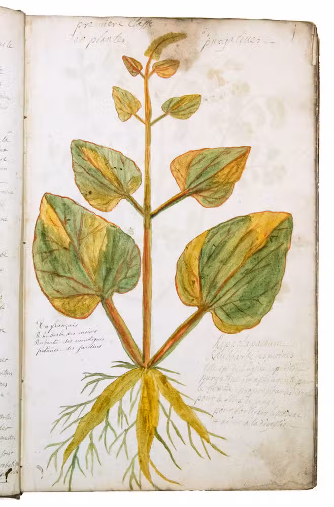 [France], 1742. Large folio (ca. 45 x 28 cm). With 423 botanical drawings in bright watercolour. Manuscript with French text (including Latin names of the depicted plants), written in an 18th-century cursive hand. Most leaves contain a "Strasbourg bend" watermark: a fleur-de-lis above a shield with a diagonal band and the countermark "L Laroche" (identical to Heawood 65, but erroneously listed by him as "I Laroche", date: 1718-1721). The French papermaker Léonard Laroche (1646-1721) was active in the French province of Angoumois (now Charente) in the period 1673-1721.