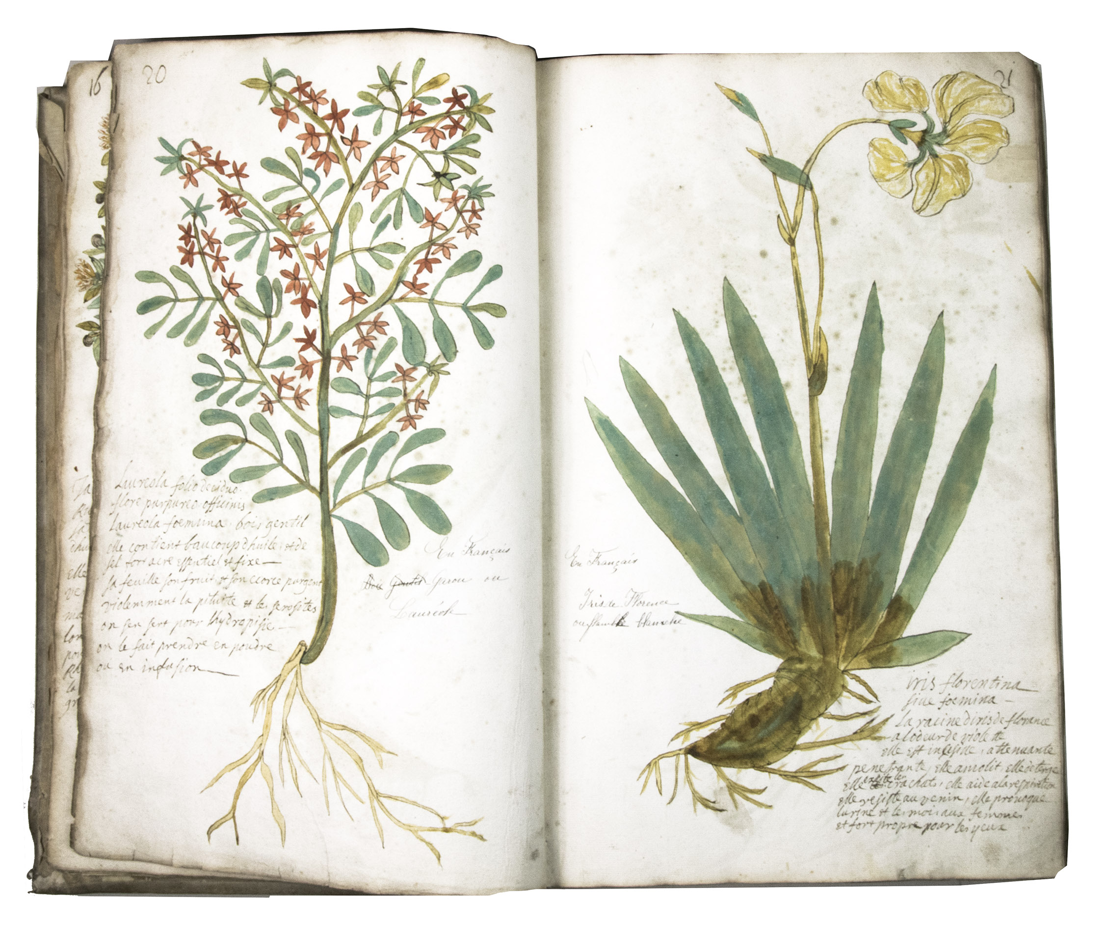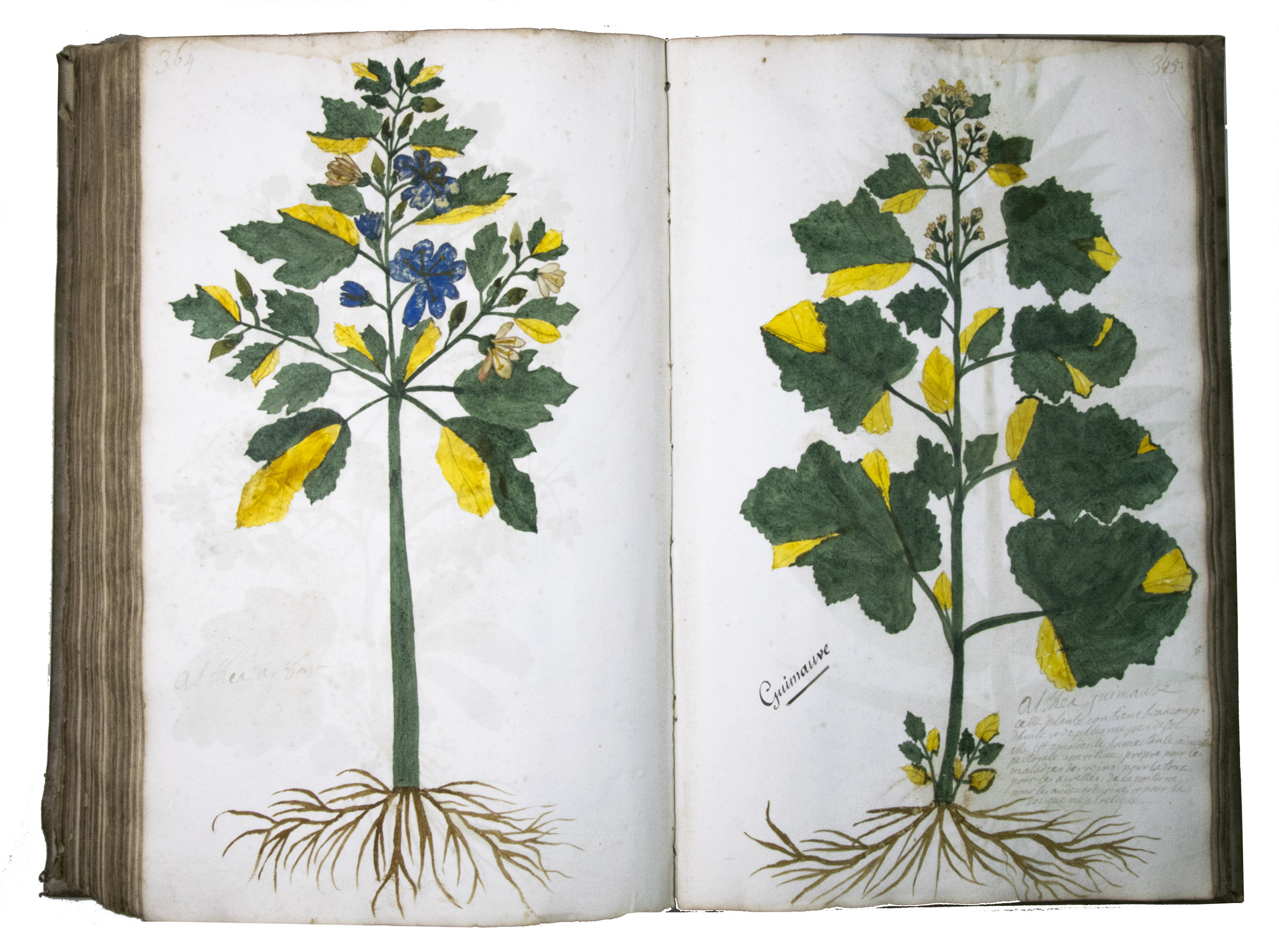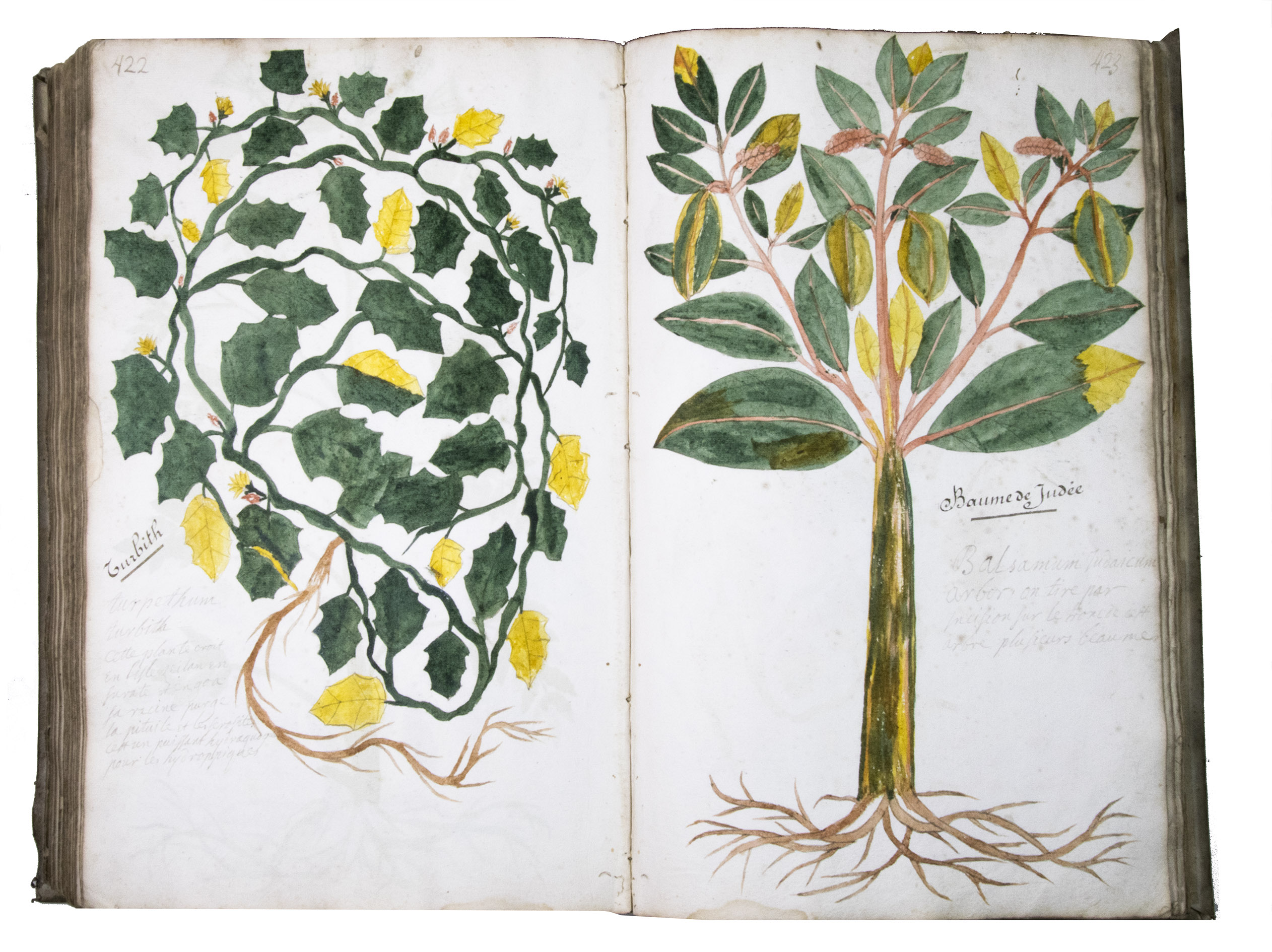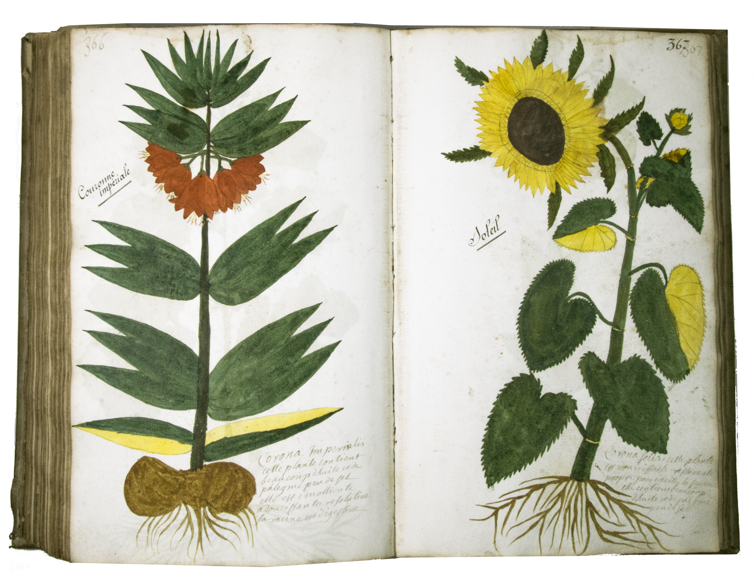 This manuscript is illustrated with 423 watercolour drawings, all numbered in black ink in the top right or top left corner. They show various flowering plants, herbs, trees and their fruits, indigenous to France as well as exotic. Their names are supplied in French and Latin, followed by a brief description in French. In the 19th-century, another hand added the French botanical names in black ink (including three in purple ink) to most plants depicted and partly renumbered the pages in black ink.