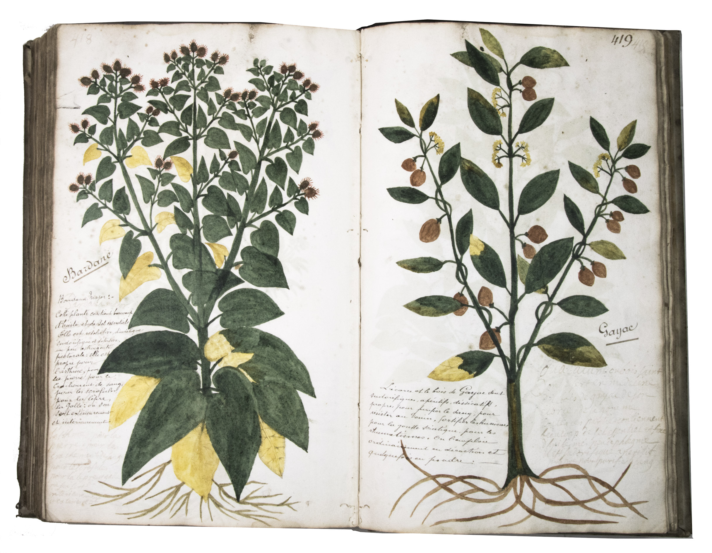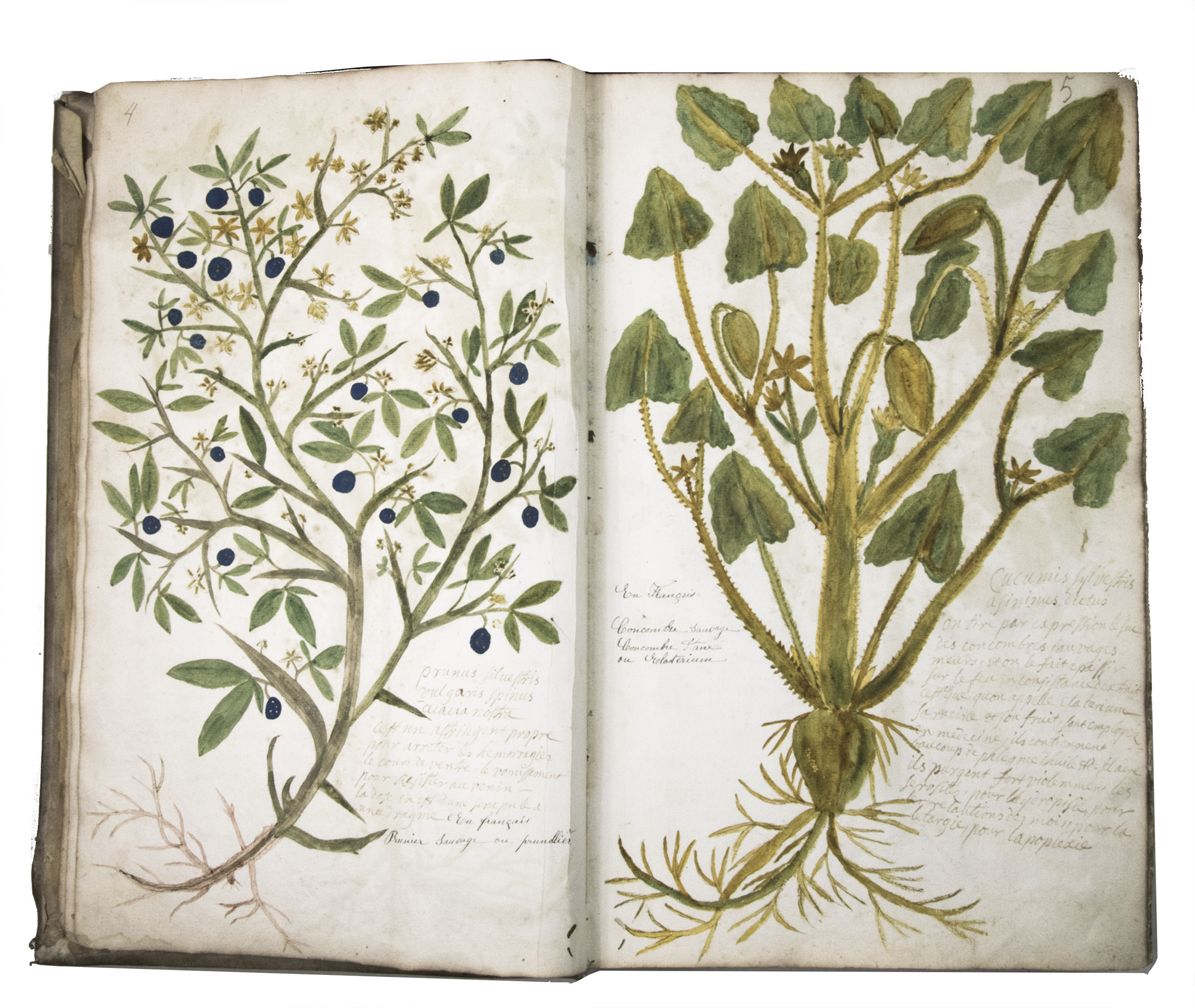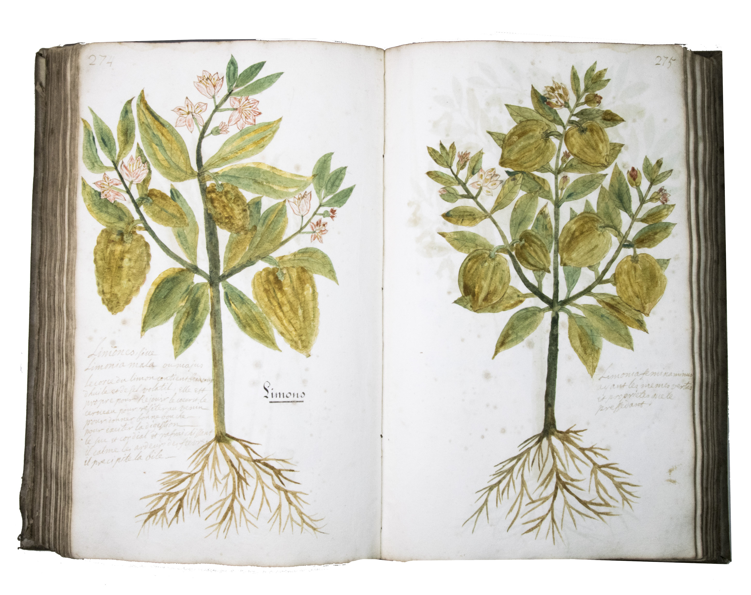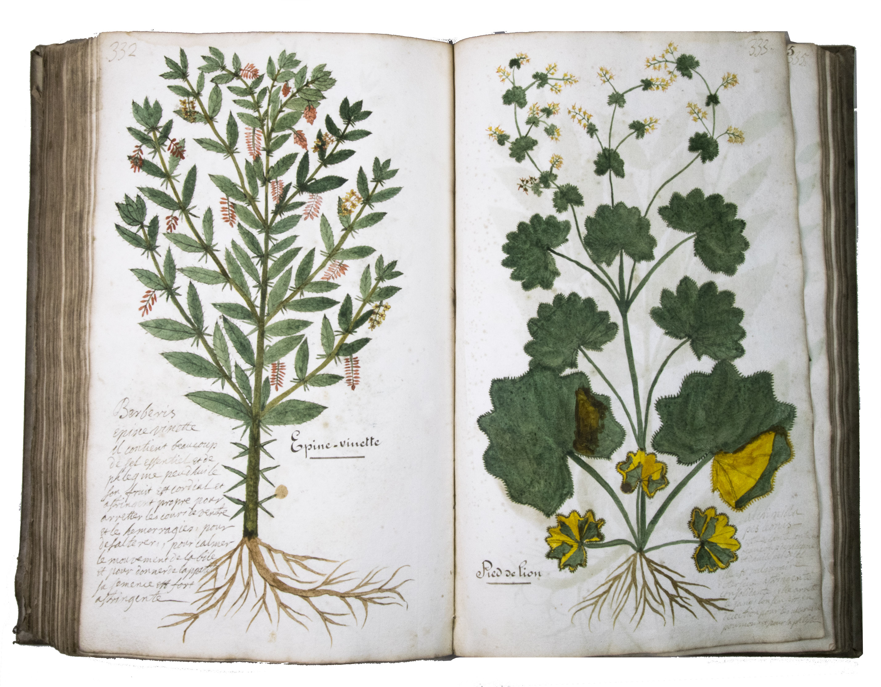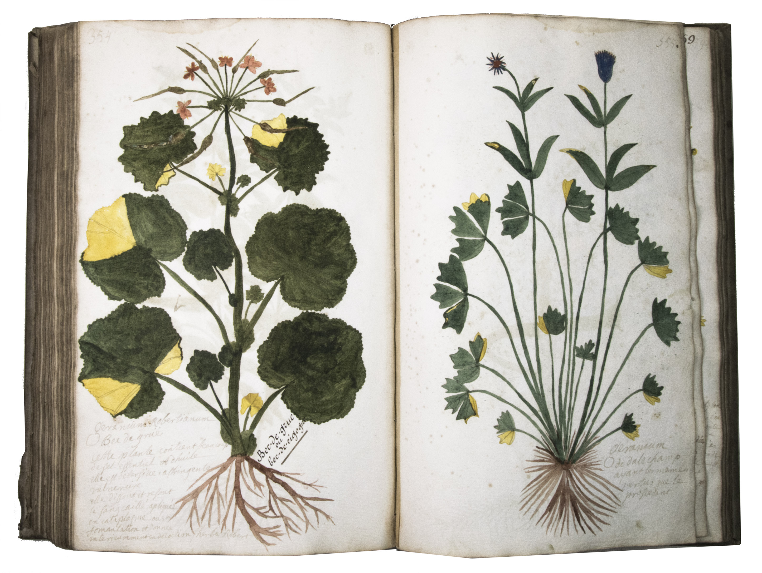 This manuscript is illustrated with 423 watercolour drawings, all numbered in black ink in the top right or top left corner. They show various flowering plants, herbs, trees and their fruits, indigenous to France as well as exotic. Their names are supplied in French and Latin, followed by a brief description in French. In the 19th-century, another hand added the French botanical names in black ink (including three in purple ink) to most plants depicted and partly renumbered the pages in black ink.