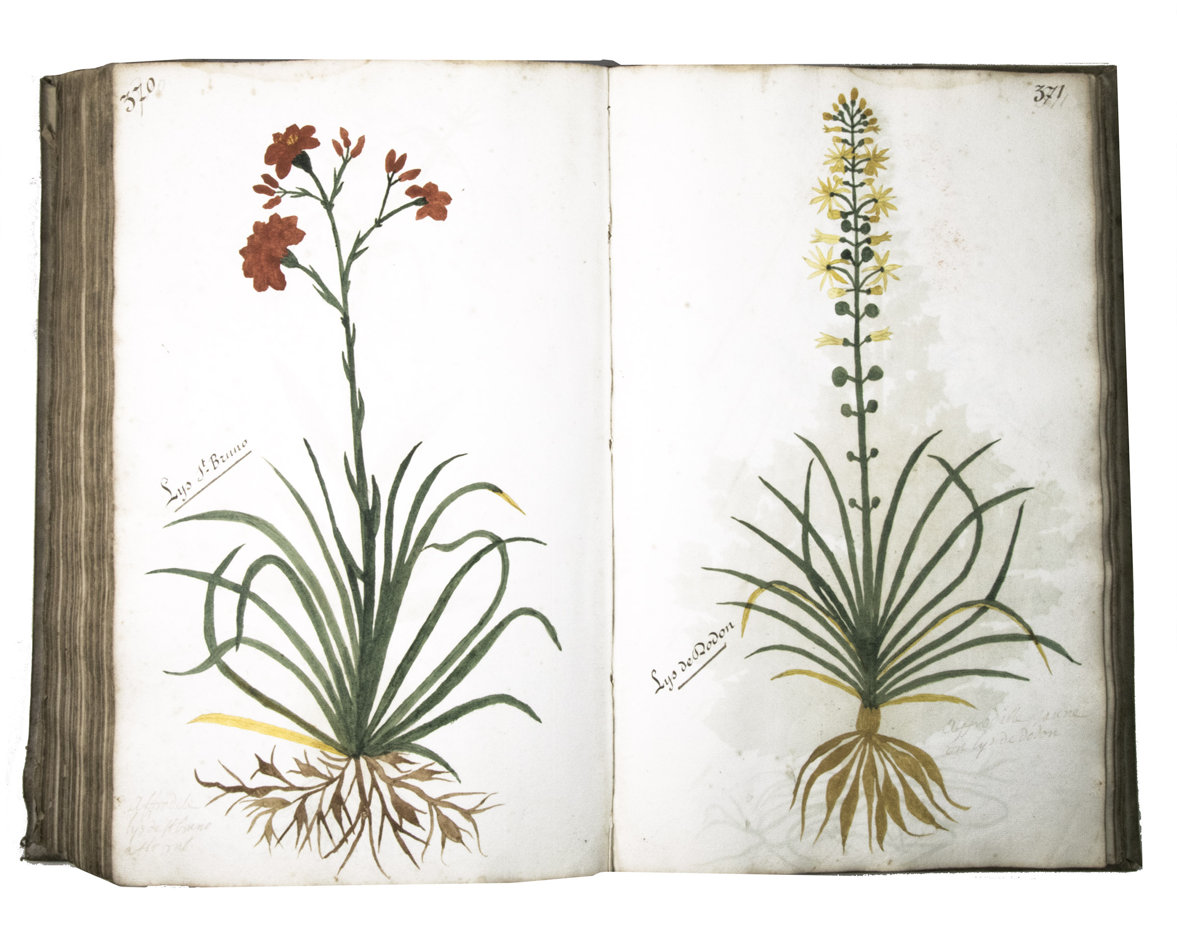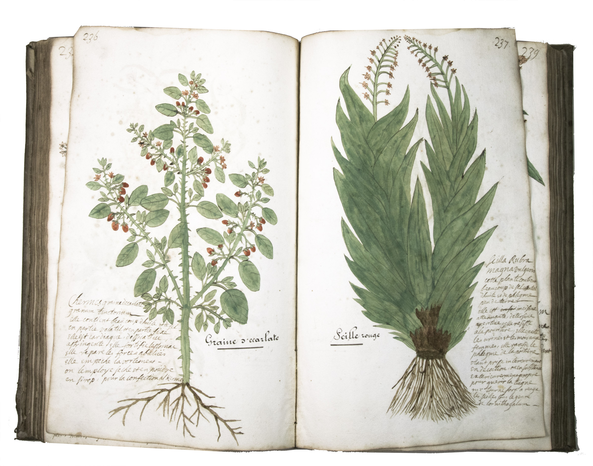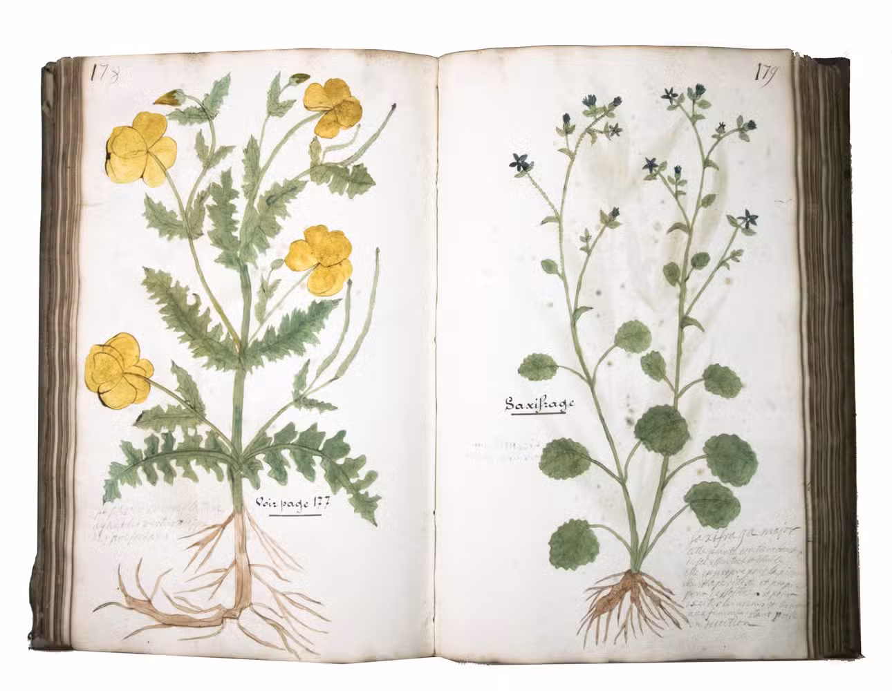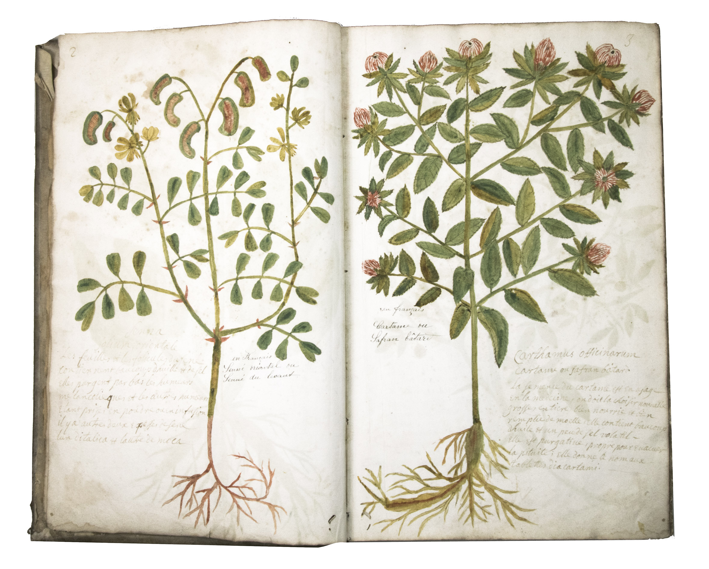 This manuscript is illustrated with 423 watercolour drawings, all numbered in black ink in the top right or top left corner. They show various flowering plants, herbs, trees and their fruits, indigenous to France as well as exotic. Their names are supplied in French and Latin, followed by a brief description in French. In the 19th-century, another hand added the French botanical names in black ink (including three in purple ink) to most plants depicted and partly renumbered the pages in black ink.