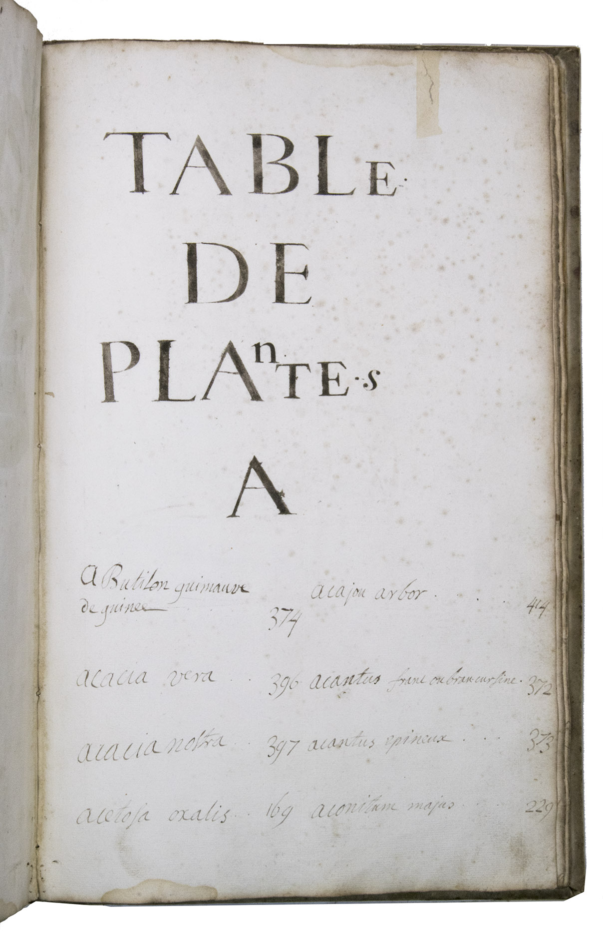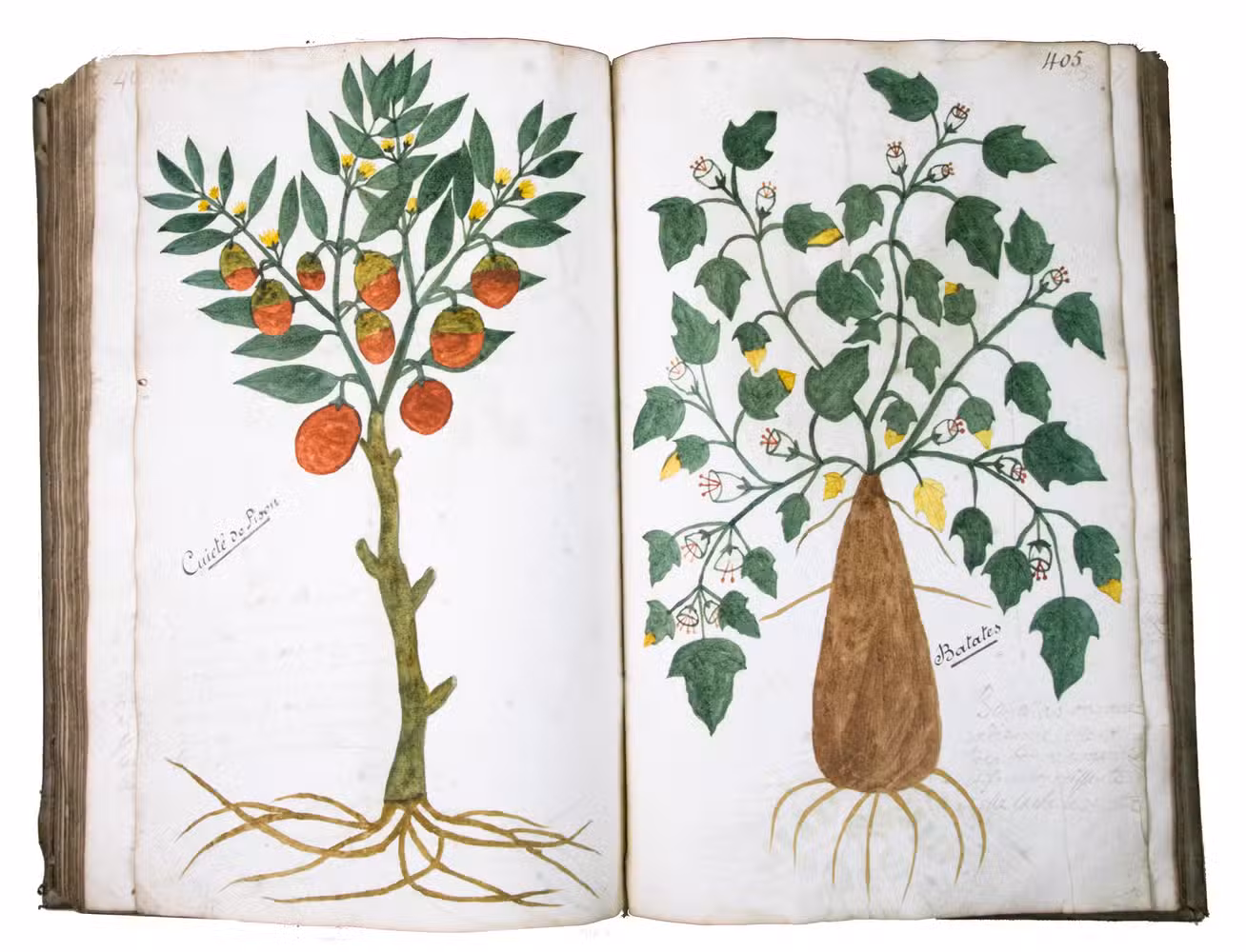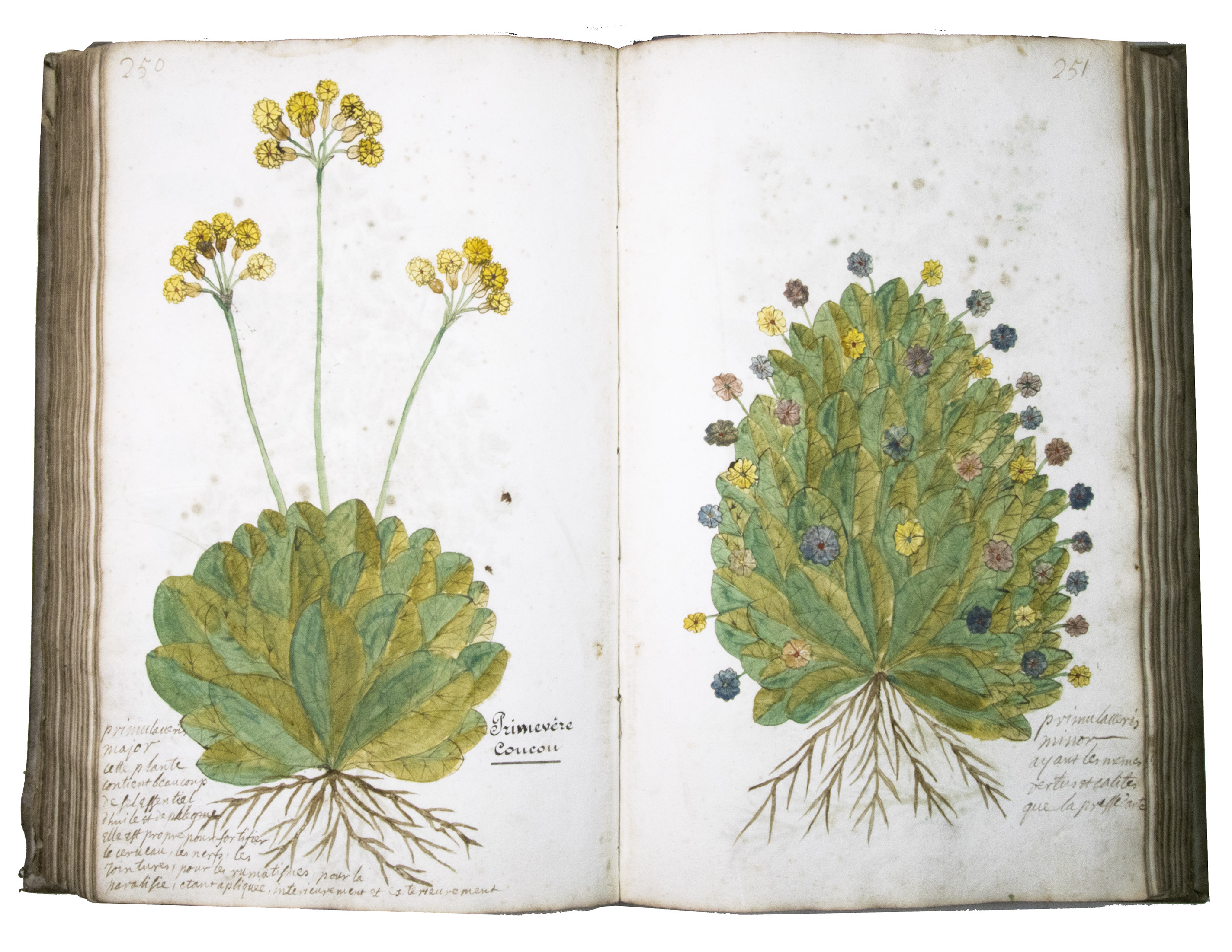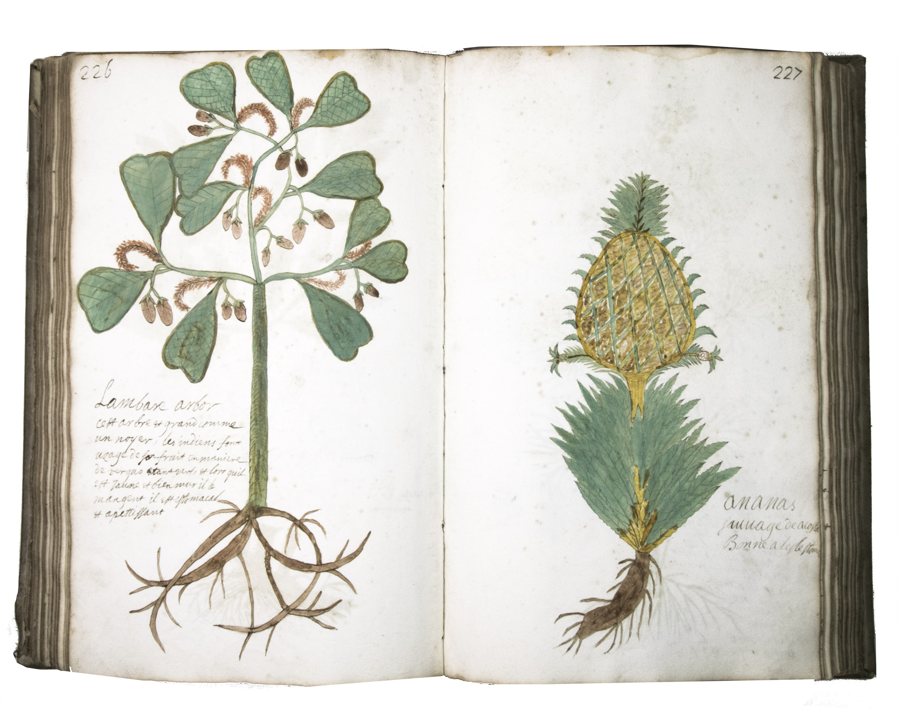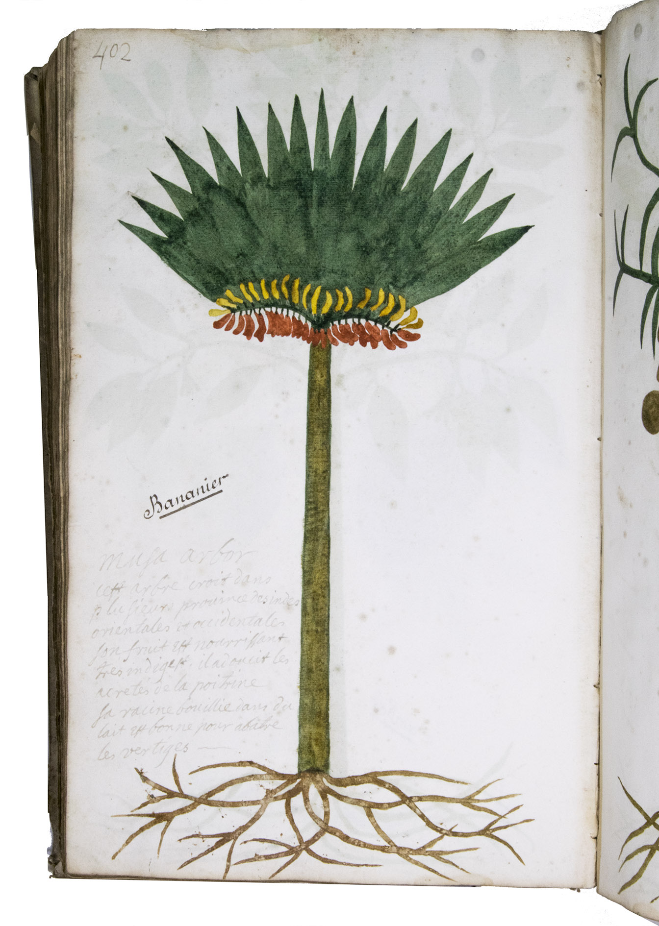 This manuscript is illustrated with 423 watercolour drawings, all numbered in black ink in the top right or top left corner. They show various flowering plants, herbs, trees and their fruits, indigenous to France as well as exotic. Their names are supplied in French and Latin, followed by a brief description in French. In the 19th-century, another hand added the French botanical names in black ink (including three in purple ink) to most plants depicted and partly renumbered the pages in black ink.