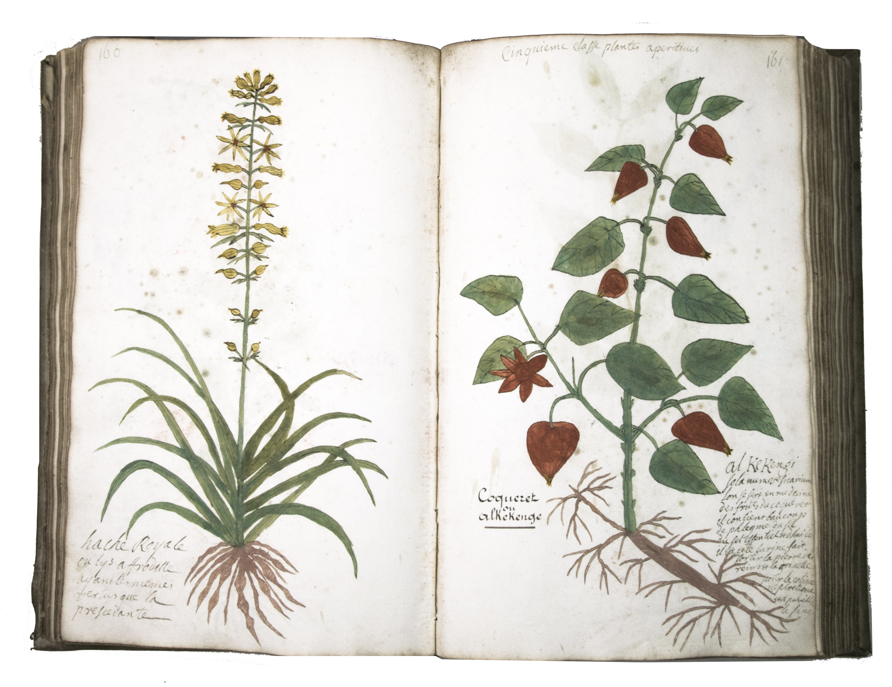 The manuscript includes plants gathered from the New World, and based on some references - the author was possibly familiar with the works of the Portuguese physician and botanist Cristóbal Acosta (ca. 1525-ca. 1594), the French physician and botanist Jacques Daléchamps (1513-1588), the Flemish physician and botanist Mathias de Lobel (Lobelius, 1538-1616) and the Italian physician and botanist Pietro Andrea Gregorio Mattioli (1501-ca. 1578). The manuscript, including the drawings, is divided into 10 classes, each comprising 40 species, only the tenth and final class comprises 63 species. The author added 10 divisional titles, written in the head margin of respectively p. 1: premiere classe des plantes purgatives (pp. 1-40), p. 41: Seconde classe plantes bechyques [= béchiques] ou pectorales (pp. 41-80), p. 81: troisieme classe de plantes, Errhines ou sternutatoires et Salivantes (pp. 81-120), p. 121: quatrieme classe plantes histeriques (pp. 121-160), p. 161: Cinquieme classe plantes aperitives (pp. 161-200), of p. 201: Sixieme classe, plantes diaphoretiques et sudorifiques (pp. 201-240), p. 241: Septieme classe des plantes cephaliques (pp. 241-280), p. 281: huitieme classe, plantes febrifuges (pp. 281-320), p. 321: neuvieme classe, plantes alterantes et astringentes (pp. 321-360) and p. 361: Dixieme classe de plantes, seconde classe de plantes Emolientes (pp. 361-423). This classification largely corresponds to the structure of the early 18th-century botanical work Abrégé de lhistoire des plantes usuelles. Dans lequel on donne leurs noms differens, François & Latins ..., written by the French botanist Pierre Jean Baptiste Chomel (1671-1740). The first edition was published in 1712 (Paris, Charles Osmont) and reprinted many times until 1804. In 1739, a fifth revised edition appeared (comprising a supplement) and it is likely that this edition was consulted by Friar Luc David. In Chomel's work, the emphasis mainly lies on medicinal plants, and given the medical background of Friar Luc David, it is not surprising that he was particularly interested in the subject.