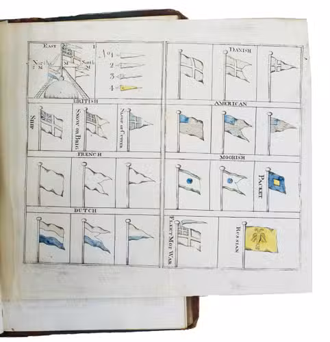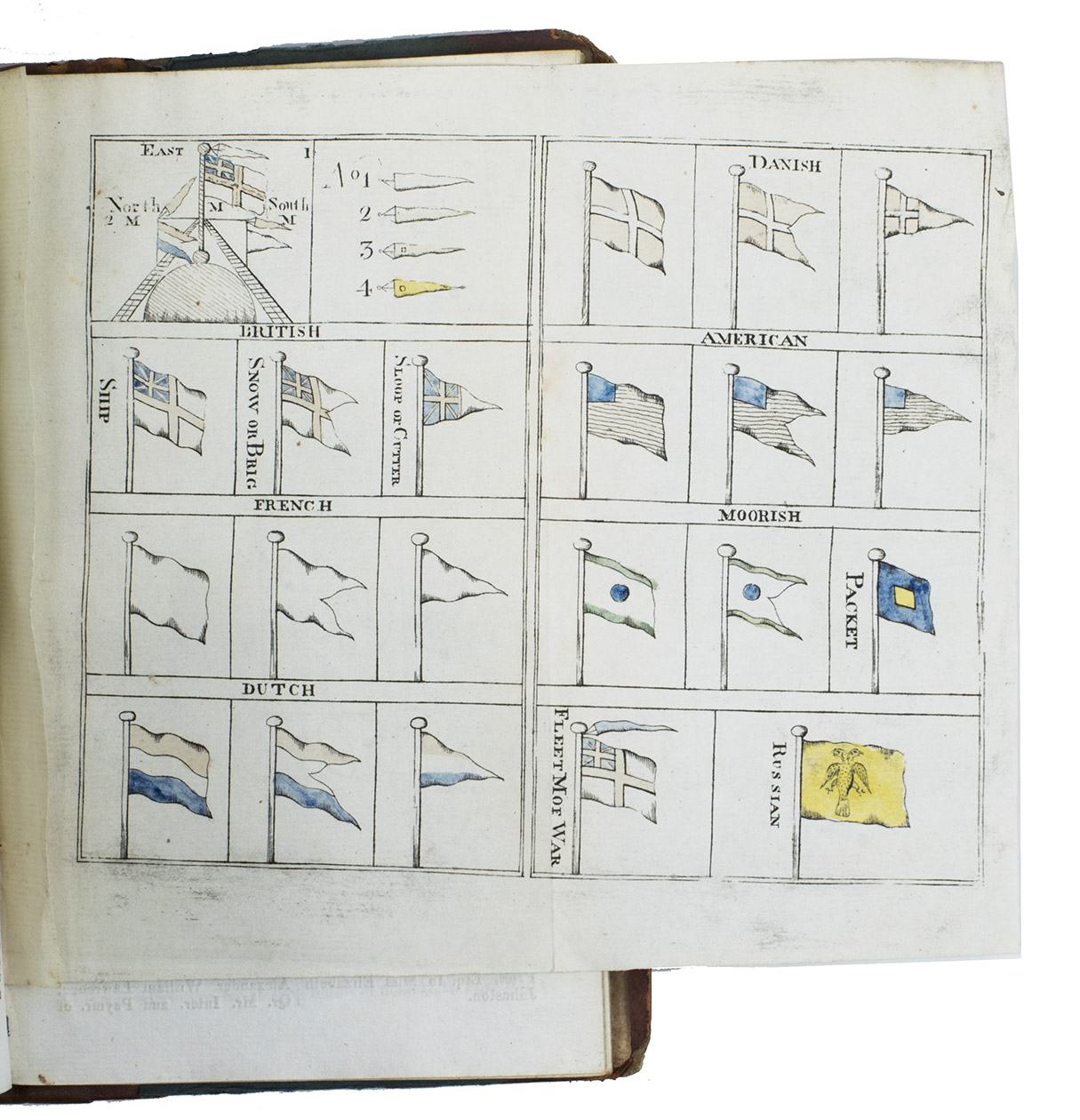 Madras, Asylum Press, [1828?]. 8vo. With 1 engraved hand-coloured folding plate showing different kinds of ships flags. Lacking 2 leaves.Contemporary red sheepskin, sprinkled edges. Rebacked in calf, red sheepskin spine label, blue paper pasted over the sides. [1 blank], [2], [1 blank], VI, 1-146, [2], 147-361, [1] blank, XXX, VIII pp. (lacking pp. 19-22).
