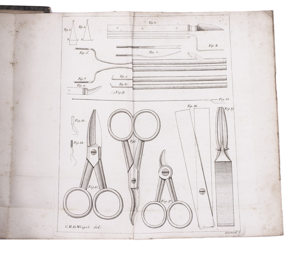 Greifswald, Anton Ferdinand Röse, 1785. With a folding engraved plate showing surgical instruments. 4 works in 1 volume. Small 4to (19.5 x 15 cm). 19th century boards. [1], [1 blank], [6], 76, [4]; 76, [4]; 28; [1], [1 blank], [4], 50 pp.