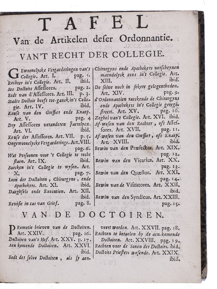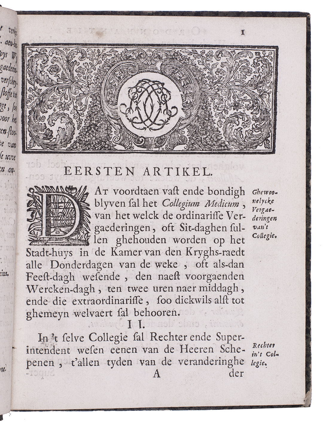Ad 1-2: Third edition, in Dutch, of the statutes of the Medical College of the city of Brussels, first published in 1650, bound with a second copy lacking the preliminaries.