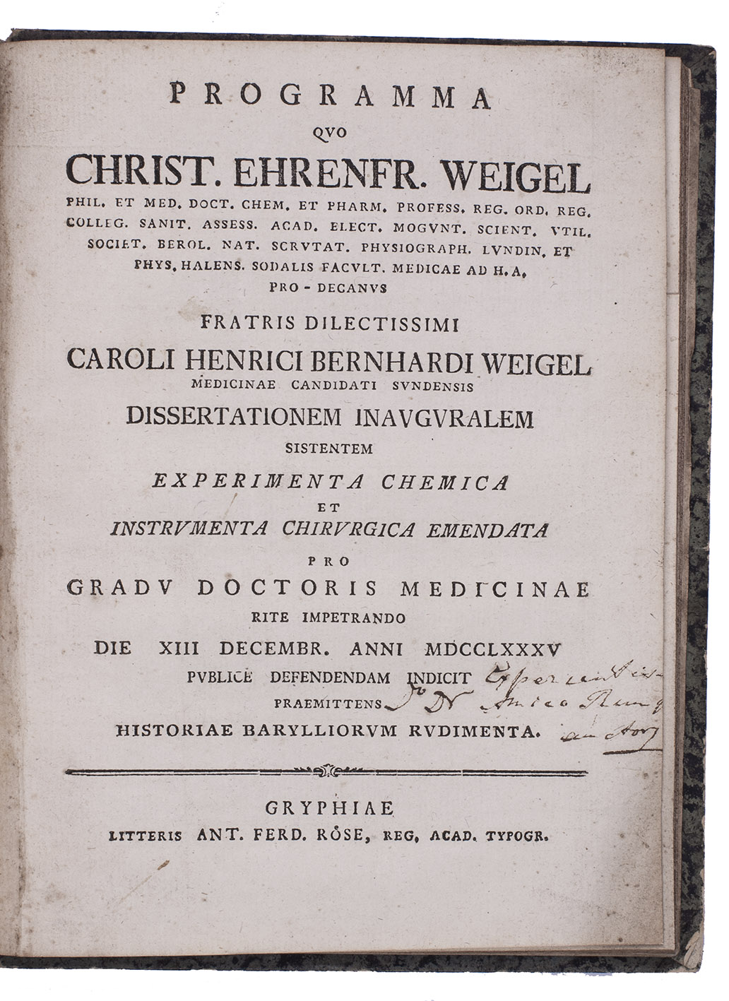 (4) WEIGEL, Christian Ehrenfried and Karl Heinrich Bernhard WEIGEL. Dissertatio inauguralis sistens experimenta chemica et instrumenta chirurgica emendata.