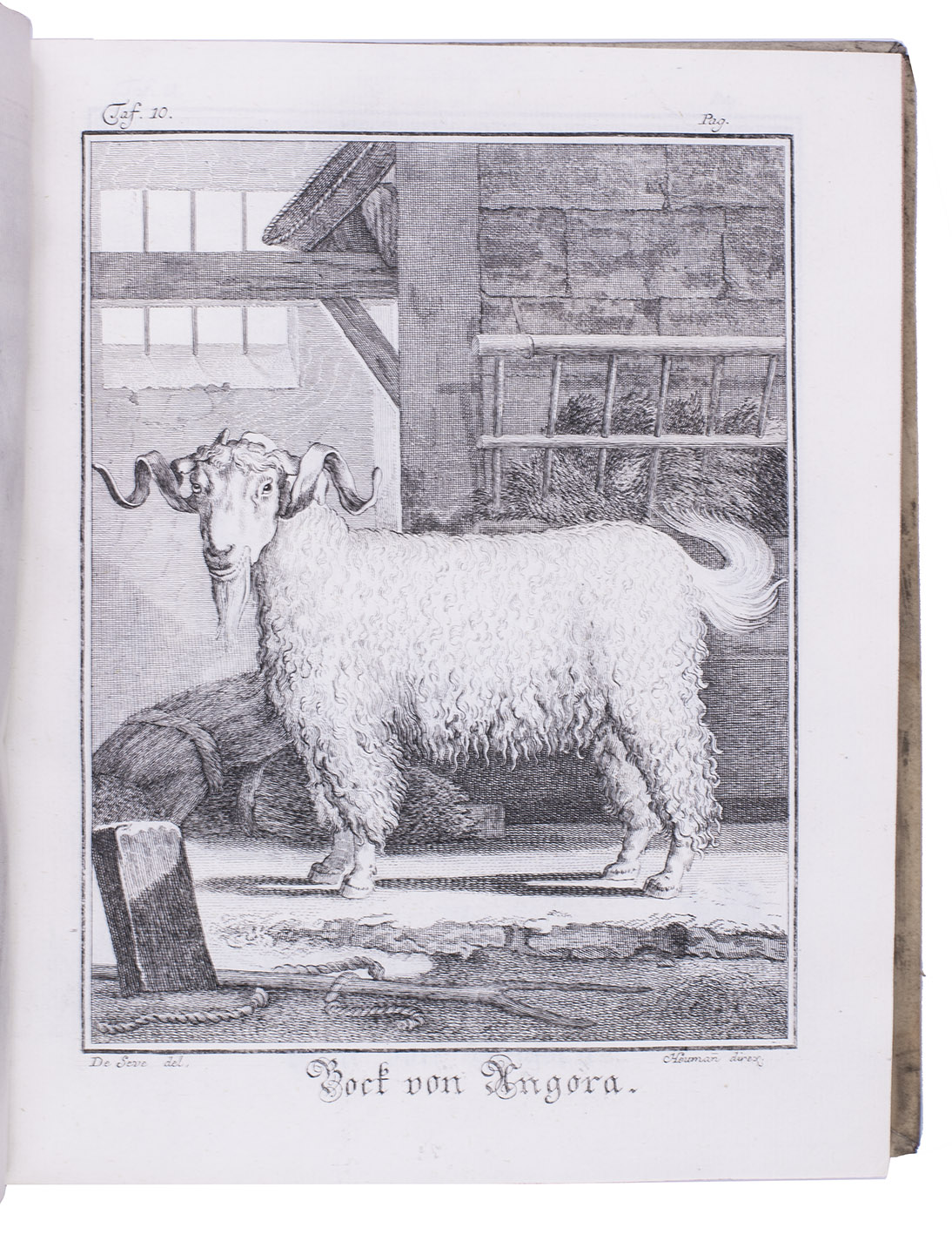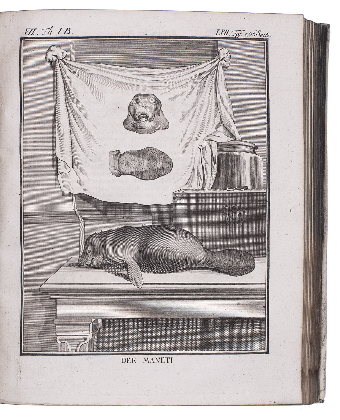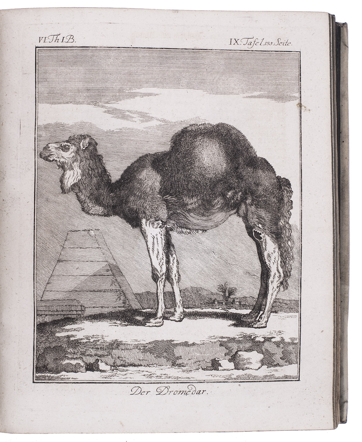 Very rare first edition of the German translation of Buffon's famous Histoire naturelle. Buffon's work presents ''for the first time a complete survey of natural history in popular form'' (PMM). The first volume contains Buffon's theoretical essays, including his essay on the earth where "for the first time he outlines a satisfactory account of the history of our globe and of its development as a fitting home for living things. In his view the earth had been originally part of the sun which was broken off by the impact of a comet. It gradually condensed from its gaseous state, and the forces shaping its continents and mountains are still active'' (PMM). This view of the universe not in a steady state but evolving was a revolutionary idea at the time, paving the way for Darwin in the following century. In his treatise on humans (volume II.1), Buffon ''studied the human species by the same methods that he applied to animal species, including the psychological, moral, and intellectual life of man. From his exhaustive research for the Histoire naturelle des quadrupèdes, Buffon came to the conclusion that it was necessary to reintroduce the notion of family. Breaking with the spirit of his time, Buffon attempted to separate science from metaphysical and religious ideas. As a disciple of Locke he denied idealistic metaphysics, stating that mental abstractions can never become principles of either existence or real knowledge; these can come only as the results of sensation'' (DSB). Volumes II-VIII deal with quadrupeds. The German edition was begun in 1750 but discontinued after the three volumes on ornithology in 1782 (not included here), while the original French, which had started in 1749, continued till 1804 and comprised eventually 44 volumes.