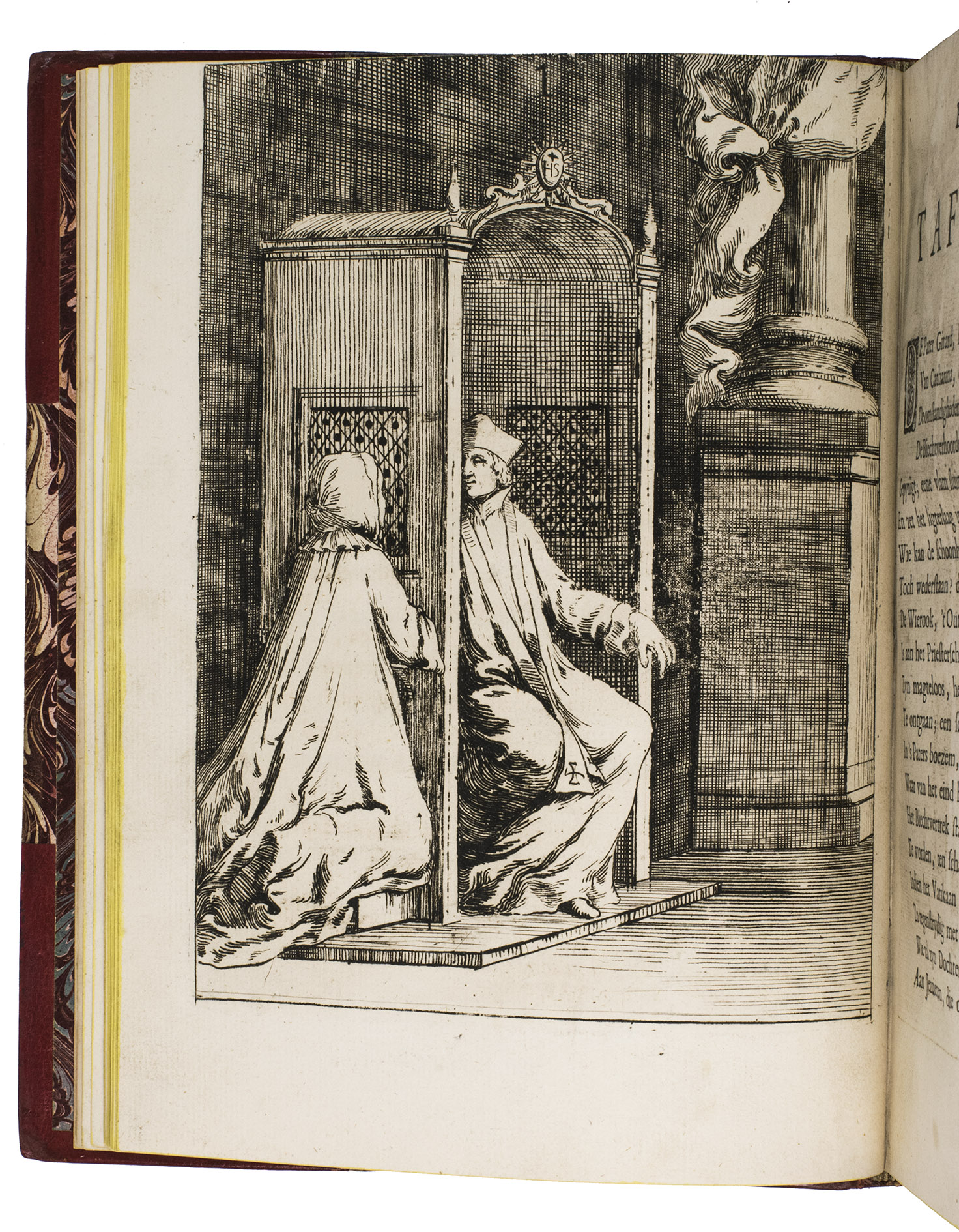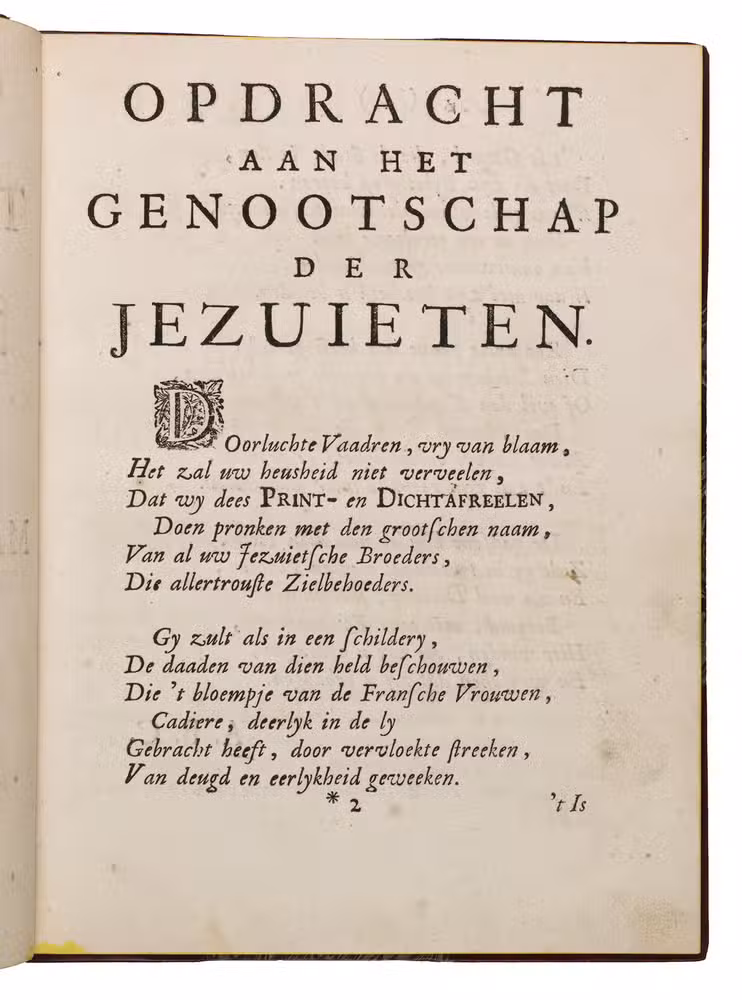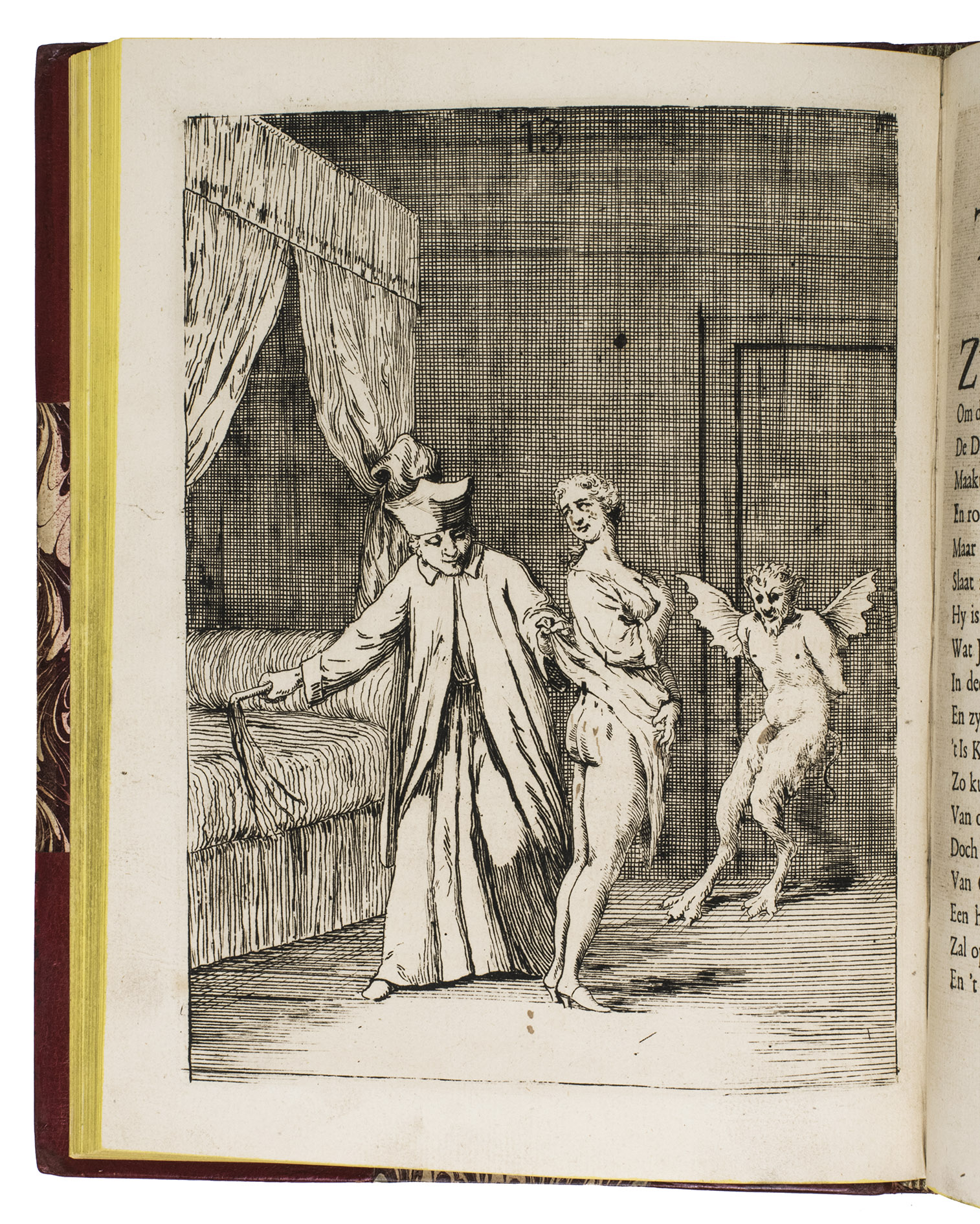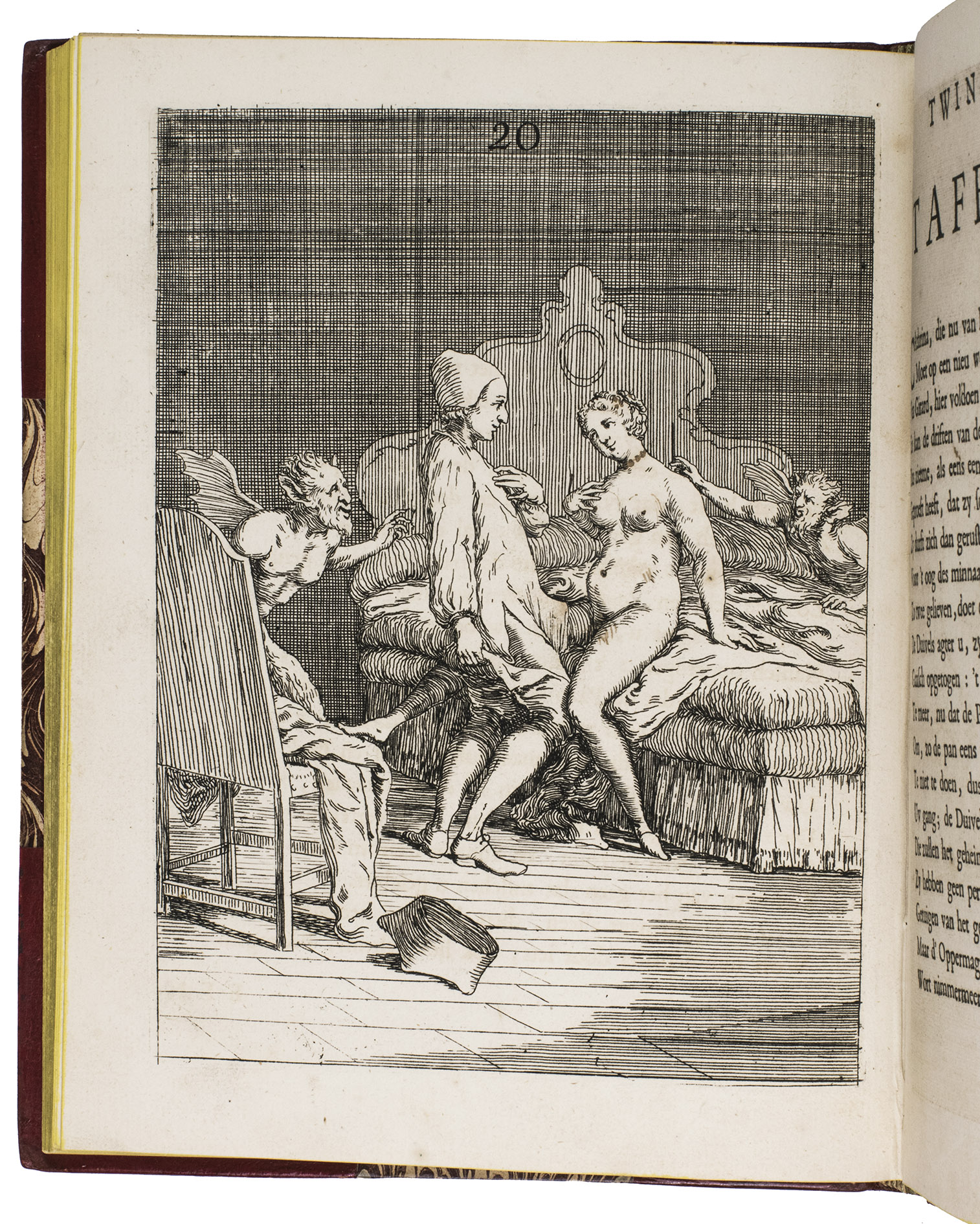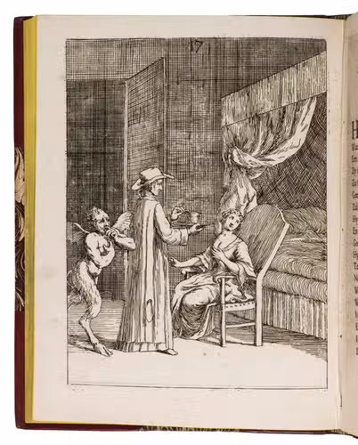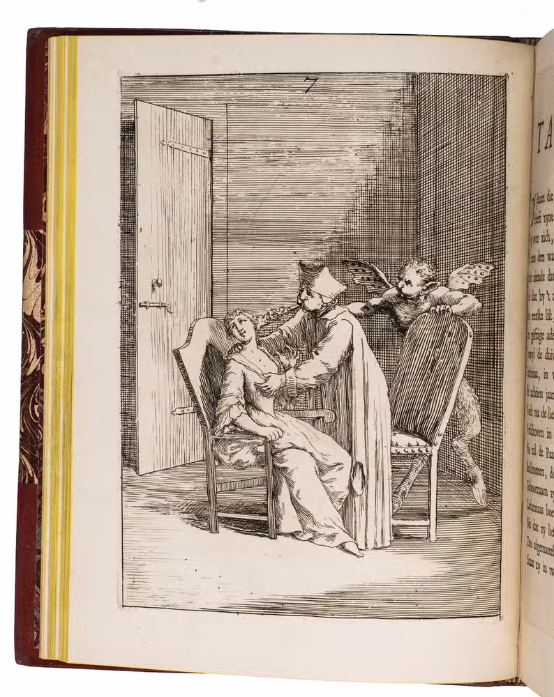 Attractive copy of a very rare erotic print series concerning the notorious case of the Jesuit Jean-Baptiste Girard and Catherine Cadière, which inspired the 1748 French novel Thérèse philosophe: an icon of 18th-century libertinism. The series was issued (simultaneously?) in French with letterpress title: Histoire du pere Jean Baptiste Girard ... et de la damoiselle Marie Caterine Cadière, but without the accompanying anti-Catholic verses and prose introduction of the present edition in Dutch. The occasionally very graphic prints show some of the accusations such as flagellation and kissing the "stigma" (ulcer) below her left breast. Most scenes include one or more demons or angels.